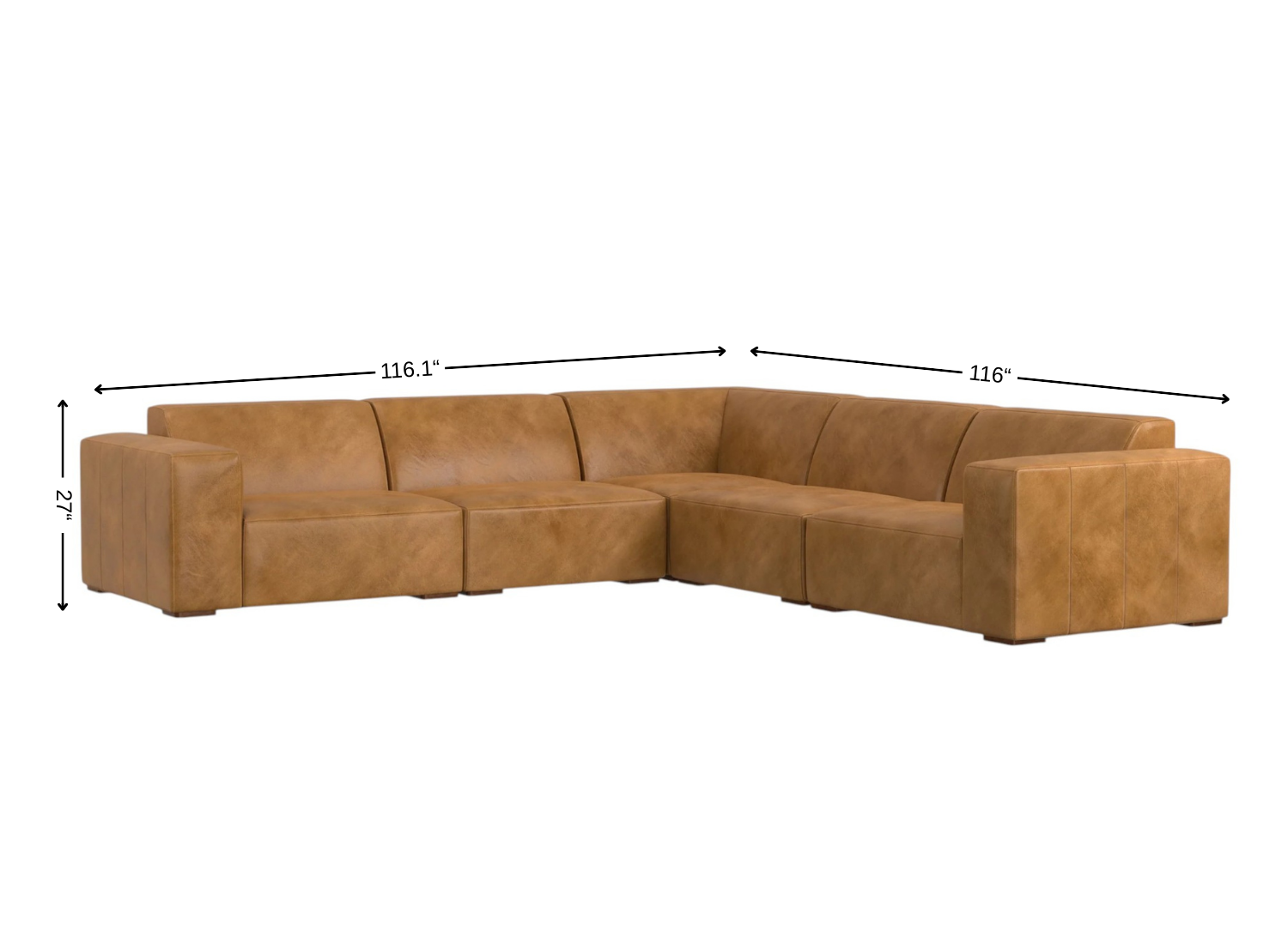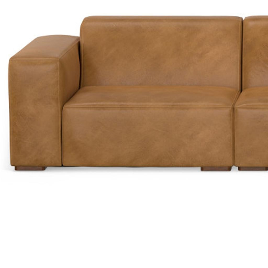 Superior construction from fabulously soft and high grade leather gives this 116-inch sienna leather modular sofa with brown legs a leg up on the competition. The premium leather used makes your lounging luxuriously comfortable and adds an elegant appeal to your space. Solid colors give you lots of decorative options and are easy to work into your decor scheme. Web suspension construction gives this piece strong support and makes it comfortable to sit even for long periods of time. Fixed arms offer a comfy place to rest. A great showpiece for your room, this sofa is a must have. 27.00-inch h x 116.10-inch w x 116.00-inch d.
