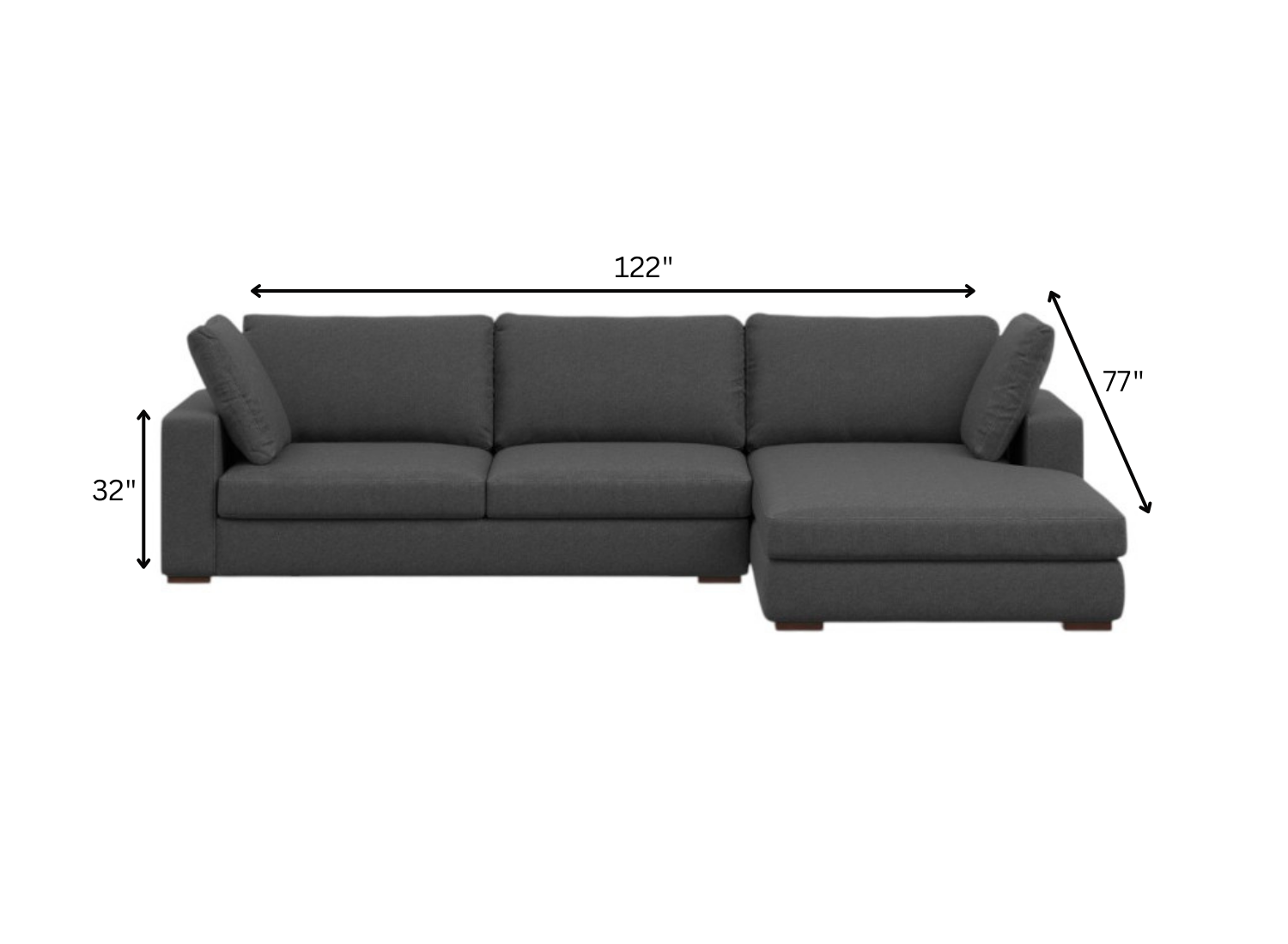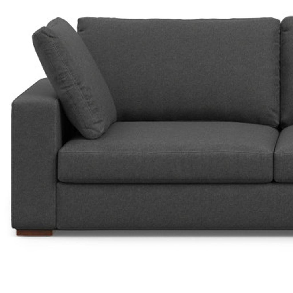 Designed for comfort and good looks, this 122-inch gray fabric sofa with brown legs is a great option to anchor your space. Solid colors give you lots of decorative options and are easy to work into your decor scheme. Web suspension construction gives this piece strong support and makes it comfortable to sit even for long periods of time. Fixed arms offer a comfy place to rest. A great showpiece for your room, this sofa is a must have. 32.00-inch h x 122.00-inch w x 77.00-inch d.