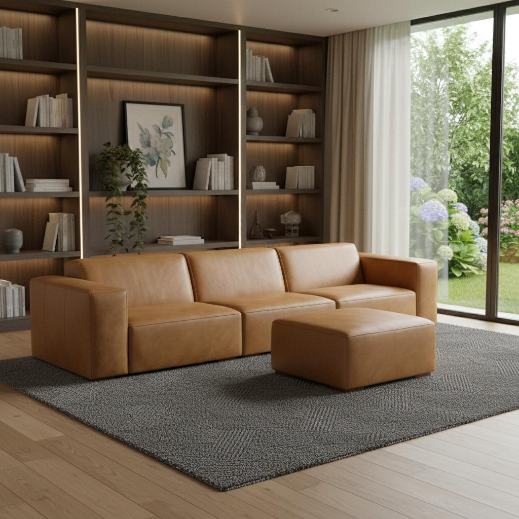 An interior designer's dream, this buttery soft high grade leather 122-inch sienna leather sofa with ottoman with brown legs will bring just the right touch to your space. The premium leather used makes your lounging luxuriously comfortable and adds an elegant appeal to your space. Solid colors give you lots of decorative options and are easy to work into your decor scheme. Web suspension construction gives this piece strong support and makes it comfortable to sit even for long periods of time. Comes complete with a coordinating ottoman to rest your feet. The ottoman can also be used as additional seating option if needed. Fixed arms offer a comfy place to rest. Built to last, this sofa will be a great centerpiece for your room. 27.00-inch h x 122.00-inch w x 38.00-inch d.