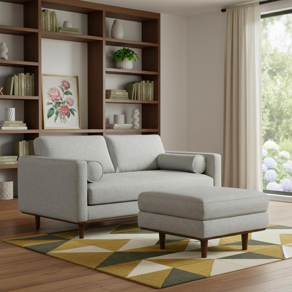 Designed for comfort and good looks, this 72-inch gray fabric sofa with ottoman with brown legs is a great option to anchor your space. Solid colors give you lots of decorative options and are easy to work into your decor scheme. Web suspension construction gives this piece strong support and makes it comfortable to sit even for long periods of time. Removable back cushions make this sofa easy to manage. A comfy ottoman is included as part of the package. Great to rest your feet or provide extra seating in a pinch. Fixed arms offer a comfy place to rest. A great showpiece for your room, this sofa is a must have. 34.00-inch h x 72.00-inch w x 38.20-inch d.
