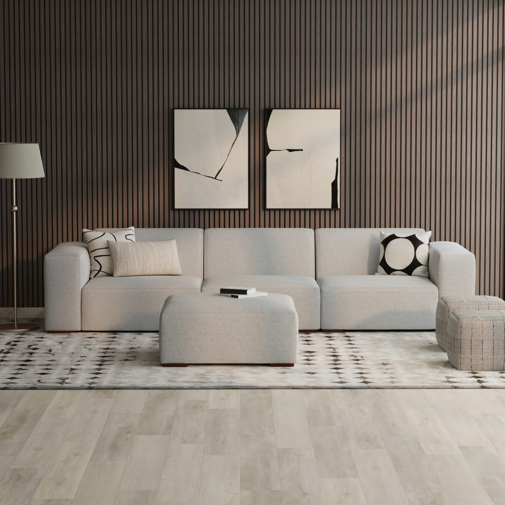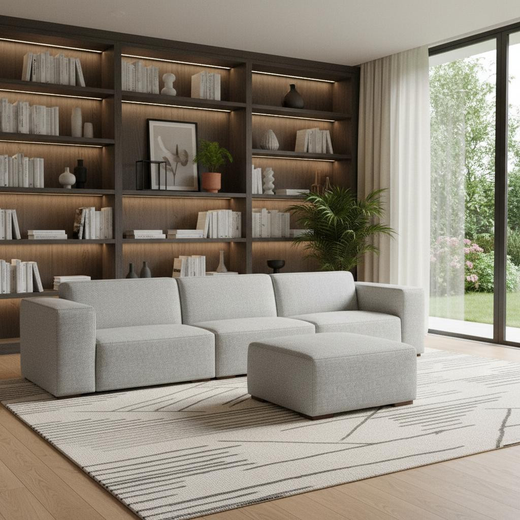 Transform your home's interior with this luxurious 122-inch gray fabric sofa with ottoman with brown legs. Solid colors give you lots of decorative options and are easy to work into your decor scheme. Web suspension construction gives this piece strong support and makes it comfortable to sit even for long periods of time. A comfy ottoman is included as part of the package. Great to rest your feet or provide extra seating in a pinch. Fixed arms offer a comfy place to rest. A great showpiece for your room, this sofa is a must have. 27.00-inch h x 122.00-inch w x 38.00-inch d.