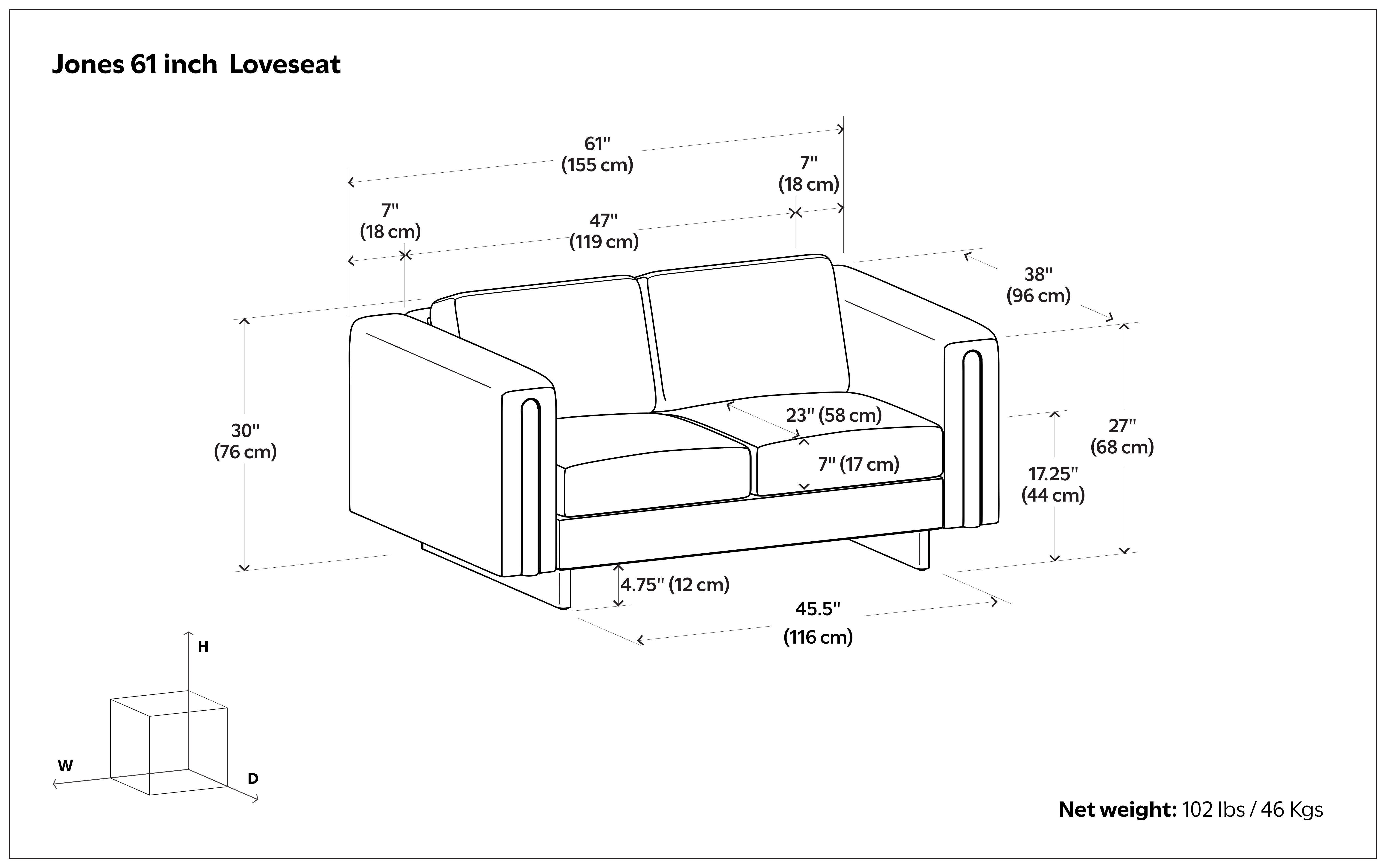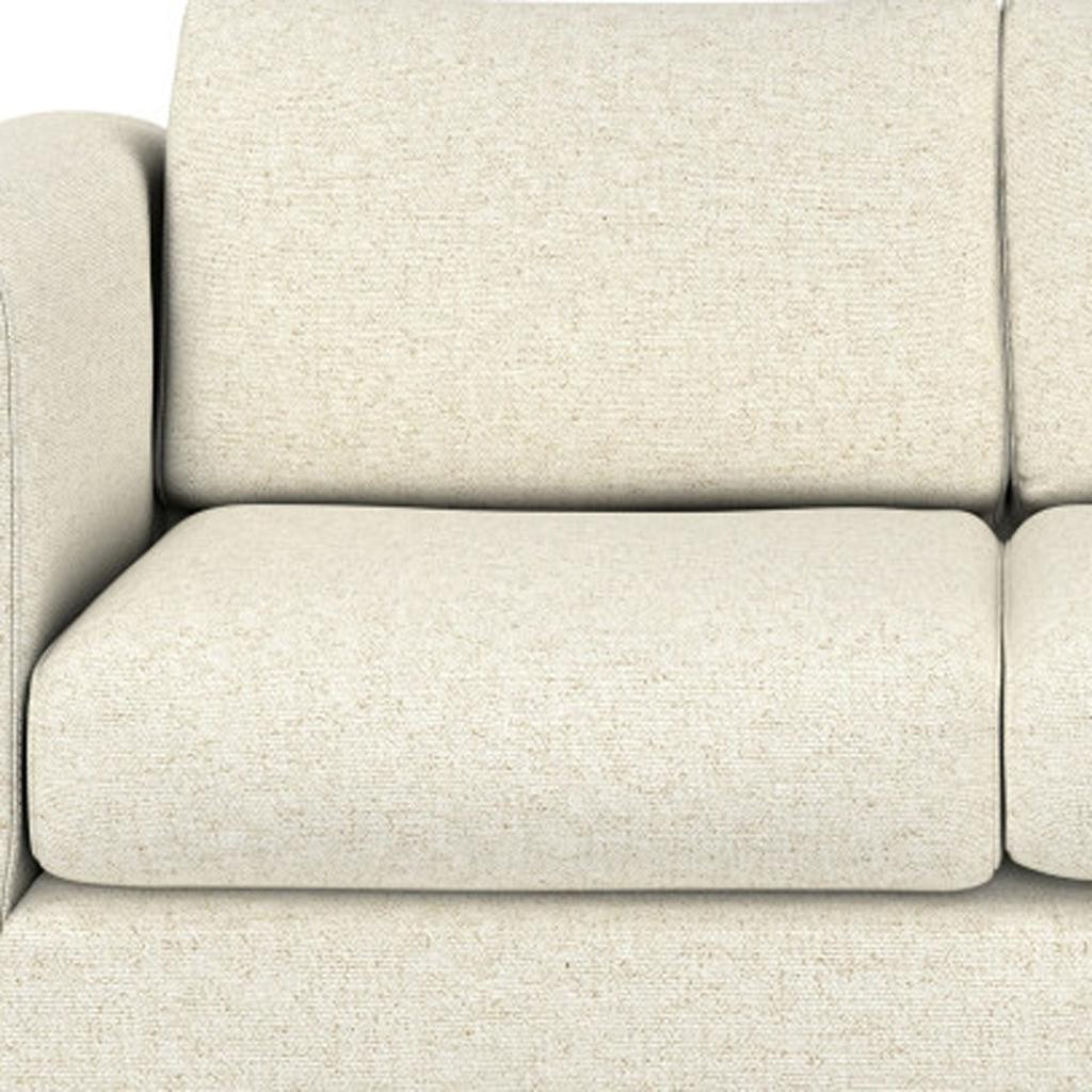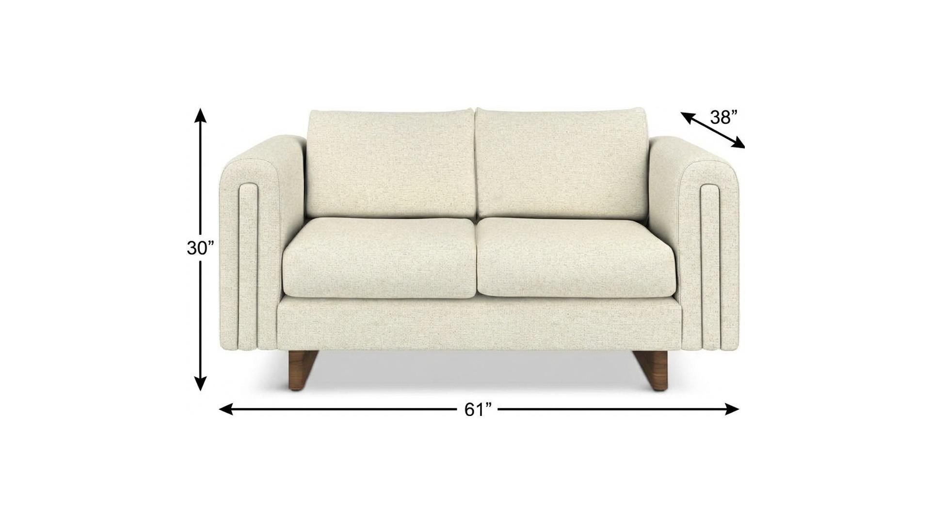 Designed for comfort and good looks, this 61-inch ivory fabric sofa with walnut legs is a great option to anchor your space. Solid colors give you lots of decorative options and are easy to work into your decor scheme. Web suspension construction gives this piece strong support and makes it comfortable to sit even for long periods of time. Removable back cushions make this sofa easy to manage. Fixed arms offer a comfy place to rest. Walnut solid wood legs effortlessly elevate the room and add a touch of contemporary design. Built to last, this sofa will be a great centerpiece for your room. 30.00-inch h x 61.00-inch w x 38.00-inch d.