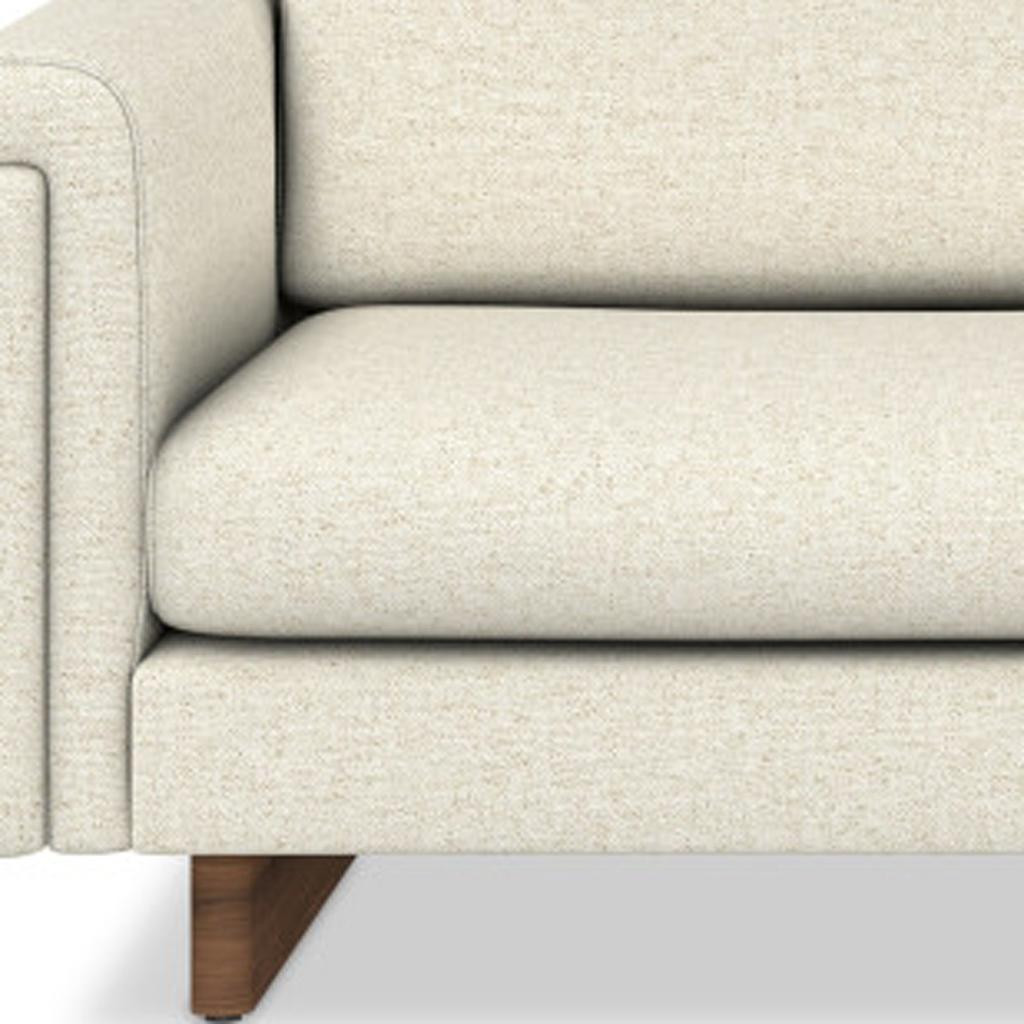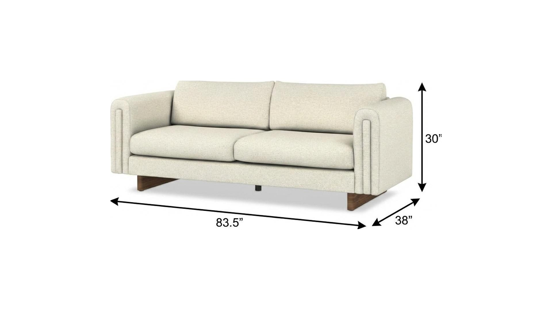 Designed for comfort and good looks, this 84-inch ivory fabric sofa with walnut legs is a great option to anchor your space. Solid colors give you lots of decorative options and are easy to work into your decor scheme. Web suspension construction gives this piece strong support and makes it comfortable to sit even for long periods of time. Removable back cushions make this sofa easy to manage. Fixed arms offer a comfy place to rest. Walnut solid wood legs effortlessly elevate the room and add a touch of contemporary design. Built to last, this sofa will be a great centerpiece for your room. 30.00-inch h x 83.50-inch w x 38.00-inch d.