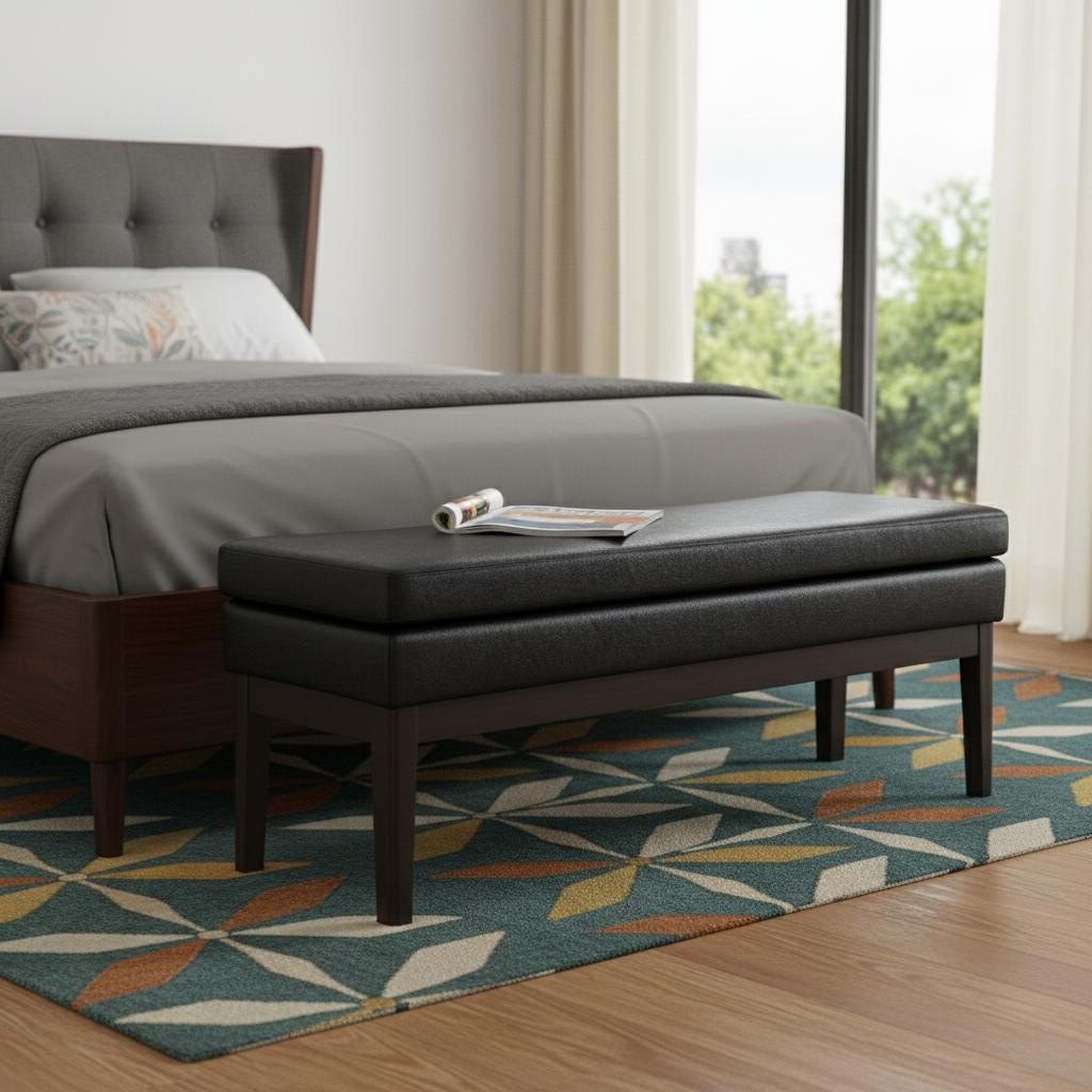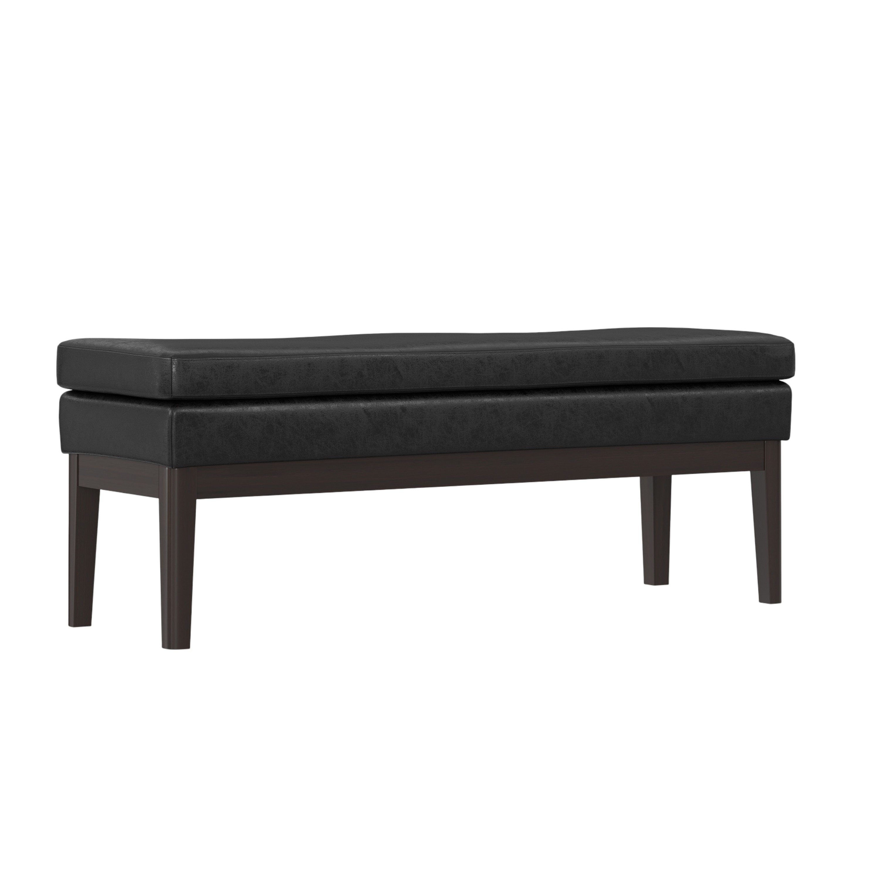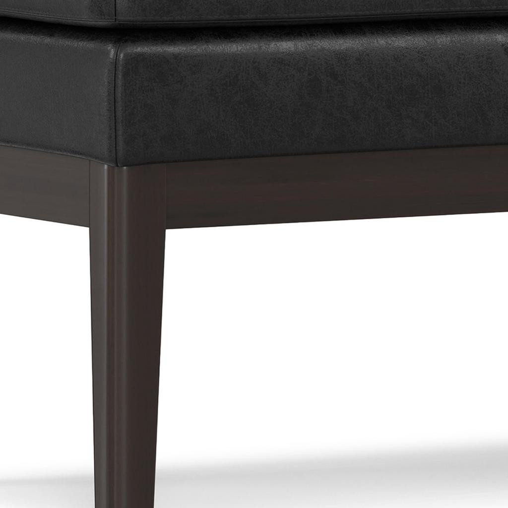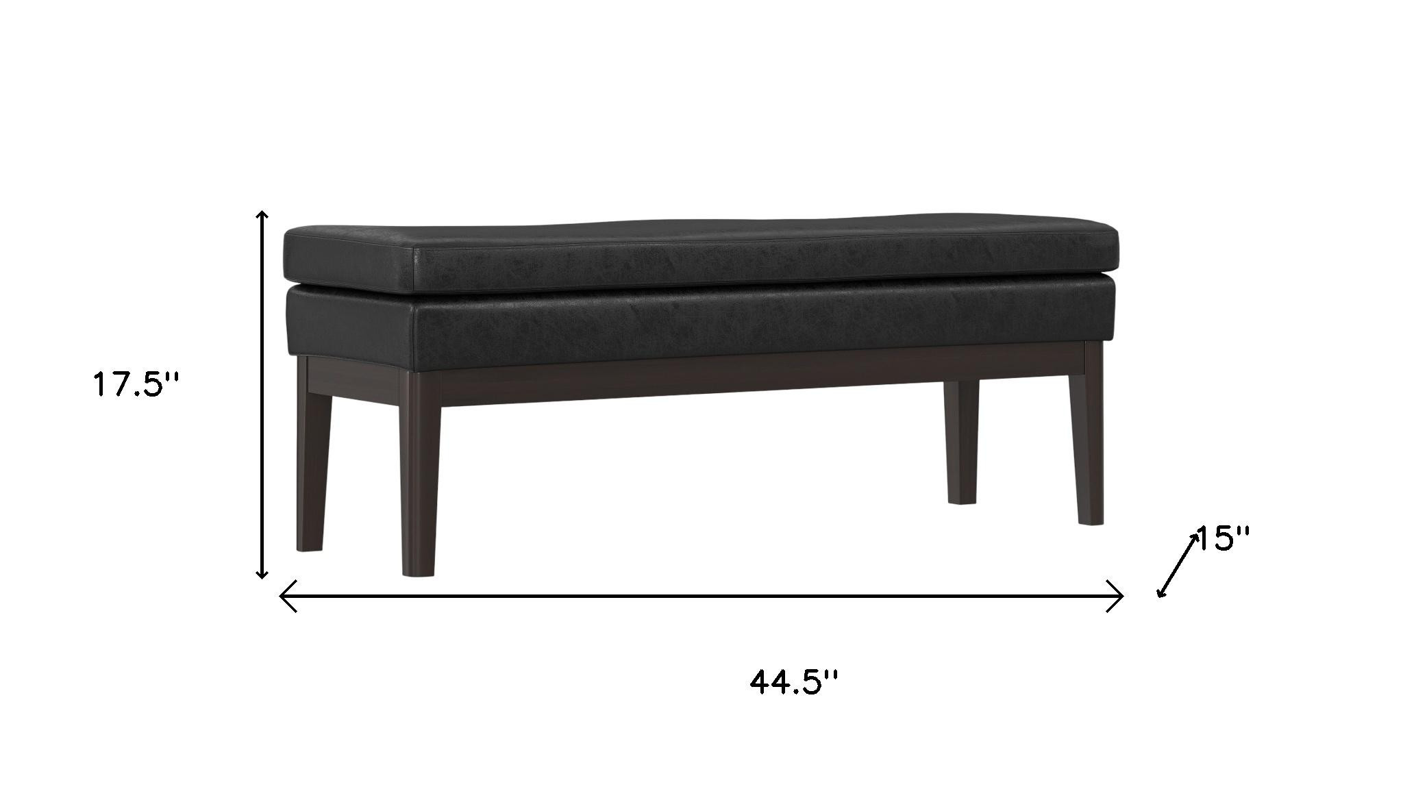 Optimize your space and add some charm to your room with the 45-inch black and walnut leather ottoman. The upholstery top of this ottoman is a nice contrast to the upholstery material. Expertly upholstered with padding in a soft solid color leather, this ottoman is as comfortable as it is good looking. Easy to blend into most any room, a ottoman is a way to add a good looking accent to your space that can also be practical and useful. 17.50-inch h x 44.50-inch w x 15.00-inch d.