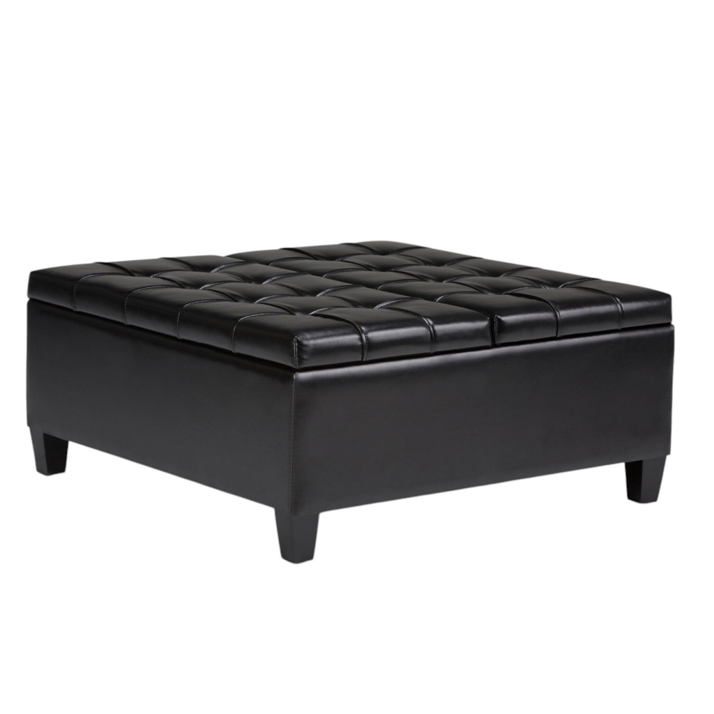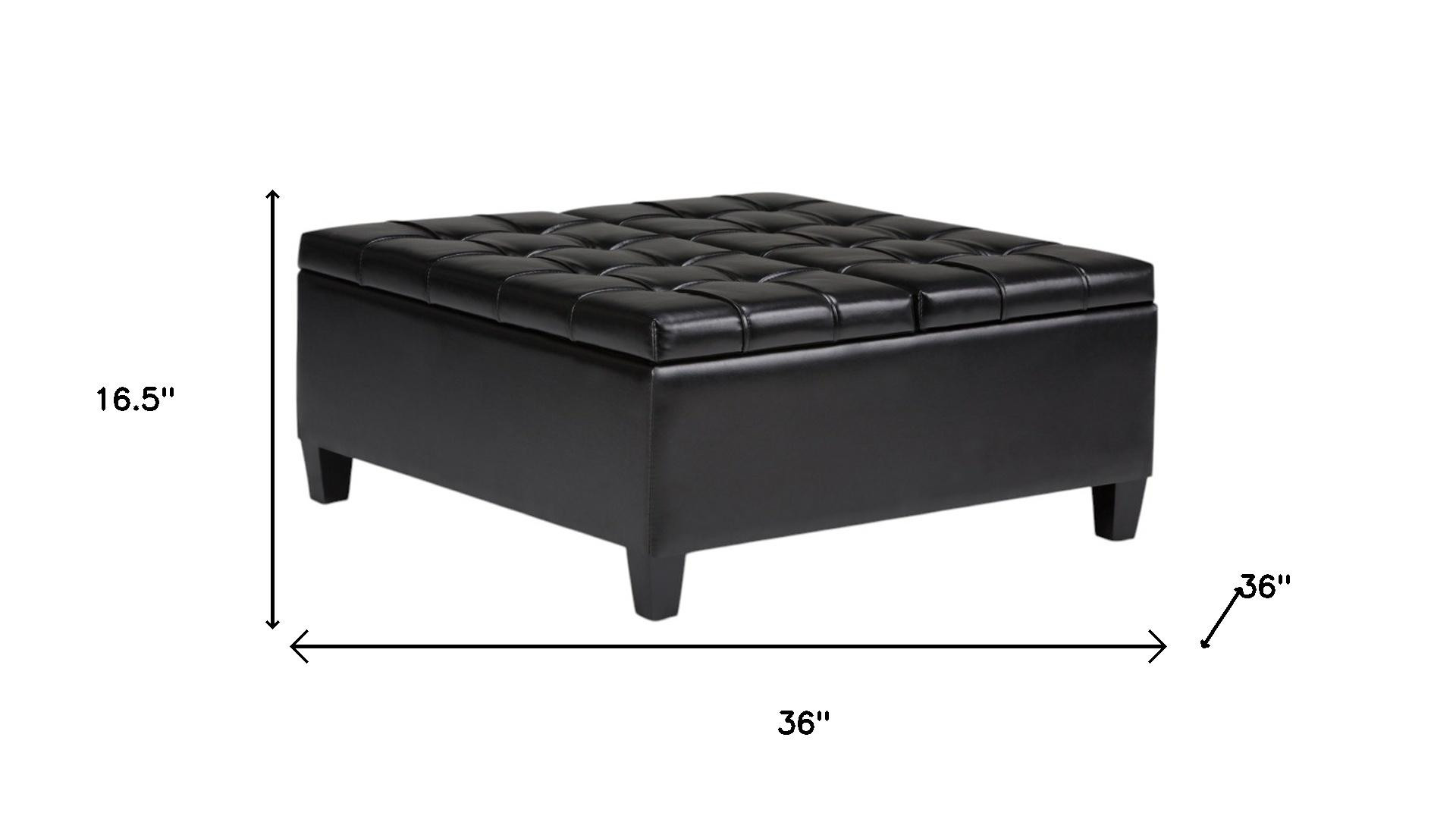 Practicality and fashion mix together with this handy 36-inch black and espresso leather cocktail ottoman with storage. This chic cocktail ottoman is larger in size and designed to serve as a make-shift coffee table during parties. The surface is wide and flat which is not only suitable for a footrest or seat but also ready to hold trays of appetizers, drinks, or desserts. The upholstery top of this ottoman is a nice contrast to the upholstery material. Expertly upholstered with padding in a soft solid color leather, this ottoman is as comfortable as it is good looking. Easy to blend into most any room, a ottoman is a way to add a good looking accent to your space that can also be practical and useful. 16.50-inch h x 36.00-inch w x 36.00-inch d.