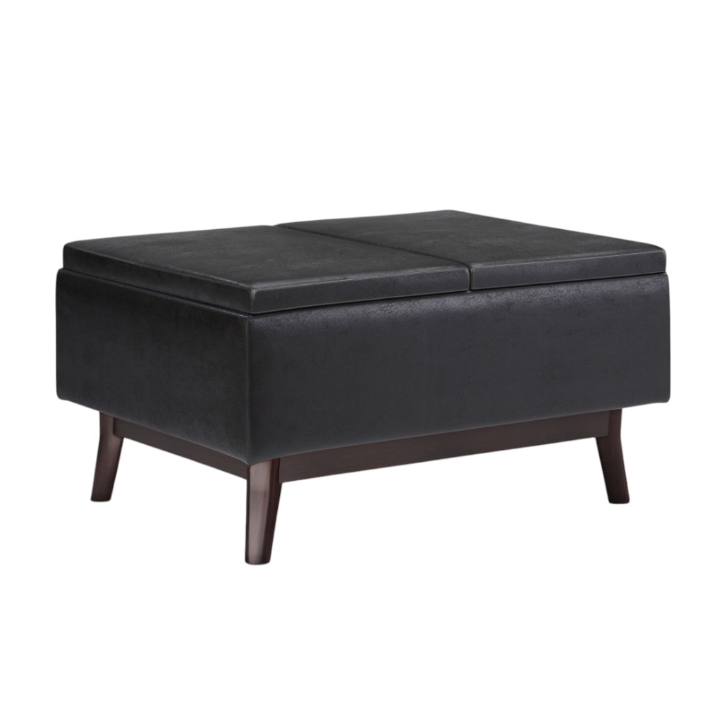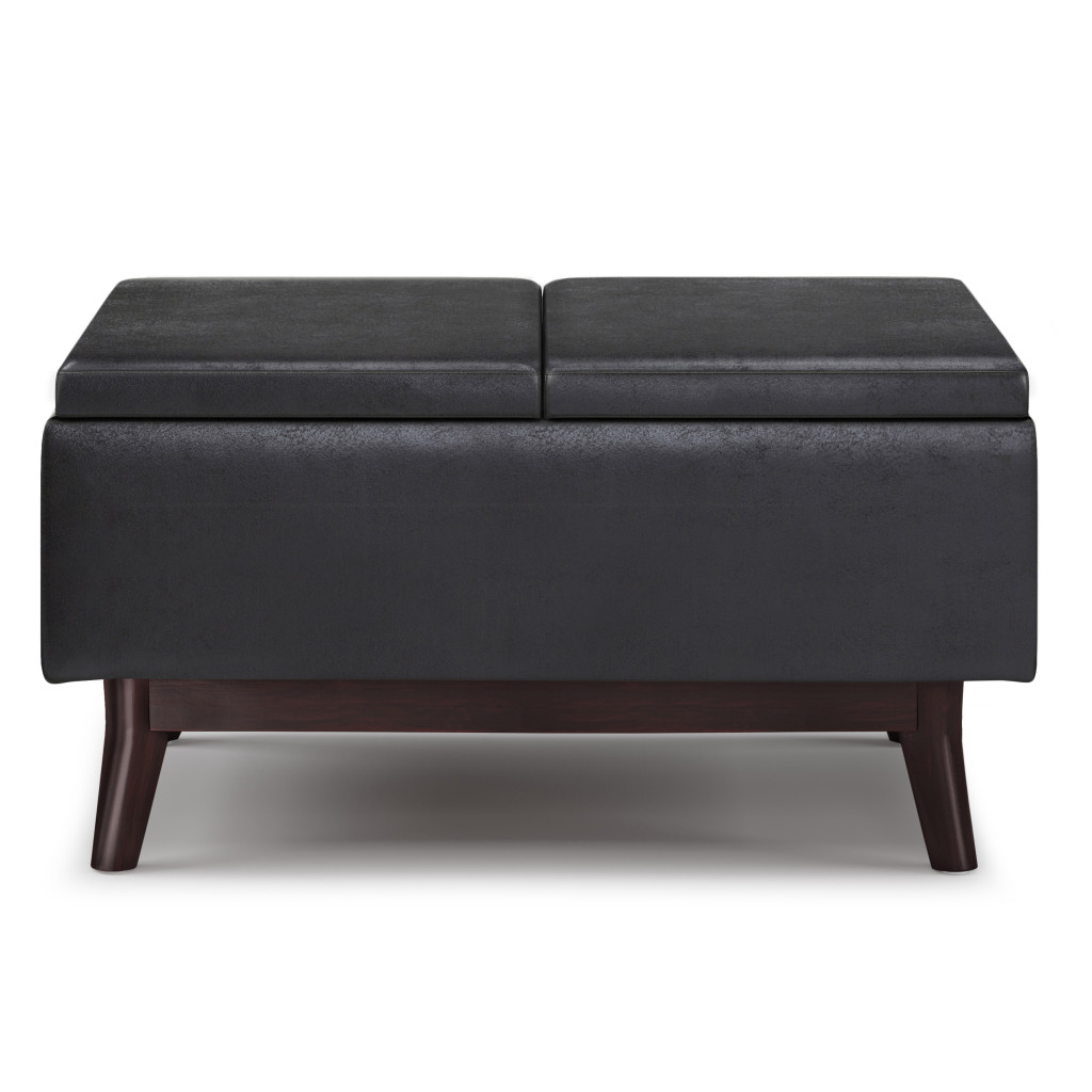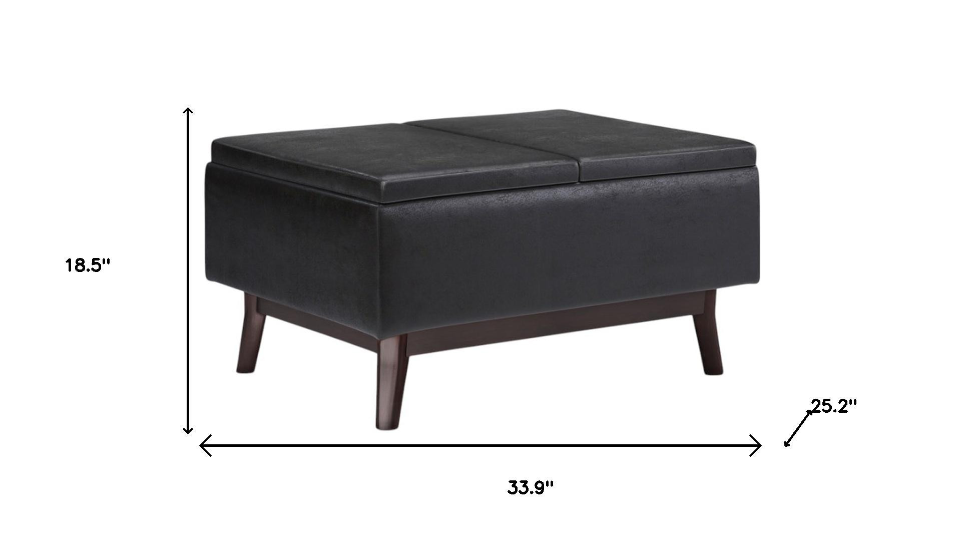 Optimize your space and add some charm to your room with the 34-inch black and dark brown leather cocktail ottoman with storage. This chic cocktail ottoman is larger in size and designed to serve as a make-shift coffee table during parties. The surface is wide and flat which is not only suitable for a footrest or seat but also ready to hold trays of appetizers, drinks, or desserts. The upholstery top of this ottoman is a nice contrast to the upholstery material. The purposefully distressed finish gives this versatile ottoman an authentically rustic feel. Expertly upholstered with padding in a soft solid color leather, this ottoman is as comfortable as it is good looking. This multi-function ottoman features a cubby area in addition to seating to help keep your space neat and tidy. Easy to blend into most any room, a ottoman is a way to add a good looking accent to your space that can also be practical and useful. 18.50-inch h x 33.90-inch w x 25.20-inch d.