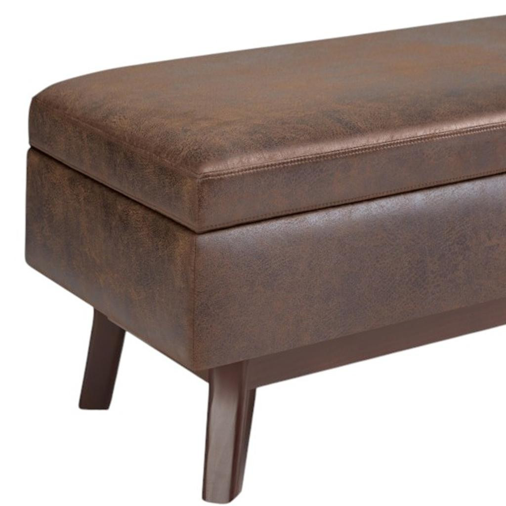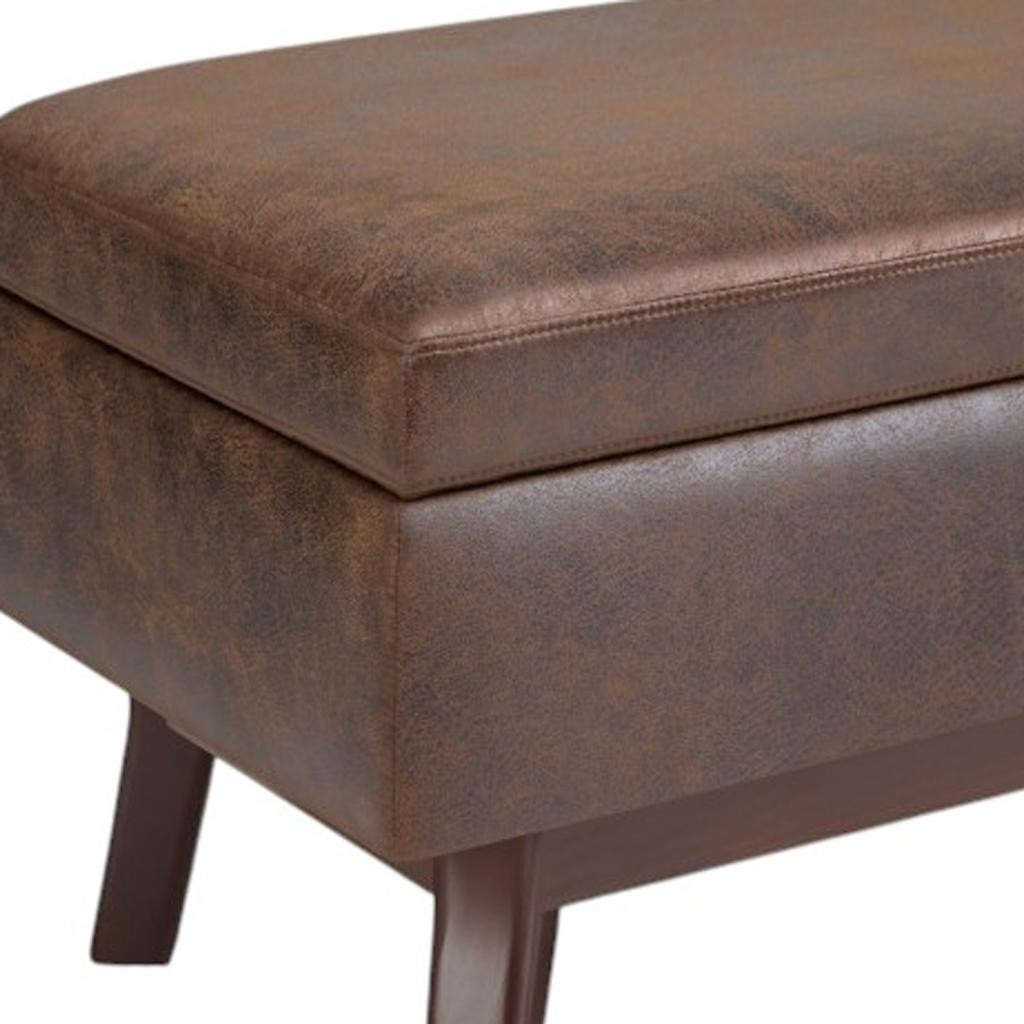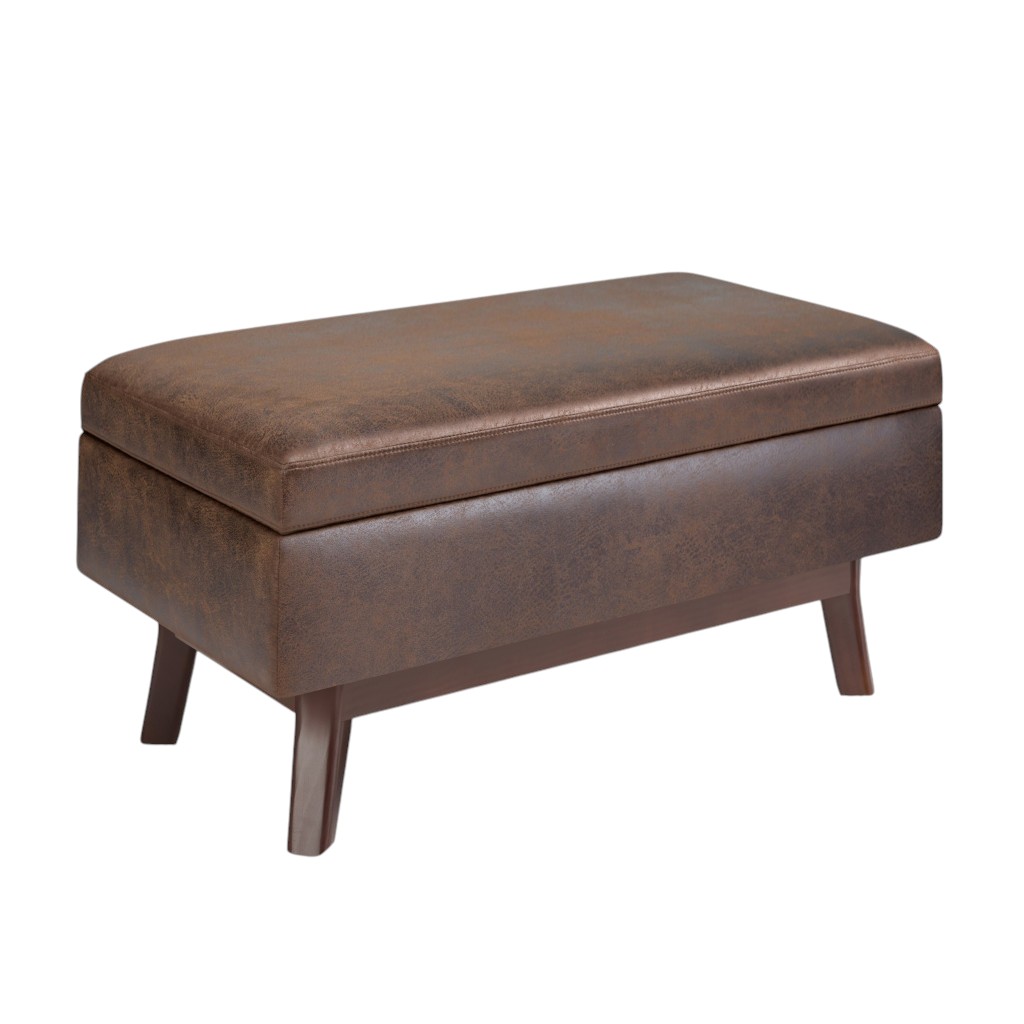 Practicality and fashion mix together with this handy 36-inch brown leather cocktail ottoman with storage. This chic cocktail ottoman is larger in size and designed to serve as a make-shift coffee table during parties. The surface is wide and flat which is not only suitable for a footrest or seat but also ready to hold trays of appetizers, drinks, or desserts. The upholstery top of this ottoman is a nice contrast to the upholstery material. A brown monotone coloration gives this solid wood and upholstery ottoman a fresh and updated look. Complete with a purposefully distressed finish, this ottoman has an aged, vintage, and rustic feel. Expertly upholstered with padding in a soft solid color leather, this ottoman is as comfortable as it is good looking. Ottomans are multi-functional additions to your space that add fashion and practical value. 18.50-inch h x 36.20-inch w x 18.10-inch d.