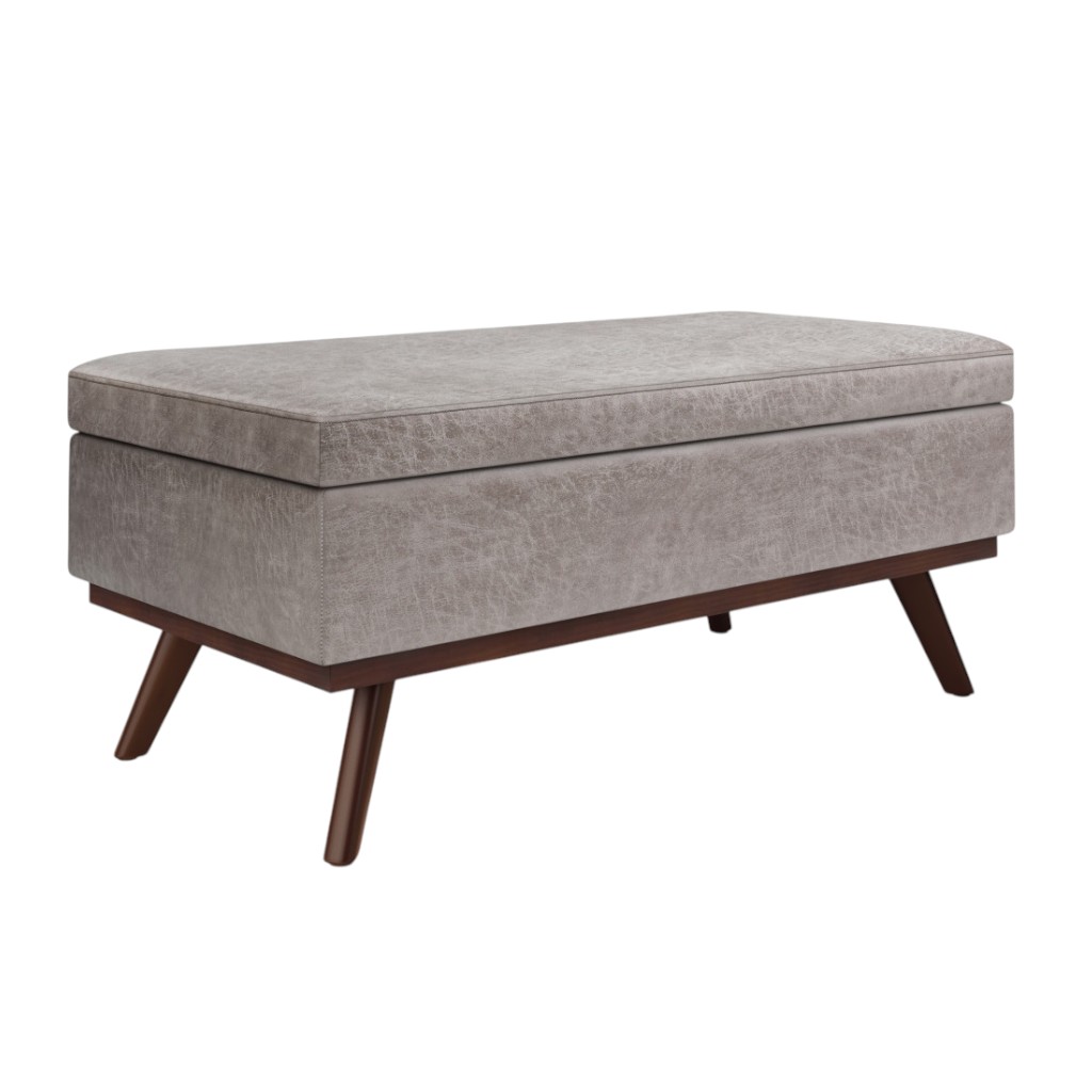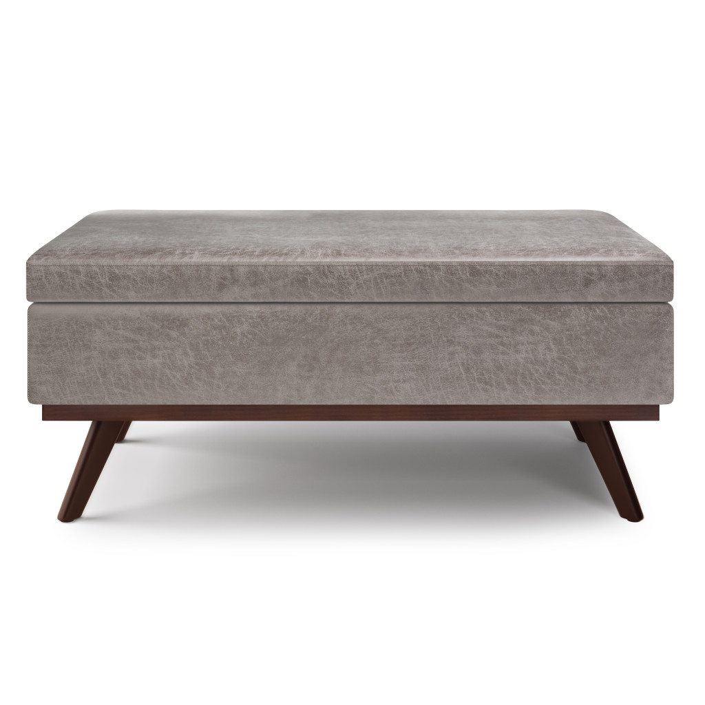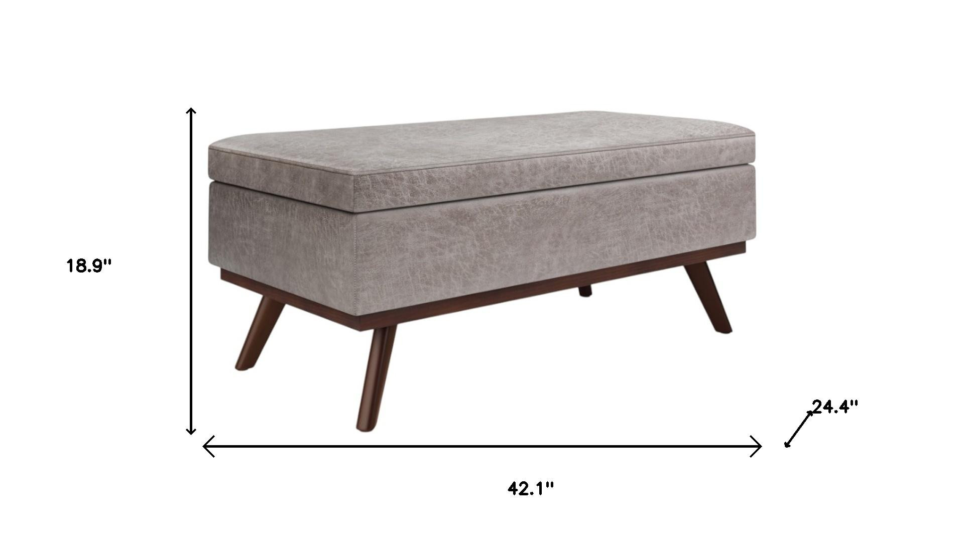 Practicality and fashion mix together with this handy 42-inch gray and brown leather cocktail ottoman with storage. This chic cocktail ottoman is larger in size and designed to serve as a make-shift coffee table during parties. The surface is wide and flat which is not only suitable for a footrest or seat but also ready to hold trays of appetizers, drinks, or desserts. The upholstery top of this ottoman is a nice contrast to the upholstery material. The purposefully distressed finish gives this versatile ottoman an authentically rustic feel. Expertly upholstered with padding in a soft solid color leather, this ottoman is as comfortable as it is good looking. Ottomans are multi-functional additions to your space that add fashion and practical value. 18.90-inch h x 42.10-inch w x 24.40-inch d.