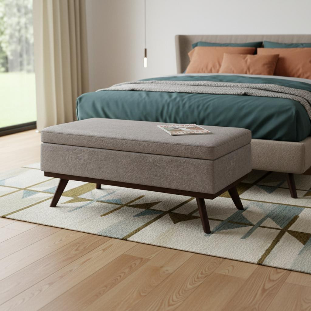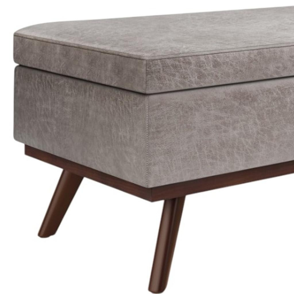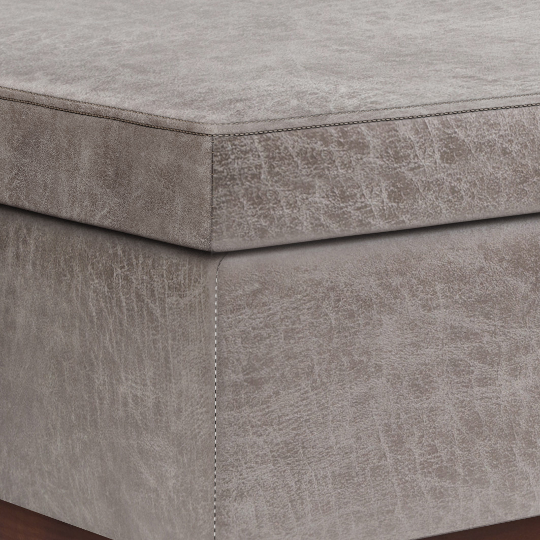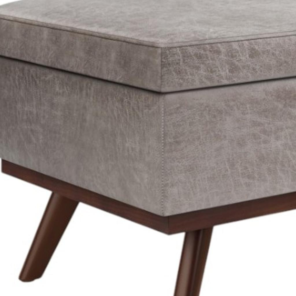 Practicality and fashion mix together with this handy 42-inch gray and brown leather cocktail ottoman with storage. This chic cocktail ottoman is larger in size and designed to serve as a make-shift coffee table during parties. The surface is wide and flat which is not only suitable for a footrest or seat but also ready to hold trays of appetizers, drinks, or desserts. The upholstery top of this ottoman is a nice contrast to the upholstery material. The purposefully distressed finish gives this versatile ottoman an authentically rustic feel. Expertly upholstered with padding in a soft solid color leather, this ottoman is as comfortable as it is good looking. Ottomans are multi-functional additions to your space that add fashion and practical value. 18.90-inch h x 42.10-inch w x 24.40-inch d.