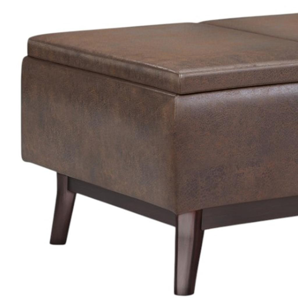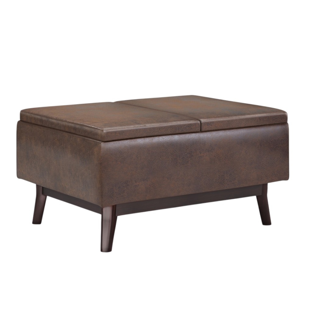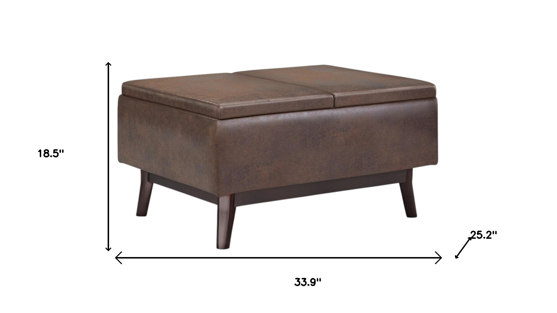 Get ready to relax with this 34-inch brown leather cocktail ottoman with storage. This chic cocktail ottoman is larger in size and designed to serve as a make-shift coffee table during parties. The surface is wide and flat which is not only suitable for a footrest or seat but also ready to hold trays of appetizers, drinks, or desserts. The upholstery top of this ottoman is a nice contrast to the upholstery material. A brown coloration runs throughout this good looking solid wood and upholstery ottoman. The purposefully distressed finish gives this versatile ottoman an authentically rustic feel. Expertly upholstered with padding in a soft solid color leather, this ottoman is as comfortable as it is good looking. This multi-function ottoman features a cubby area in addition to seating to help keep your space neat and tidy. Easy to blend into most any room, a ottoman is a way to add a good looking accent to your space that can also be practical and useful. 18.50-inch h x 33.90-inch w x 25.20-inch d.