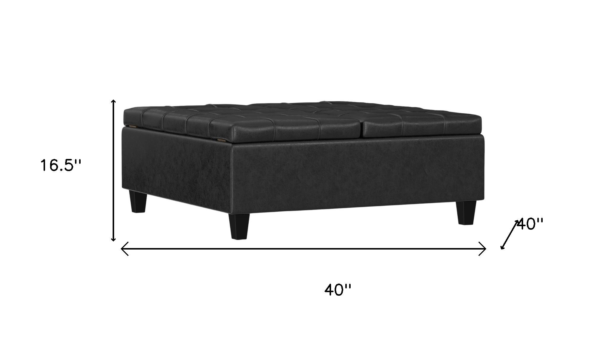 Get ready to relax with this 40-inch black leather cocktail ottoman with storage. This chic cocktail ottoman is larger in size and designed to serve as a make-shift coffee table during parties. The surface is wide and flat which is not only suitable for a footrest or seat but also ready to hold trays of appetizers, drinks, or desserts. The upholstery top of this ottoman is a nice contrast to the upholstery material. A solid black solid wood frame is finished off with a matching black upholstery seat, giving this ottoman a chic monotone look. Expertly upholstered with padding in a soft solid color leather, this ottoman is as comfortable as it is good looking. Easy to blend into most any room, a ottoman is a way to add a good looking accent to your space that can also be practical and useful. 16.50-inch h x 40.00-inch w x 40.00-inch d.