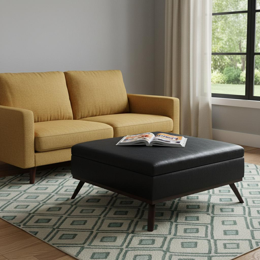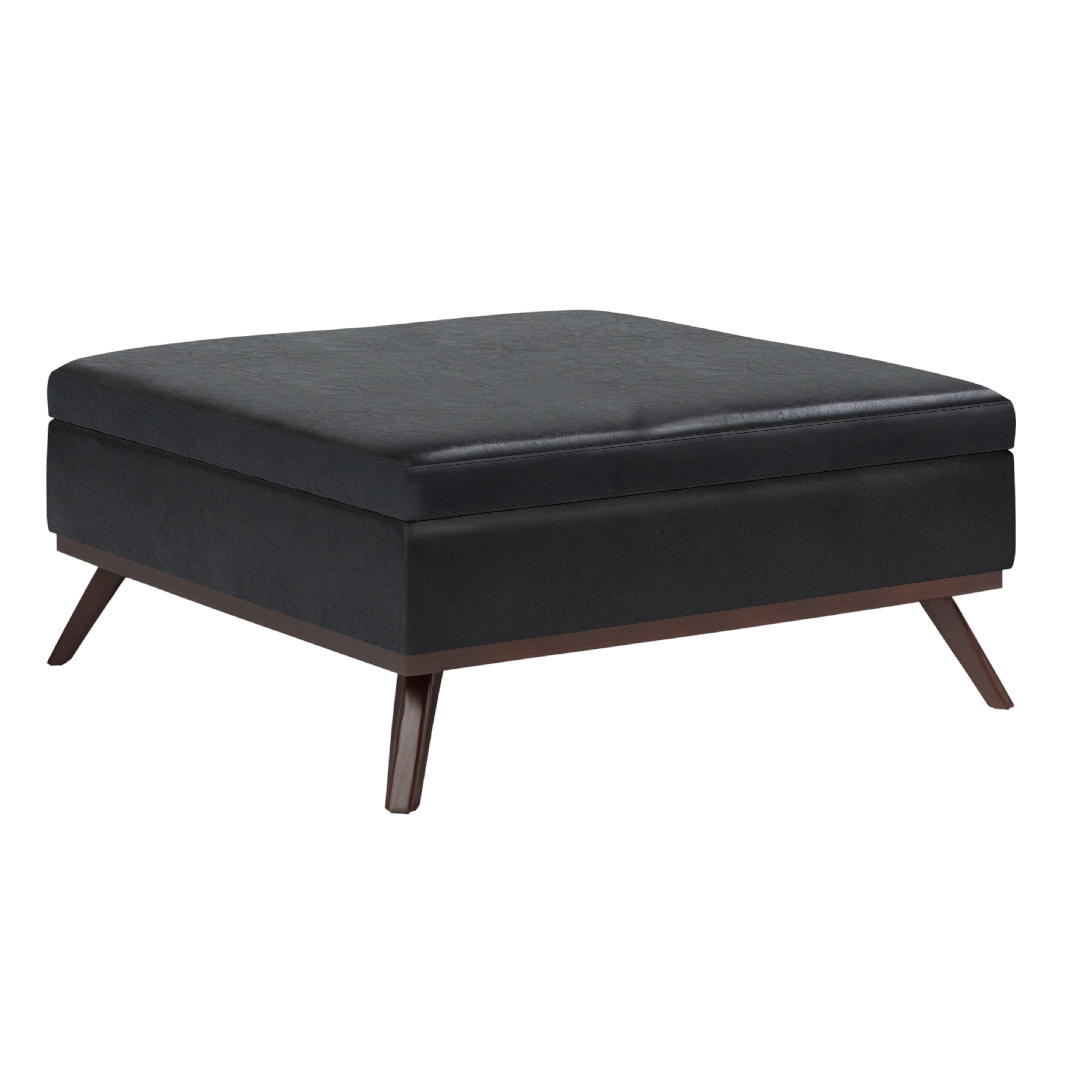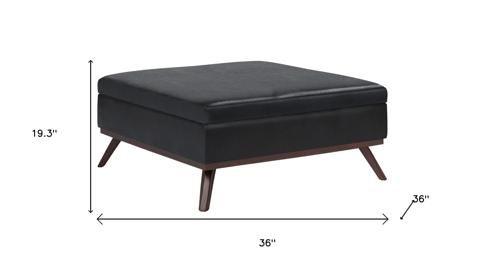 Get ready to relax with this 36-inch black and brown leather cocktail ottoman with storage. This chic cocktail ottoman is larger in size and designed to serve as a make-shift coffee table during parties. The surface is wide and flat which is not only suitable for a footrest or seat but also ready to hold trays of appetizers, drinks, or desserts. The upholstery top of this ottoman is a nice contrast to the upholstery material. Expertly upholstered with padding in a soft solid color leather, this ottoman is as comfortable as it is good looking. Ottomans are multi-functional additions to your space that add fashion and practical value. 19.30-inch h x 36.00-inch w x 36.00-inch d.