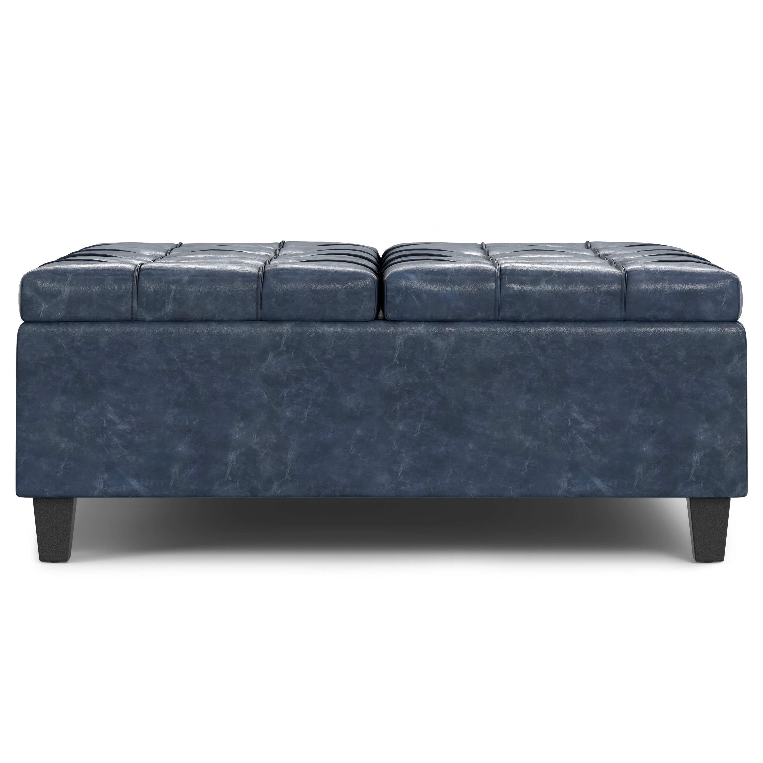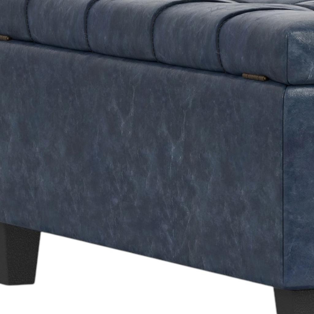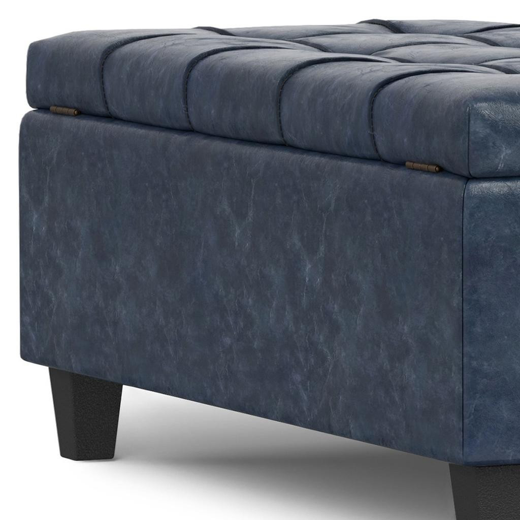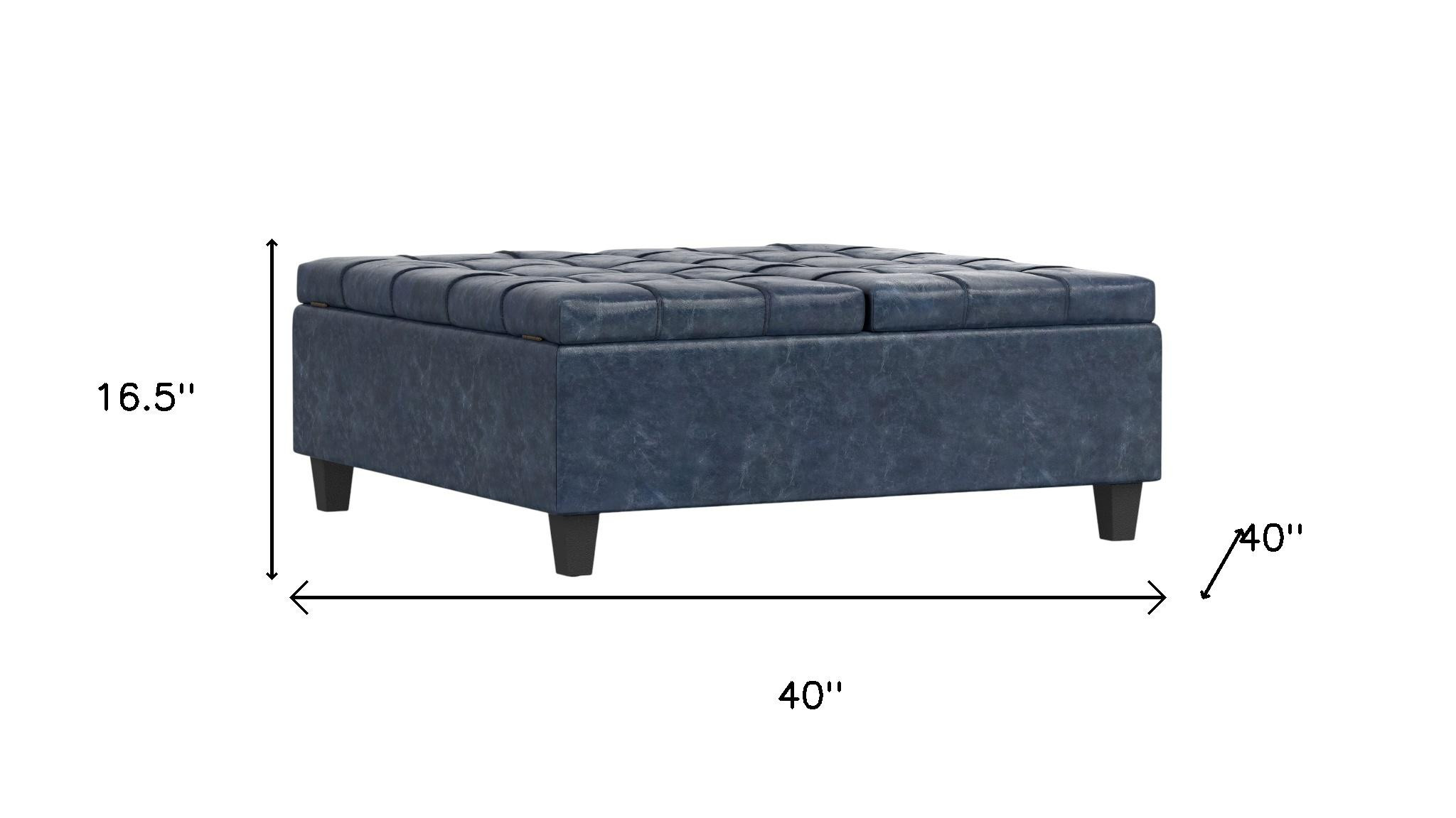 Get ready to relax with this 40-inch blue and black leather cocktail ottoman with storage. This chic cocktail ottoman is larger in size and designed to serve as a make-shift coffee table during parties. The surface is wide and flat which is not only suitable for a footrest or seat but also ready to hold trays of appetizers, drinks, or desserts. The upholstery top of this ottoman is a nice contrast to the upholstery material. Expertly upholstered with padding in a soft solid color leather, this ottoman is as comfortable as it is good looking. Easy to blend into most any room, a ottoman is a way to add a good looking accent to your space that can also be practical and useful. 16.50-inch h x 40.00-inch w x 40.00-inch d.