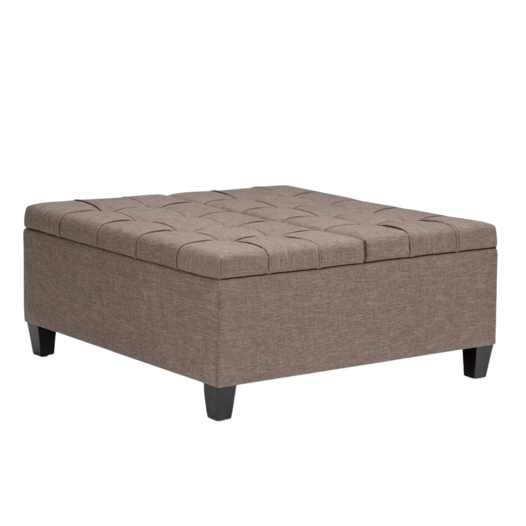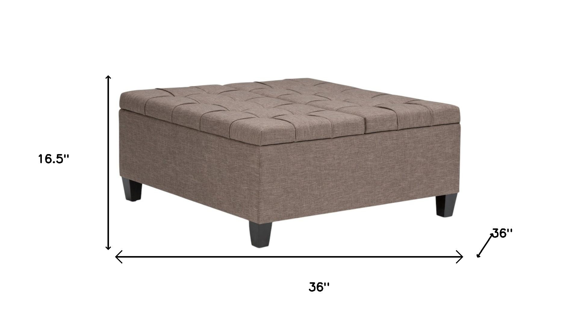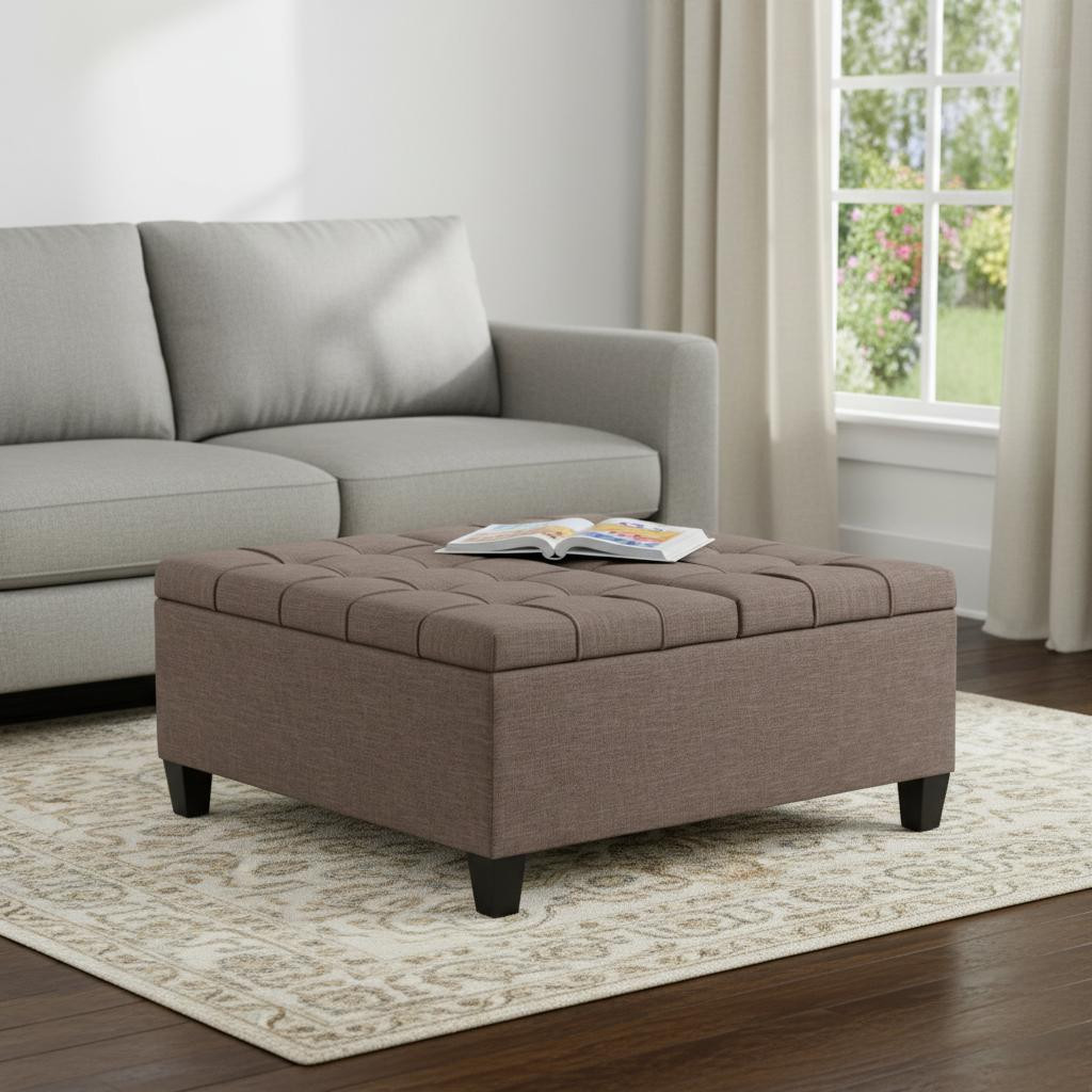 Practicality and fashion mix together with this handy 36-inch brown and espresso fabric cocktail ottoman with storage. This chic cocktail ottoman is larger in size and designed to serve as a make-shift coffee table during parties. The surface is wide and flat which is not only suitable for a footrest or seat but also ready to hold trays of appetizers, drinks, or desserts. The upholstery top of this ottoman is a nice contrast to the upholstery material. Expertly upholstered with padding in a soft solid color polyester, this ottoman is as comfortable as it is good looking. Easy to blend into most any room, a ottoman is a way to add a good looking accent to your space that can also be practical and useful. 16.50-inch h x 36.00-inch w x 36.00-inch d.