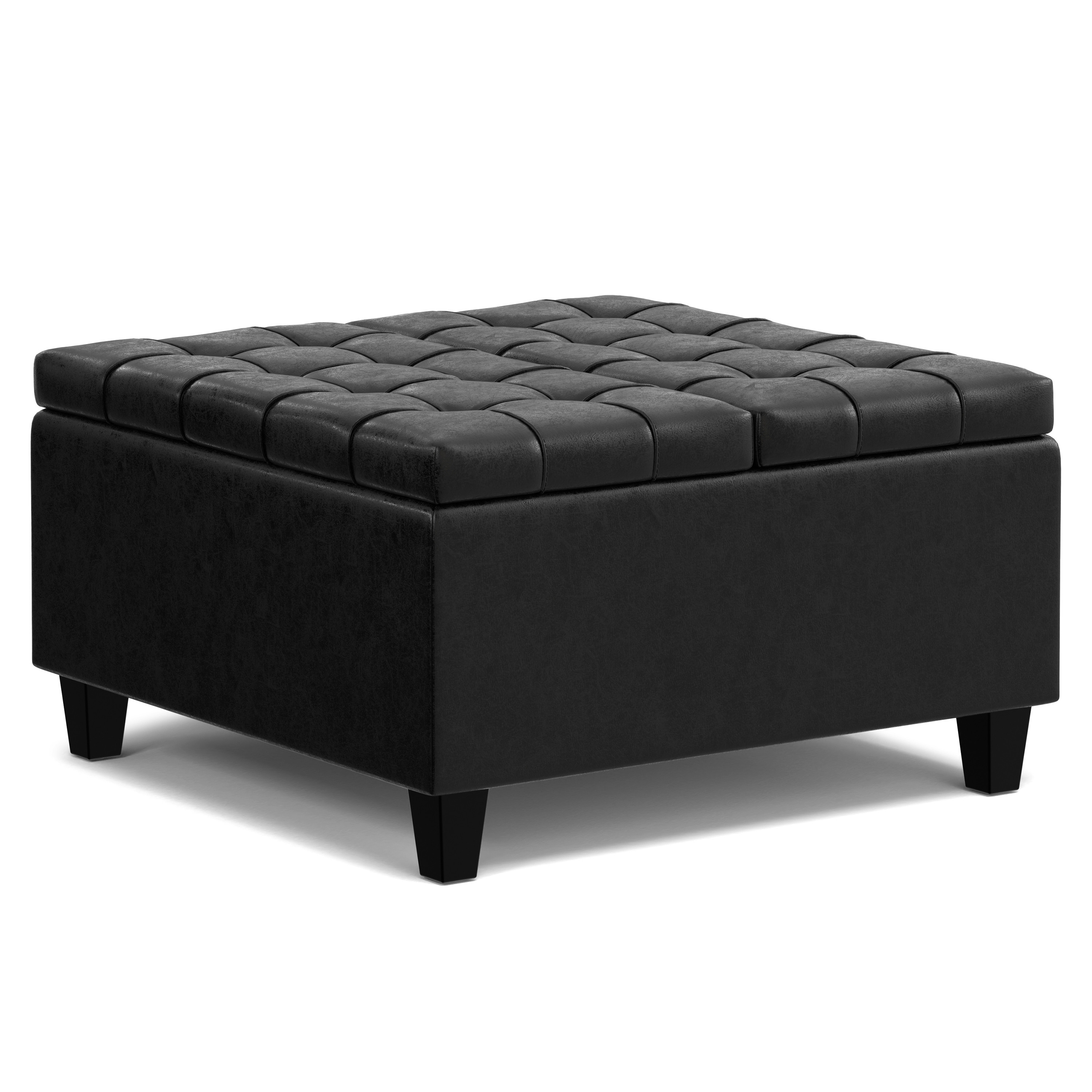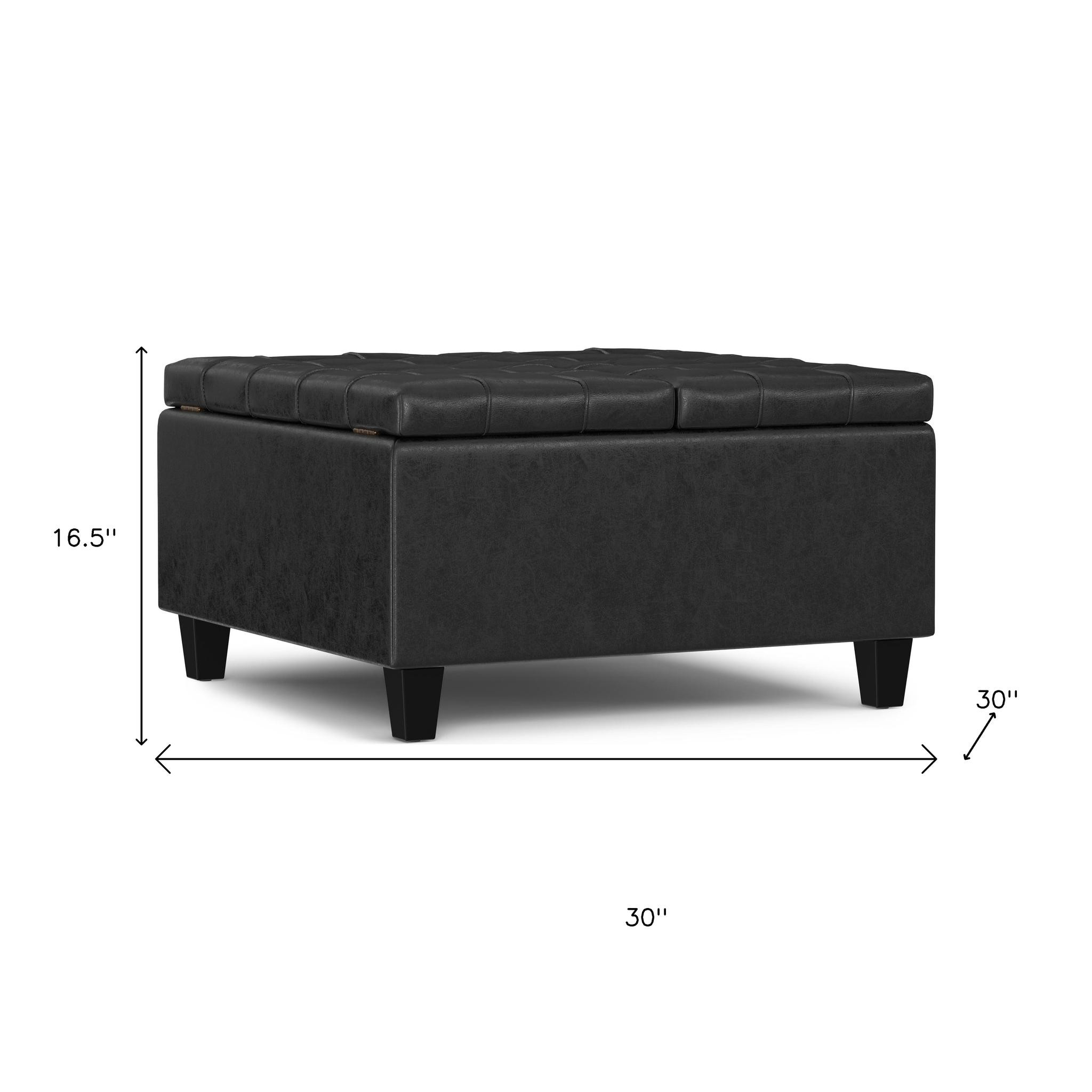 Get ready to relax with this 30-inch black leather cocktail ottoman with storage. This chic cocktail ottoman is larger in size and designed to serve as a make-shift coffee table during parties. The surface is wide and flat which is not only suitable for a footrest or seat but also ready to hold trays of appetizers, drinks, or desserts. A solid black solid wood frame is finished off with a matching black upholstery seat, giving this ottoman a chic monotone look. Expertly upholstered with padding in a soft solid color leather, this ottoman is as comfortable as it is good looking. Ottomans are multi-functional additions to your space that add fashion and practical value. 16.50-inch h x 30.00-inch w x 30.00-inch d.