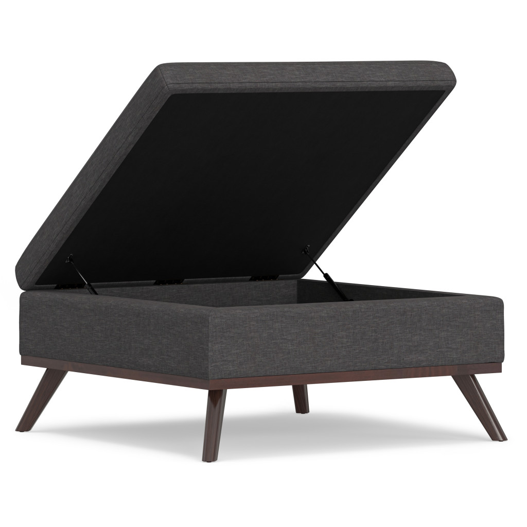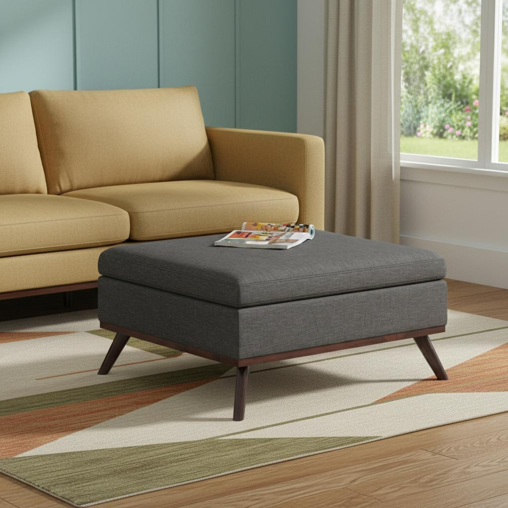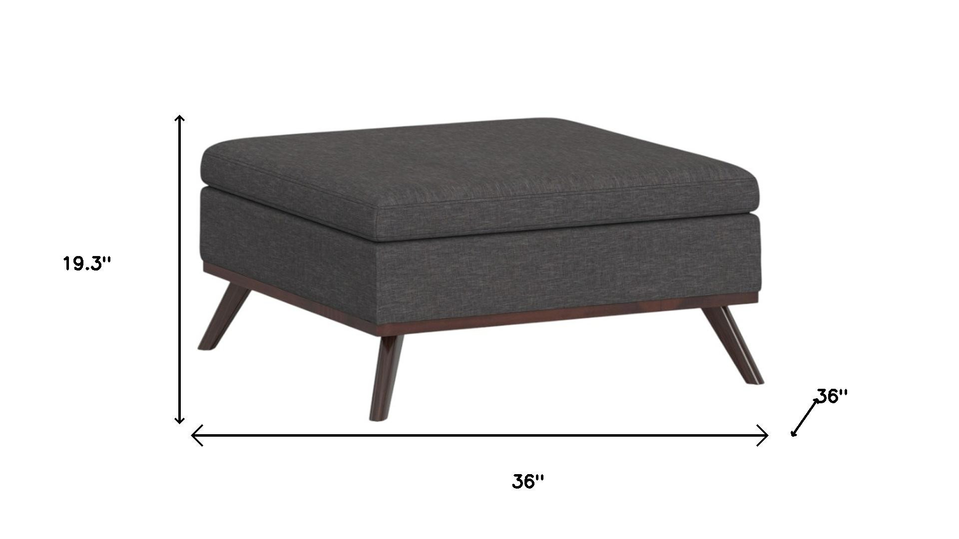 Get ready to relax with this 36-inch gray and brown linen cocktail ottoman with storage. This chic cocktail ottoman is larger in size and designed to serve as a make-shift coffee table during parties. The surface is wide and flat which is not only suitable for a footrest or seat but also ready to hold trays of appetizers, drinks, or desserts. The upholstery top of this ottoman is a nice contrast to the upholstery material. Expertly upholstered with padding in a soft solid color linen, this ottoman is as comfortable as it is good looking. Ottomans are multi-functional additions to your space that add fashion and practical value. 19.30-inch h x 36.00-inch w x 36.00-inch d.