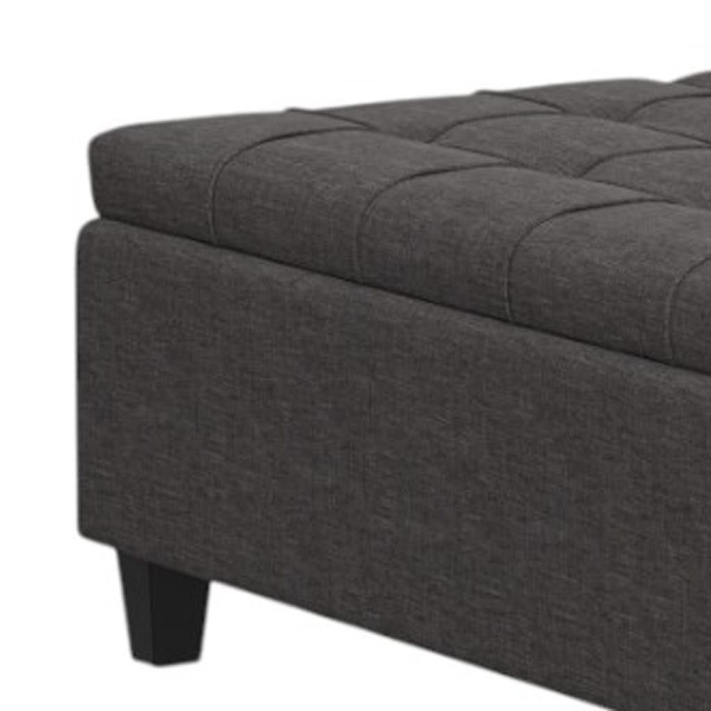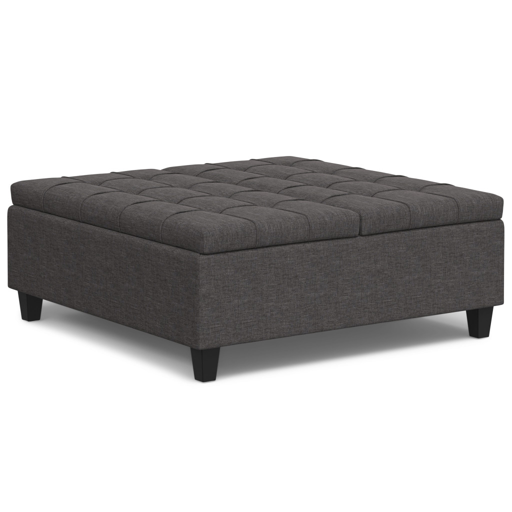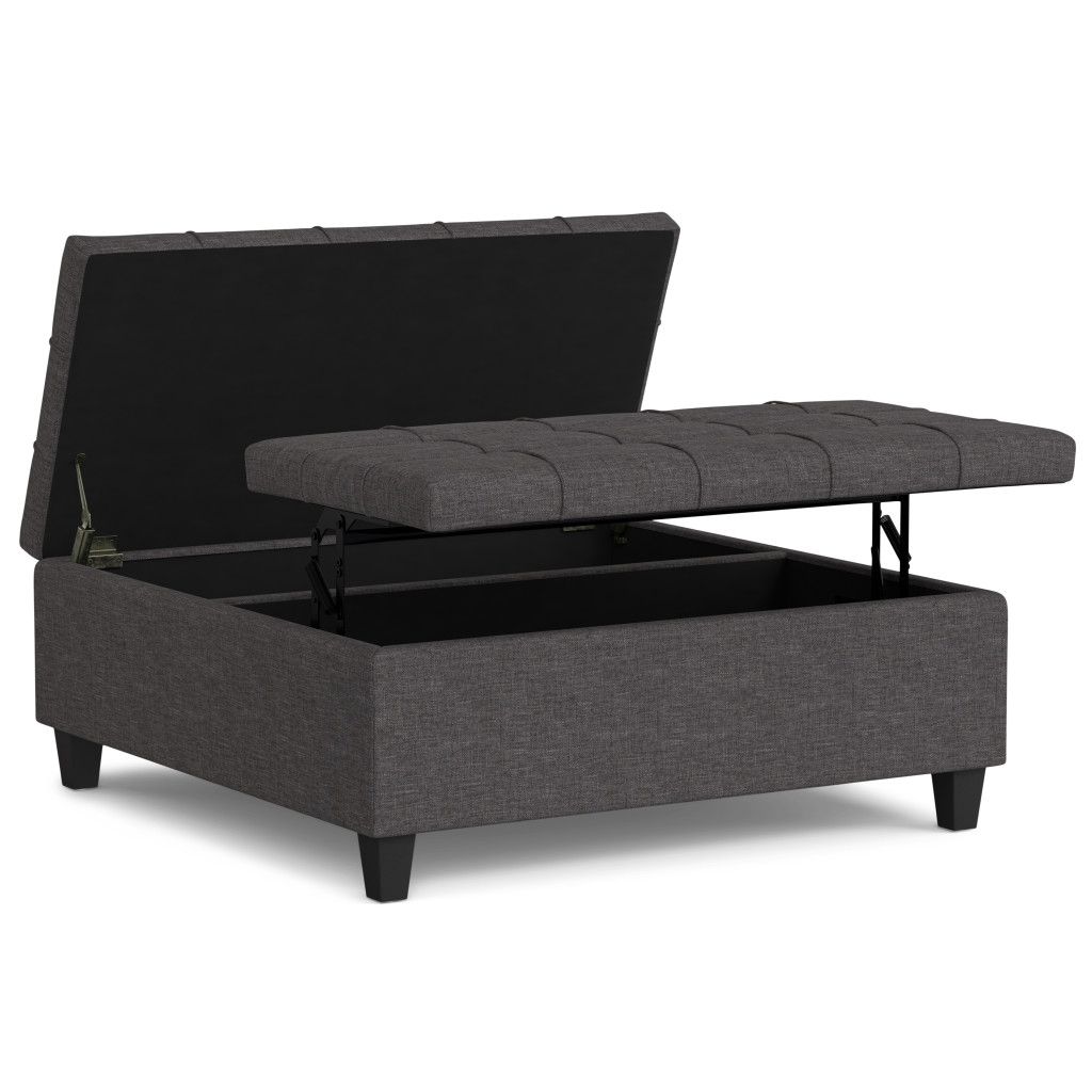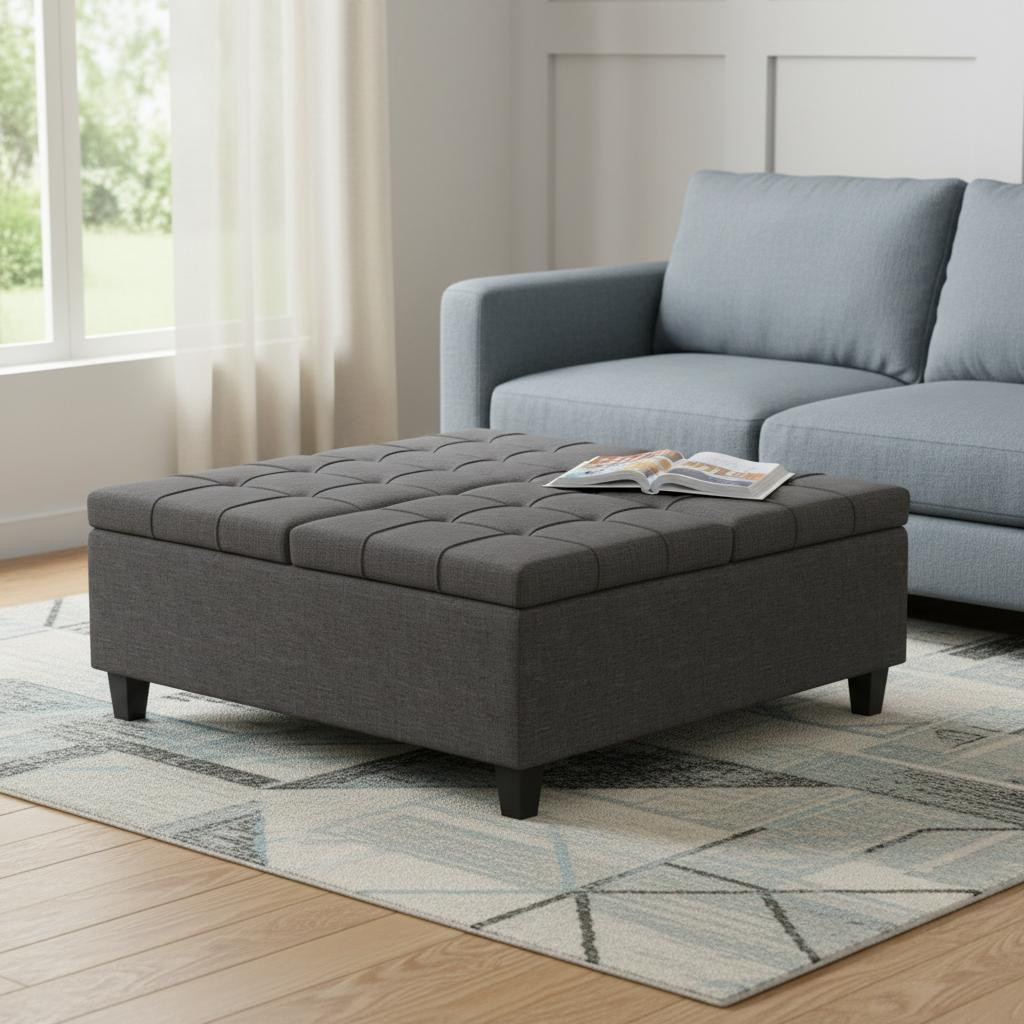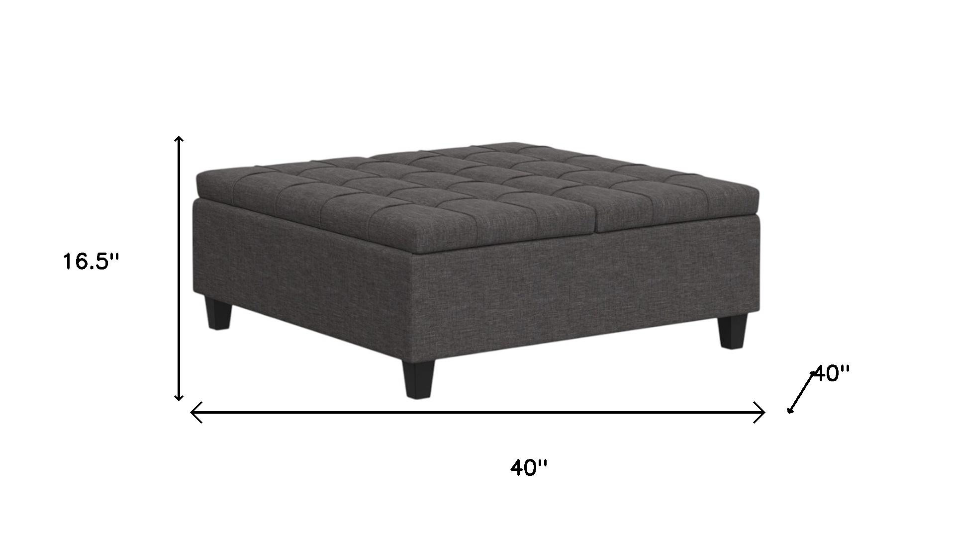 Optimize your space and add some charm to your room with the 40-inch gray and brown fabric cocktail ottoman with storage. This chic cocktail ottoman is larger in size and designed to serve as a make-shift coffee table during parties. The surface is wide and flat which is not only suitable for a footrest or seat but also ready to hold trays of appetizers, drinks, or desserts. The upholstery top of this ottoman is a nice contrast to the upholstery material. Expertly upholstered with padding in a soft solid color polyester, this ottoman is as comfortable as it is good looking. Easy to blend into most any room, a ottoman is a way to add a good looking accent to your space that can also be practical and useful. 16.50-inch h x 40.00-inch w x 40.00-inch d.