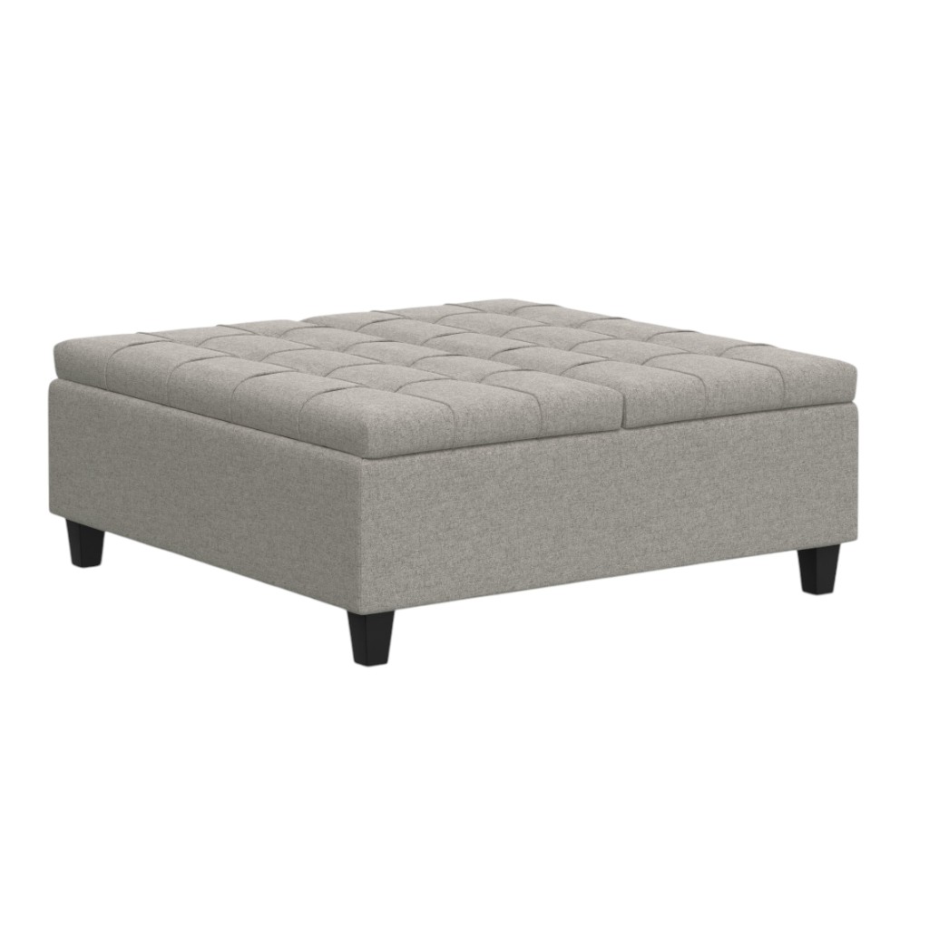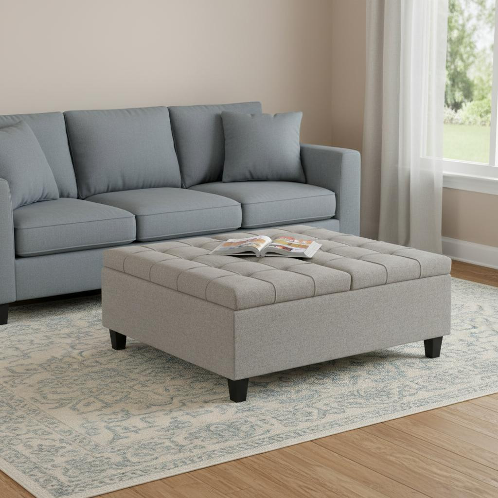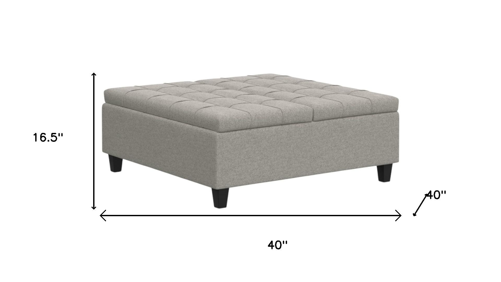 Get ready to relax with this 40-inch gray and brown fabric cocktail ottoman with storage. This chic cocktail ottoman is larger in size and designed to serve as a make-shift coffee table during parties. The surface is wide and flat which is not only suitable for a footrest or seat but also ready to hold trays of appetizers, drinks, or desserts. The upholstery top of this ottoman is a nice contrast to the upholstery material. Expertly upholstered with padding in a soft solid color polyester, this ottoman is as comfortable as it is good looking. Easy to blend into most any room, a ottoman is a way to add a good looking accent to your space that can also be practical and useful. 16.50-inch h x 40.00-inch w x 40.00-inch d.