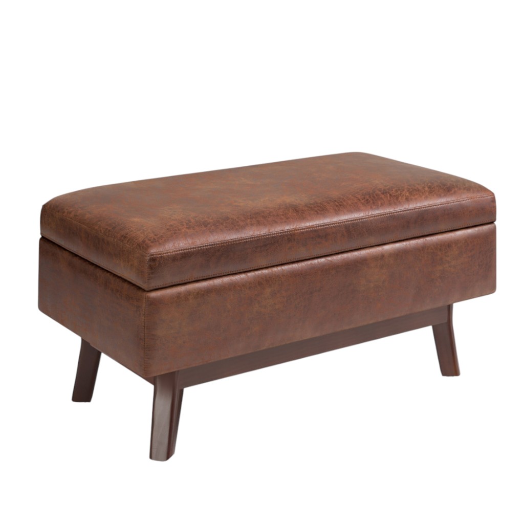 Optimize your space and add some charm to your room with the 36-inch brown leather cocktail ottoman with storage. This chic cocktail ottoman is larger in size and designed to serve as a make-shift coffee table during parties. The surface is wide and flat which is not only suitable for a footrest or seat but also ready to hold trays of appetizers, drinks, or desserts. The upholstery top of this ottoman is a nice contrast to the upholstery material. A solid brown solid wood frame is finished off with a matching brown upholstery seat, giving this ottoman a chic monotone look. The purposefully distressed finish gives this versatile ottoman an authentically rustic feel. Expertly upholstered with padding in a soft solid color leather, this ottoman is as comfortable as it is good looking. Easy to blend into most any room, a ottoman is a way to add a good looking accent to your space that can also be practical and useful. 18.50-inch h x 36.20-inch w x 18.10-inch d.