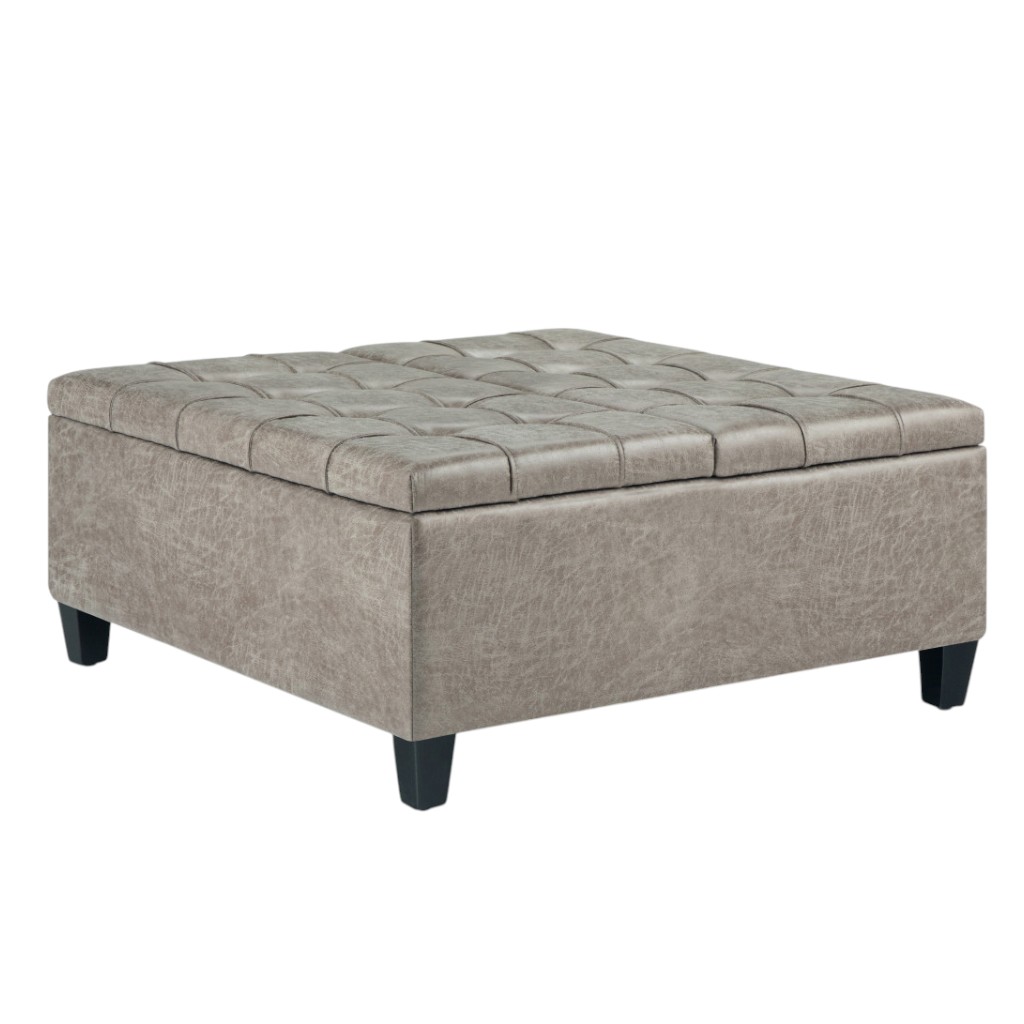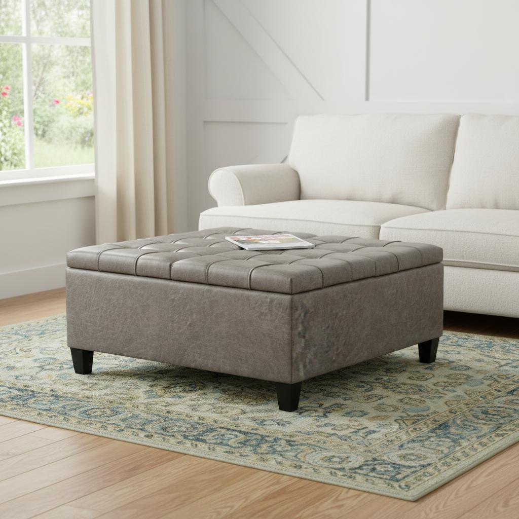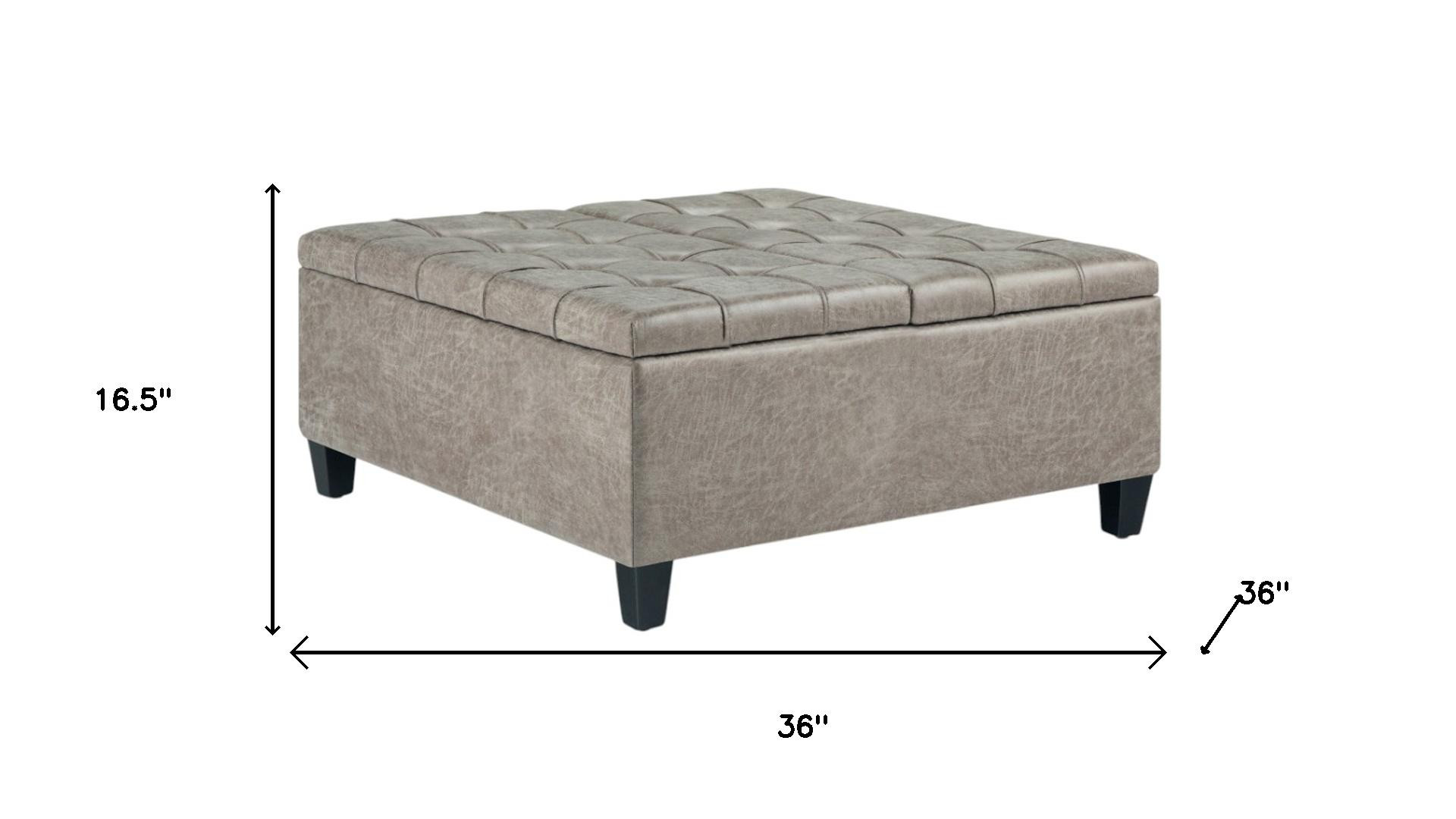 Optimize your space and add some charm to your room with the 36-inch gray and espresso leather cocktail ottoman with storage. This chic cocktail ottoman is larger in size and designed to serve as a make-shift coffee table during parties. The surface is wide and flat which is not only suitable for a footrest or seat but also ready to hold trays of appetizers, drinks, or desserts. The upholstery top of this ottoman is a nice contrast to the upholstery material. The purposefully distressed finish gives this versatile ottoman an authentically rustic feel. Expertly upholstered with padding in a soft solid color leather, this ottoman is as comfortable as it is good looking. Easy to blend into most any room, a ottoman is a way to add a good looking accent to your space that can also be practical and useful. 16.50-inch h x 36.00-inch w x 36.00-inch d.