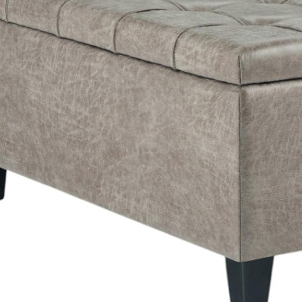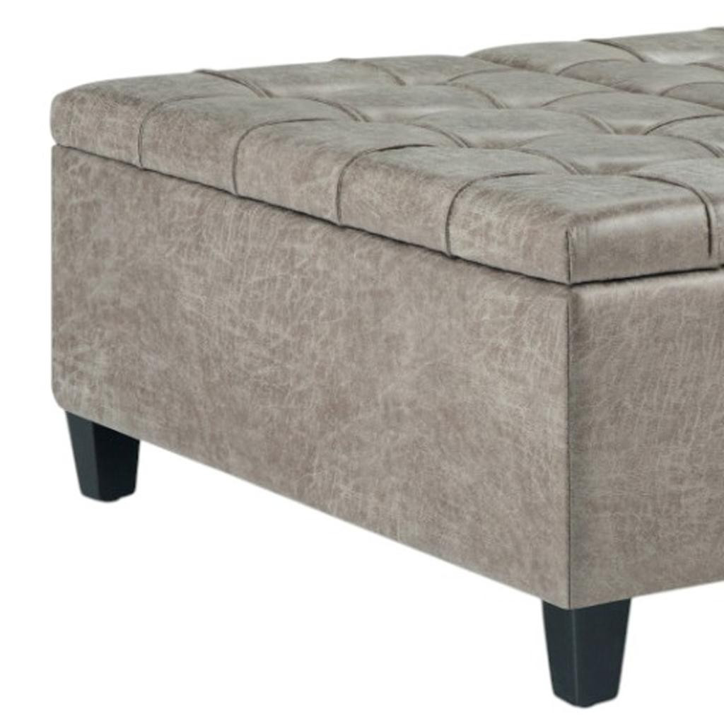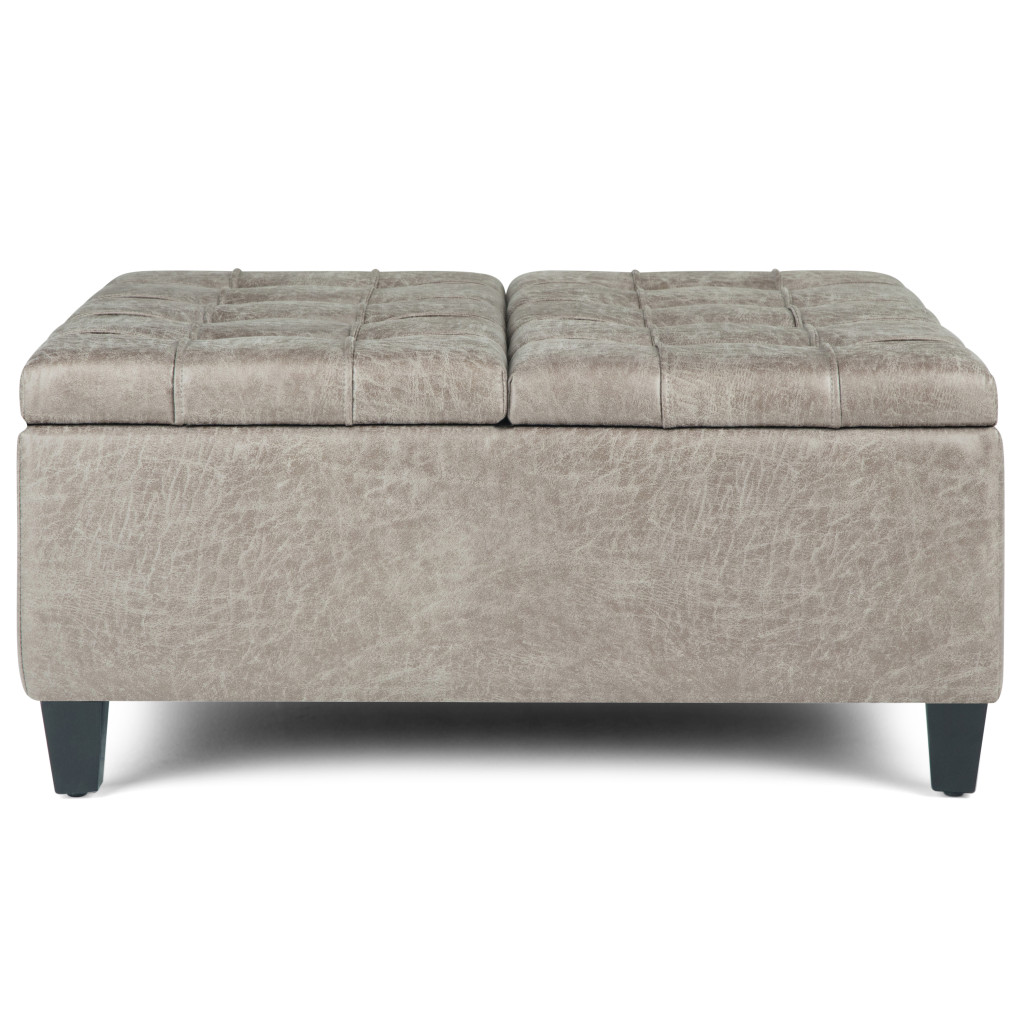 Optimize your space and add some charm to your room with the 36-inch gray and espresso leather cocktail ottoman with storage. This chic cocktail ottoman is larger in size and designed to serve as a make-shift coffee table during parties. The surface is wide and flat which is not only suitable for a footrest or seat but also ready to hold trays of appetizers, drinks, or desserts. The upholstery top of this ottoman is a nice contrast to the upholstery material. The purposefully distressed finish gives this versatile ottoman an authentically rustic feel. Expertly upholstered with padding in a soft solid color leather, this ottoman is as comfortable as it is good looking. Easy to blend into most any room, a ottoman is a way to add a good looking accent to your space that can also be practical and useful. 16.50-inch h x 36.00-inch w x 36.00-inch d.