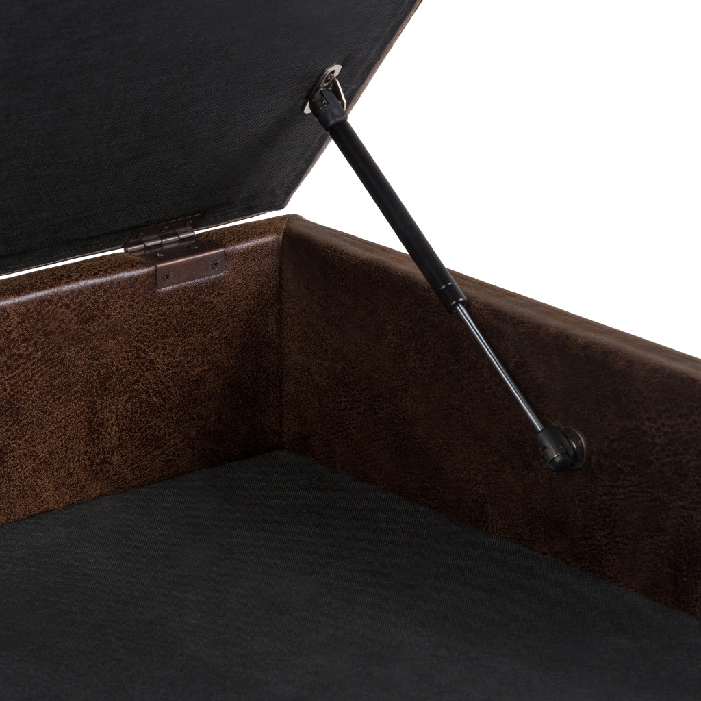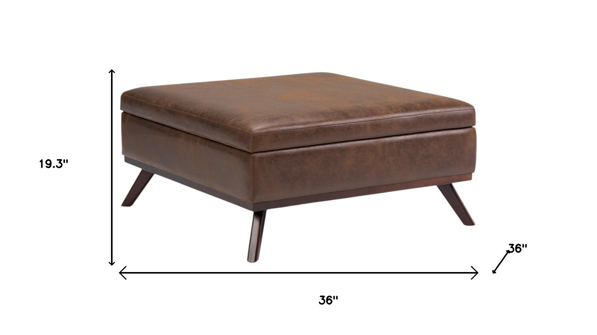 Practicality and fashion mix together with this handy 36-inch brown leather cocktail ottoman with storage. This chic cocktail ottoman is larger in size and designed to serve as a make-shift coffee table during parties. The surface is wide and flat which is not only suitable for a footrest or seat but also ready to hold trays of appetizers, drinks, or desserts. The upholstery top of this ottoman is a nice contrast to the upholstery material. A brown monotone coloration gives this solid wood and upholstery ottoman a fresh and updated look. Complete with a purposefully distressed finish, this ottoman has an aged, vintage, and rustic feel. Expertly upholstered with padding in a soft solid color leather, this ottoman is as comfortable as it is good looking. Easy to blend into most any room, a ottoman is a way to add a good looking accent to your space that can also be practical and useful. 19.30-inch h x 36.00-inch w x 36.00-inch d.