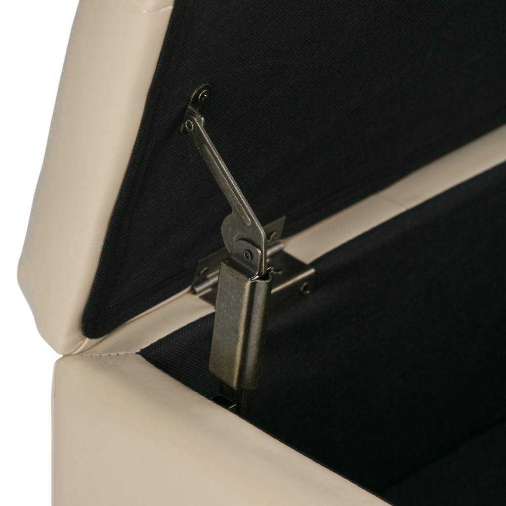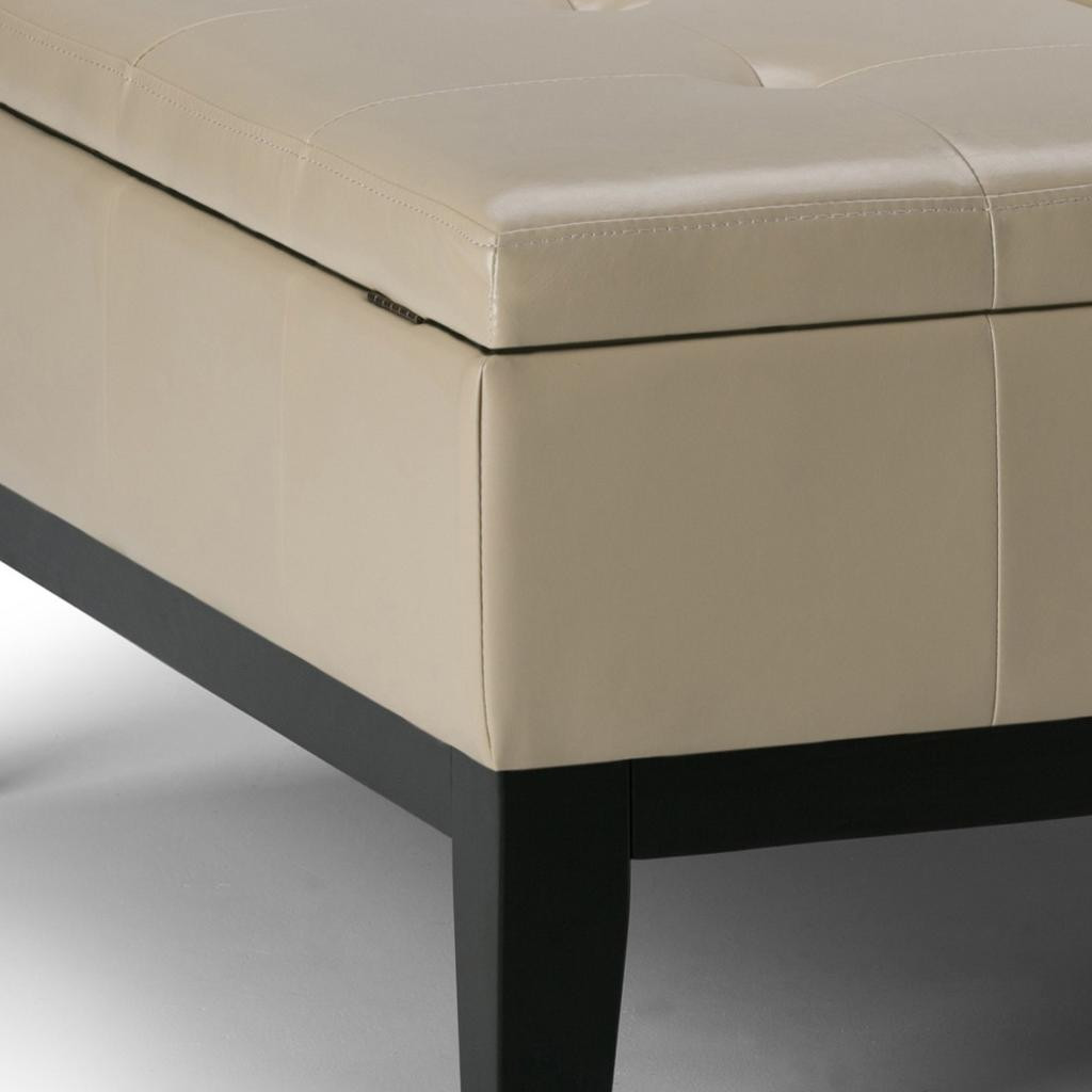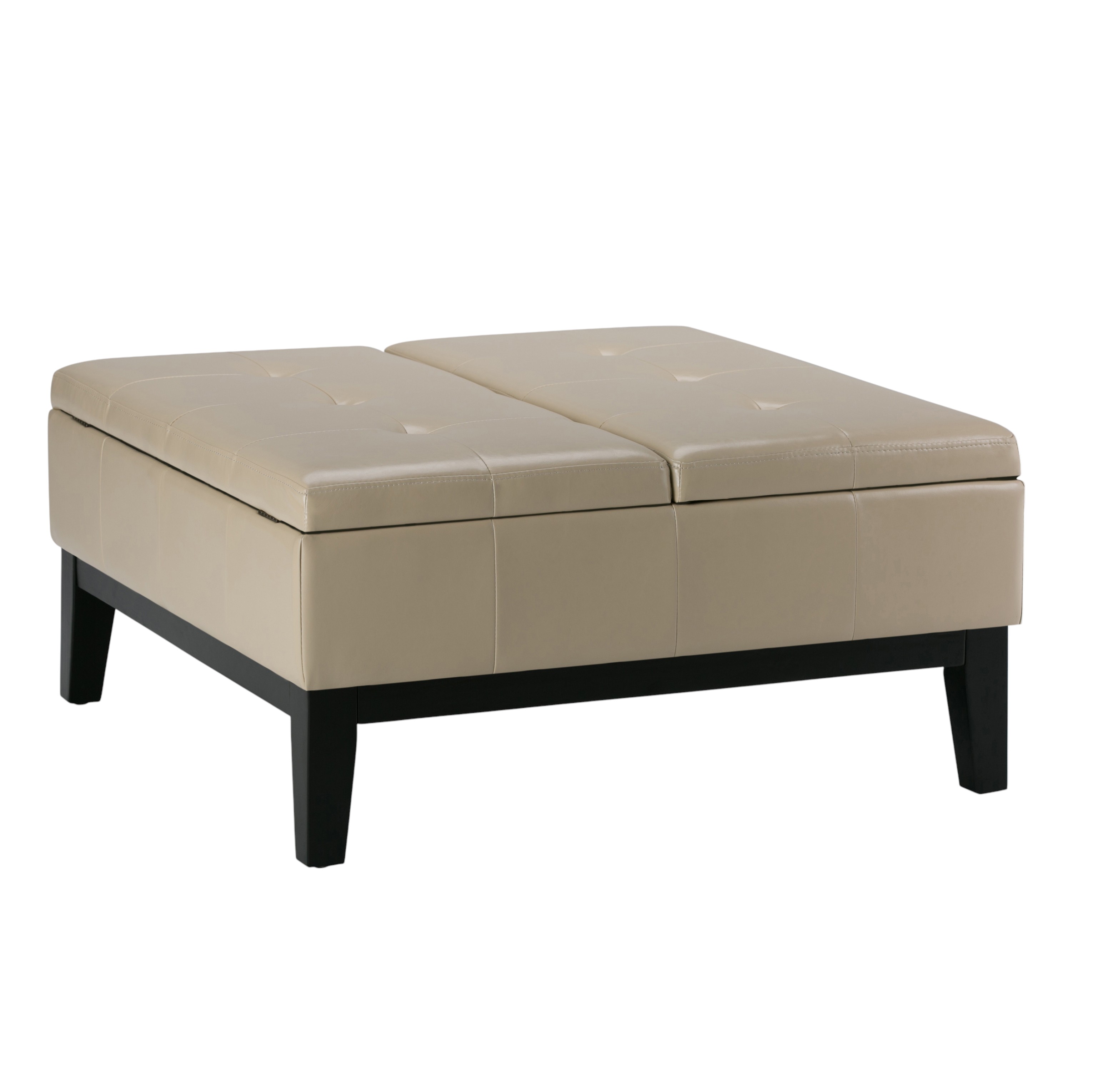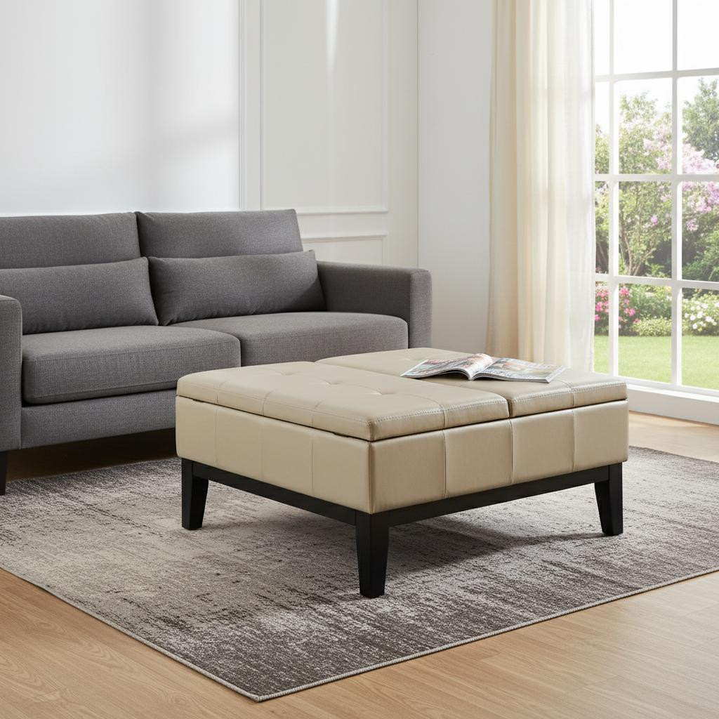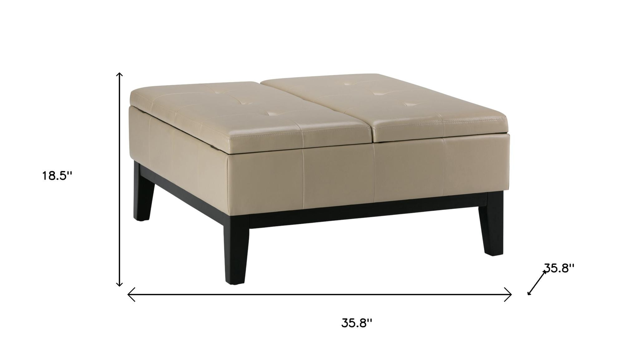 Practicality and fashion mix together with this handy 36-inch cream and dark brown leather cocktail ottoman with storage. This chic cocktail ottoman is larger in size and designed to serve as a make-shift coffee table during parties. The surface is wide and flat which is not only suitable for a footrest or seat but also ready to hold trays of appetizers, drinks, or desserts. The upholstery top of this ottoman is a nice contrast to the upholstery material. Expertly upholstered with padding in a soft solid color leather, this ottoman is as comfortable as it is good looking. Easy to blend into most any room, a ottoman is a way to add a good looking accent to your space that can also be practical and useful. 18.50-inch h x 35.80-inch w x 35.80-inch d.