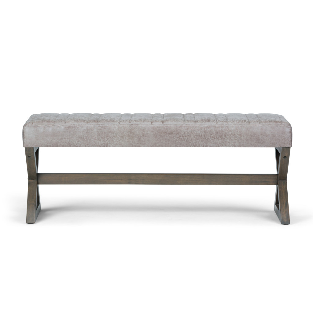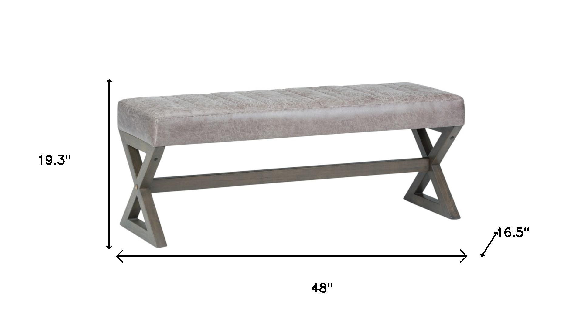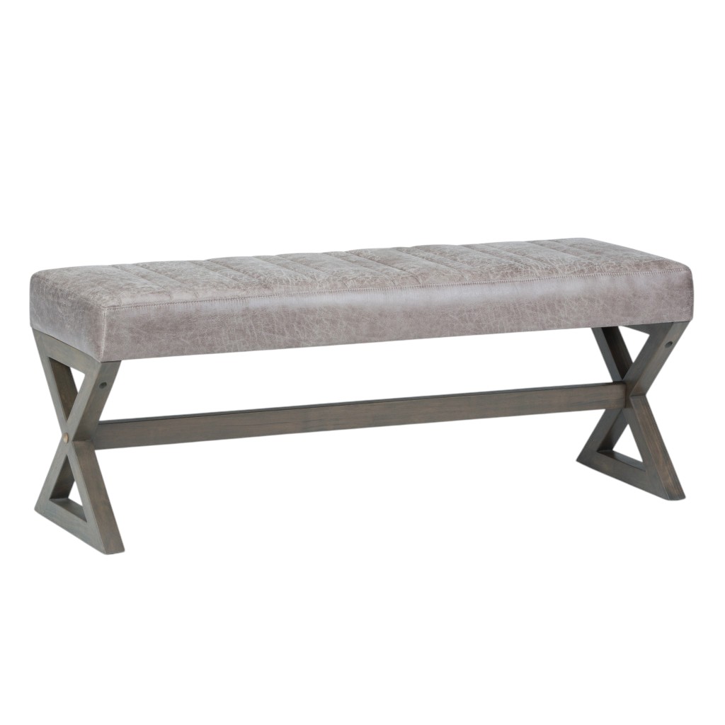 Add a good looking decorative accent to your space that is also practical for seating. The upholstery top of this ottoman is a nice contrast to the upholstery material. Complete with a purposefully distressed finish, this ottoman has an aged, vintage, and rustic feel. Expertly upholstered with padding in a soft solid color leather, this ottoman is as comfortable as it is good looking. Ottomans are multi-functional additions to your space that add fashion and practical value. 19.30-inch h x 48.00-inch w x 16.50-inch d.