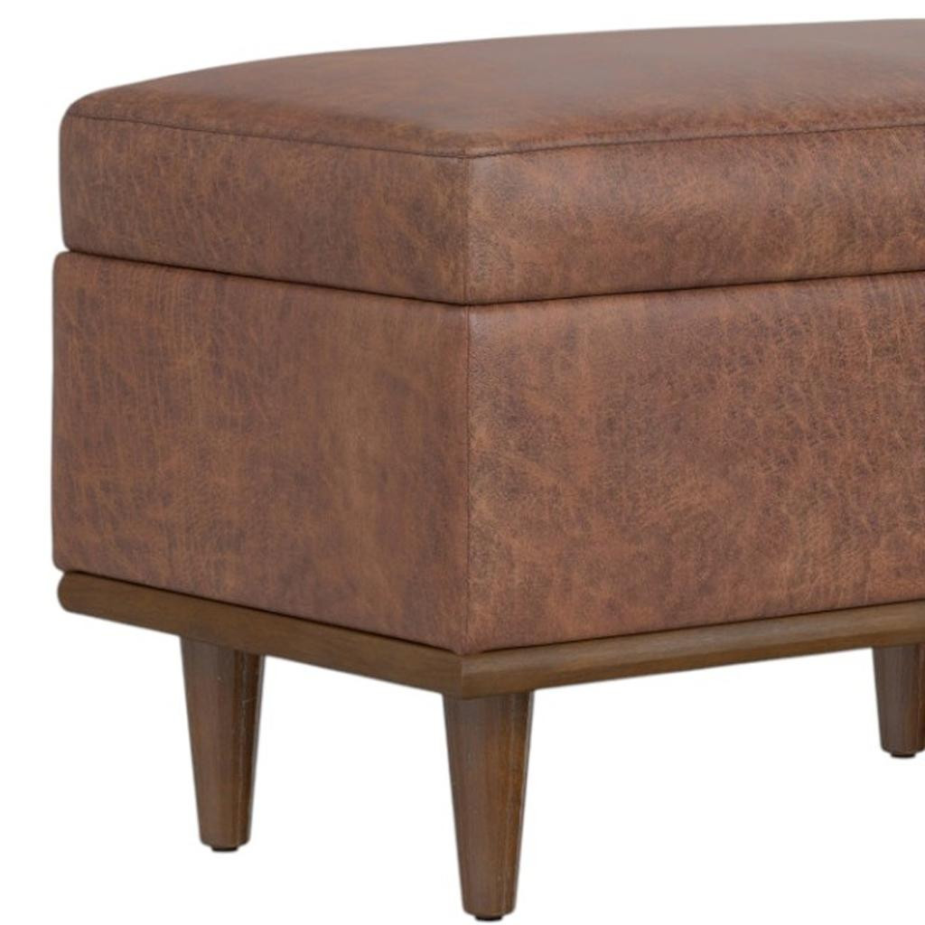 Optimize your space and add some charm to your room with the 26-inch brown and walnut leather cocktail ottoman with storage. This chic cocktail ottoman is larger in size and designed to serve as a make-shift coffee table during parties. The surface is wide and flat which is not only suitable for a footrest or seat but also ready to hold trays of appetizers, drinks, or desserts. The upholstery top of this ottoman is a nice contrast to the upholstery material. Expertly upholstered with padding in a soft solid color leather, this ottoman is as comfortable as it is good looking. Easy to blend into most any room, a ottoman is a way to add a good looking accent to your space that can also be practical and useful. 18.00-inch h x 26.00-inch w x 16.00-inch d.