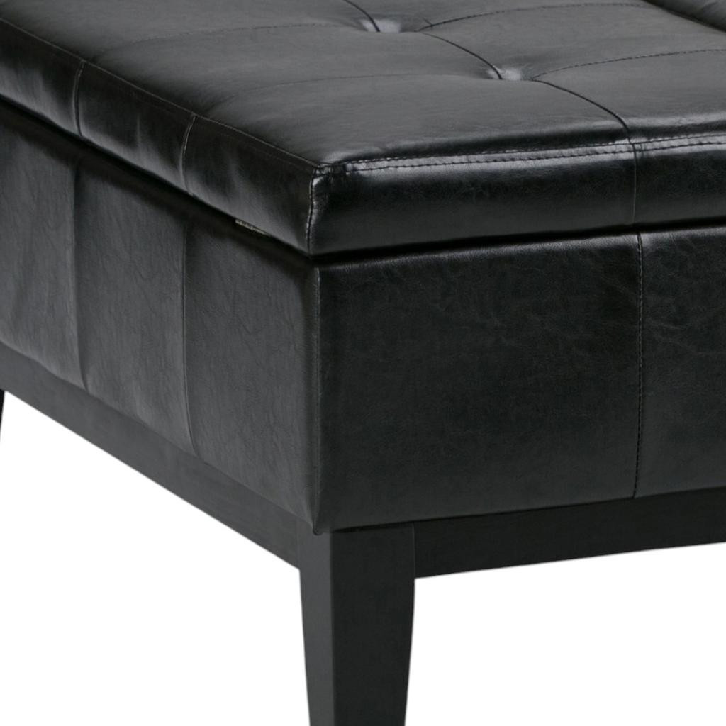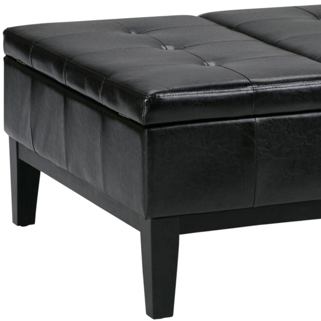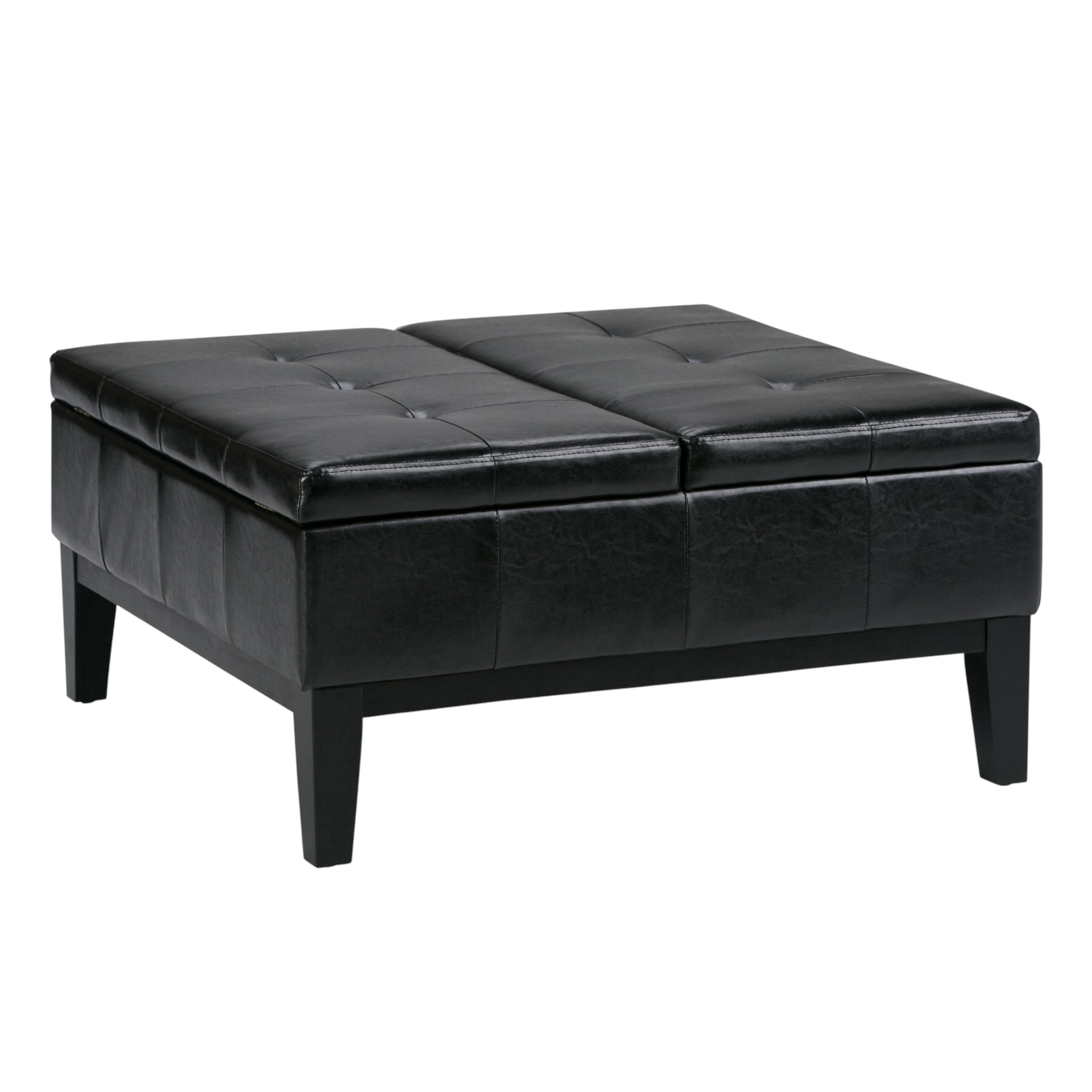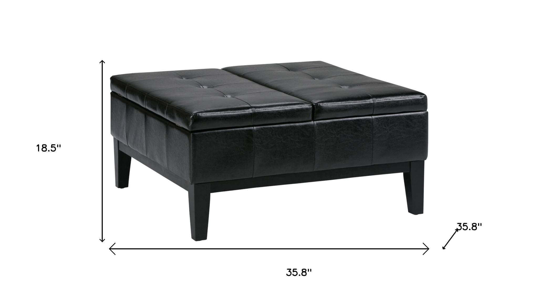 Practicality and fashion mix together with this handy 36-inch black and dark brown leather cocktail ottoman with storage. This chic cocktail ottoman is larger in size and designed to serve as a make-shift coffee table during parties. The surface is wide and flat which is not only suitable for a footrest or seat but also ready to hold trays of appetizers, drinks, or desserts. The upholstery top of this ottoman is a nice contrast to the upholstery material. Expertly upholstered with padding in a soft solid color leather, this ottoman is as comfortable as it is good looking. Easy to blend into most any room, a ottoman is a way to add a good looking accent to your space that can also be practical and useful. 18.50-inch h x 35.80-inch w x 35.80-inch d.