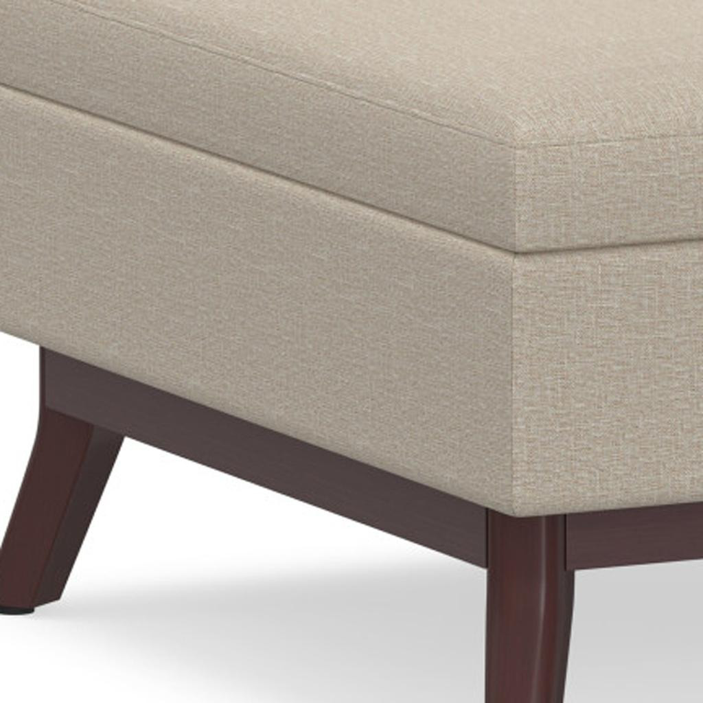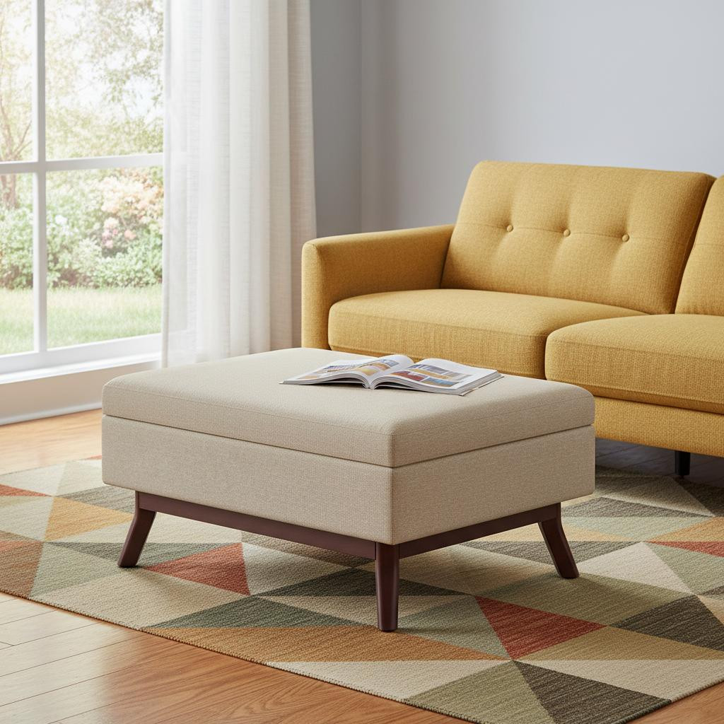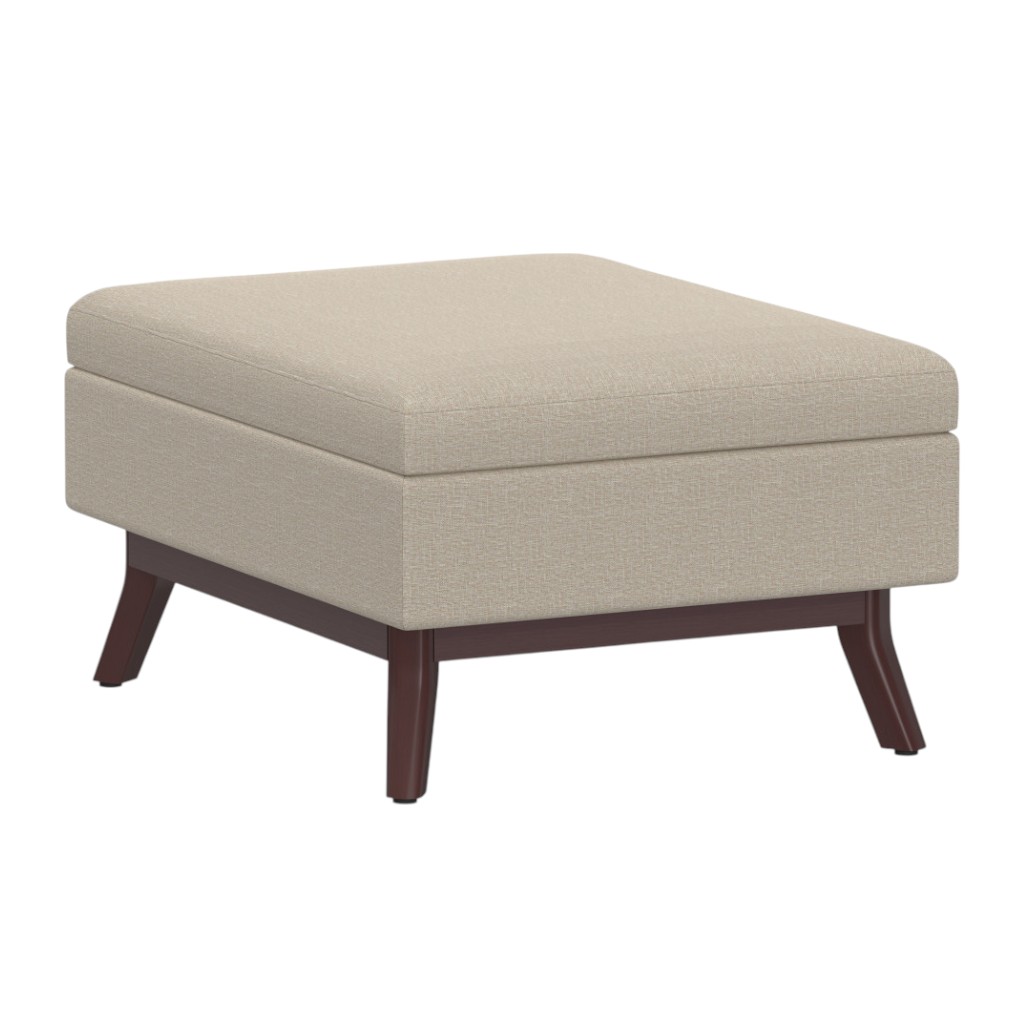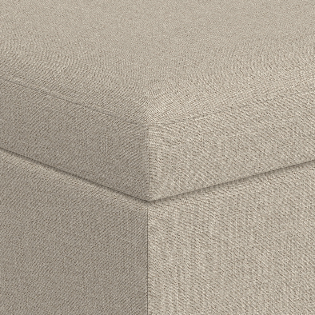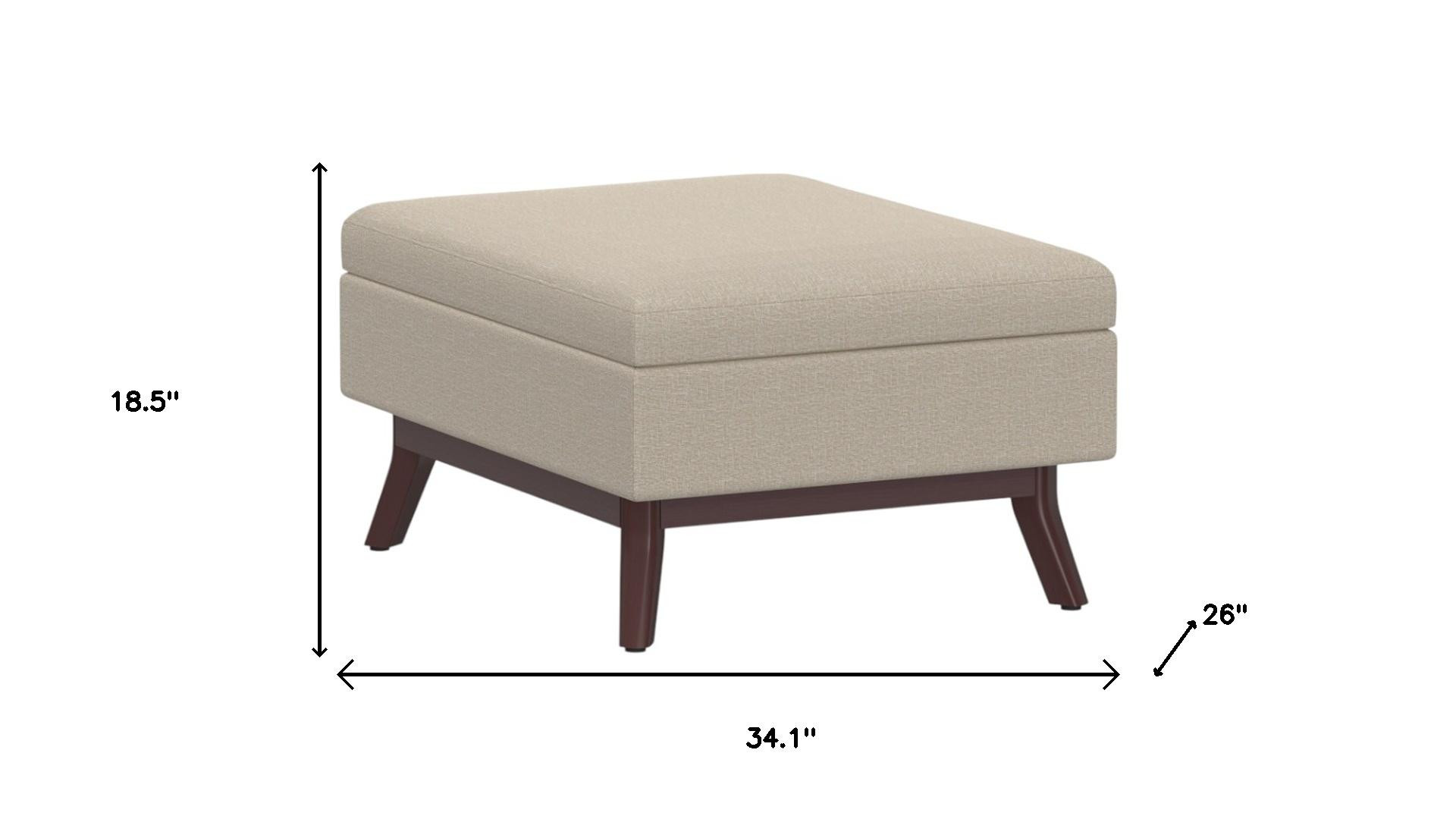 Get ready to relax with this 34-inch natural and brown fabric cocktail ottoman with storage. This chic cocktail ottoman is larger in size and designed to serve as a make-shift coffee table during parties. The surface is wide and flat which is not only suitable for a footrest or seat but also ready to hold trays of appetizers, drinks, or desserts. The upholstery top of this ottoman is a nice contrast to the upholstery material. Expertly upholstered with padding in a soft solid color polyester, this ottoman is as comfortable as it is good looking. Ottomans are multi-functional additions to your space that add fashion and practical value. 18.50-inch h x 34.10-inch w x 26.00-inch d.