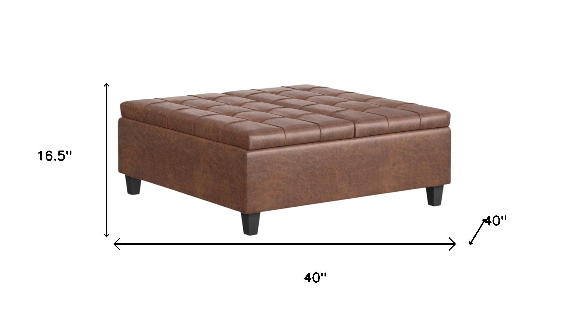 Optimize your space and add some charm to your room with the 40-inch brown leather cocktail ottoman with storage. This chic cocktail ottoman is larger in size and designed to serve as a make-shift coffee table during parties. The surface is wide and flat which is not only suitable for a footrest or seat but also ready to hold trays of appetizers, drinks, or desserts. The upholstery top of this ottoman is a nice contrast to the upholstery material. A brown monotone coloration gives this solid wood and upholstery ottoman a fresh and updated look. Expertly upholstered with padding in a soft solid color leather, this ottoman is as comfortable as it is good looking. Easy to blend into most any room, a ottoman is a way to add a good looking accent to your space that can also be practical and useful. 16.50-inch h x 40.00-inch w x 40.00-inch d.