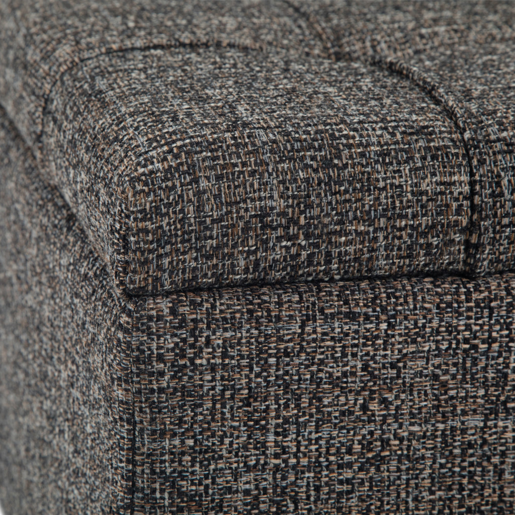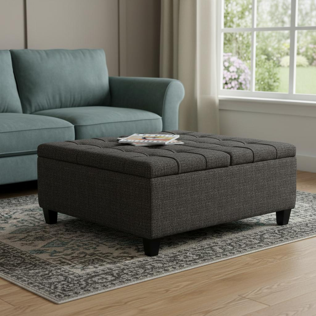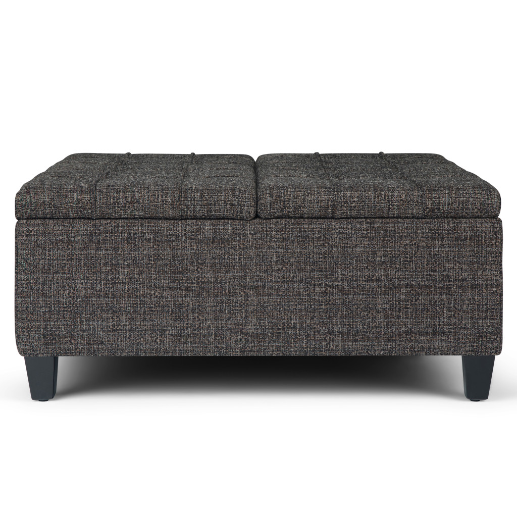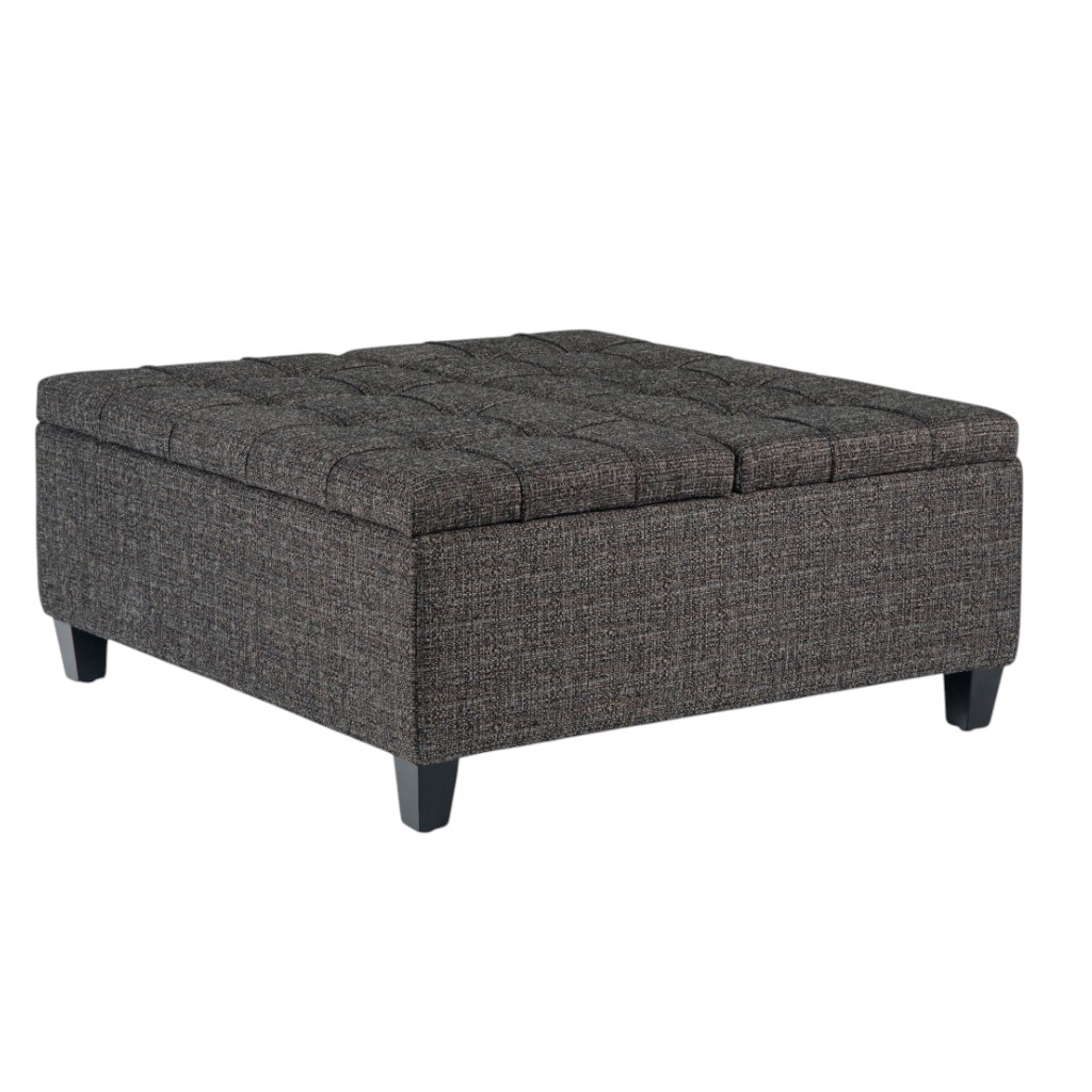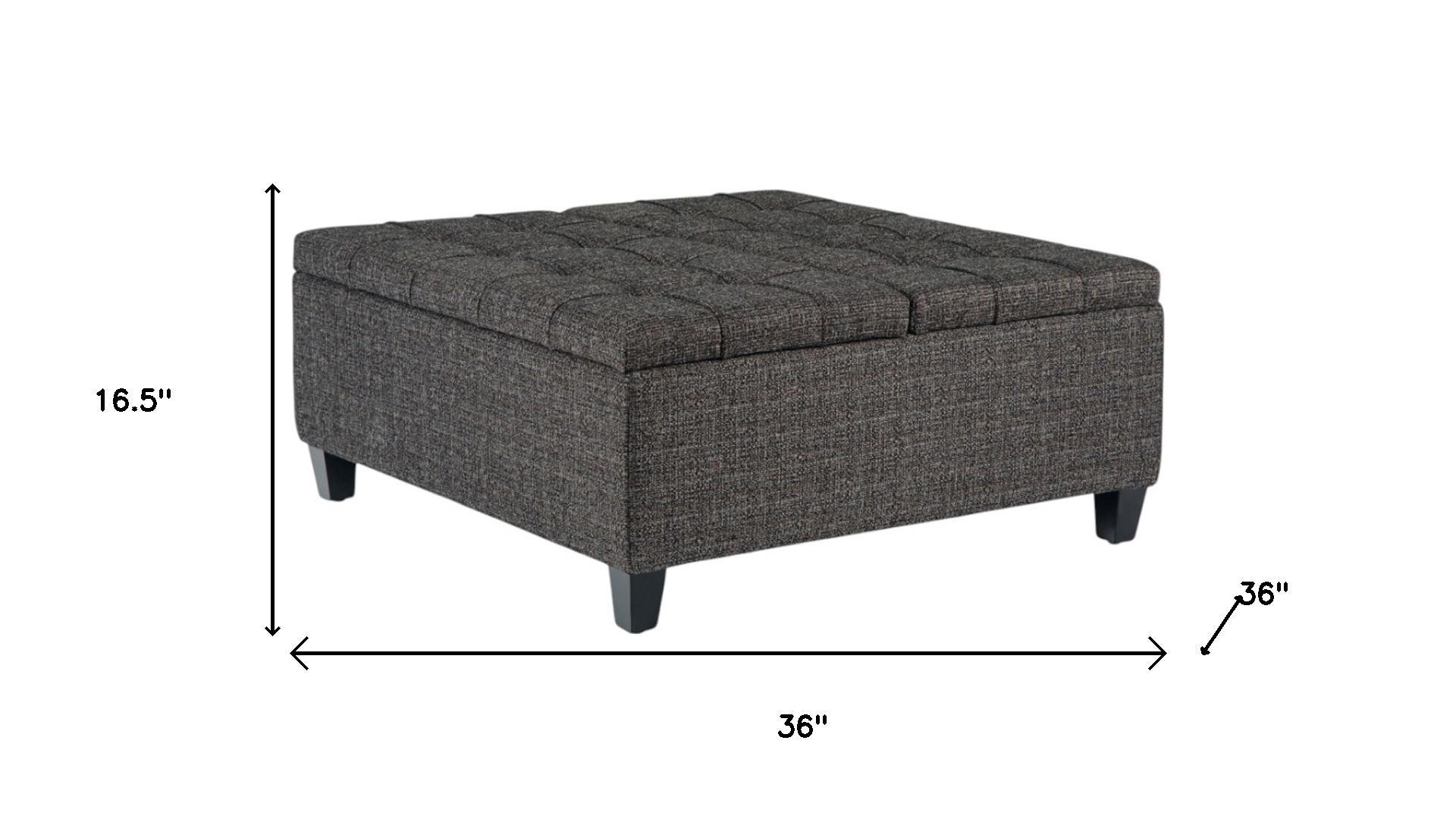 Practicality and fashion mix together with this handy 36-inch ebony and espresso fabric cocktail ottoman with storage. This chic cocktail ottoman is larger in size and designed to serve as a make-shift coffee table during parties. The surface is wide and flat which is not only suitable for a footrest or seat but also ready to hold trays of appetizers, drinks, or desserts. The upholstery top of this ottoman is a nice contrast to the upholstery material. Expertly upholstered with padding in a soft solid color polyester, this ottoman is as comfortable as it is good looking. Ottomans are multi-functional additions to your space that add fashion and practical value. 16.50-inch h x 36.00-inch w x 36.00-inch d.