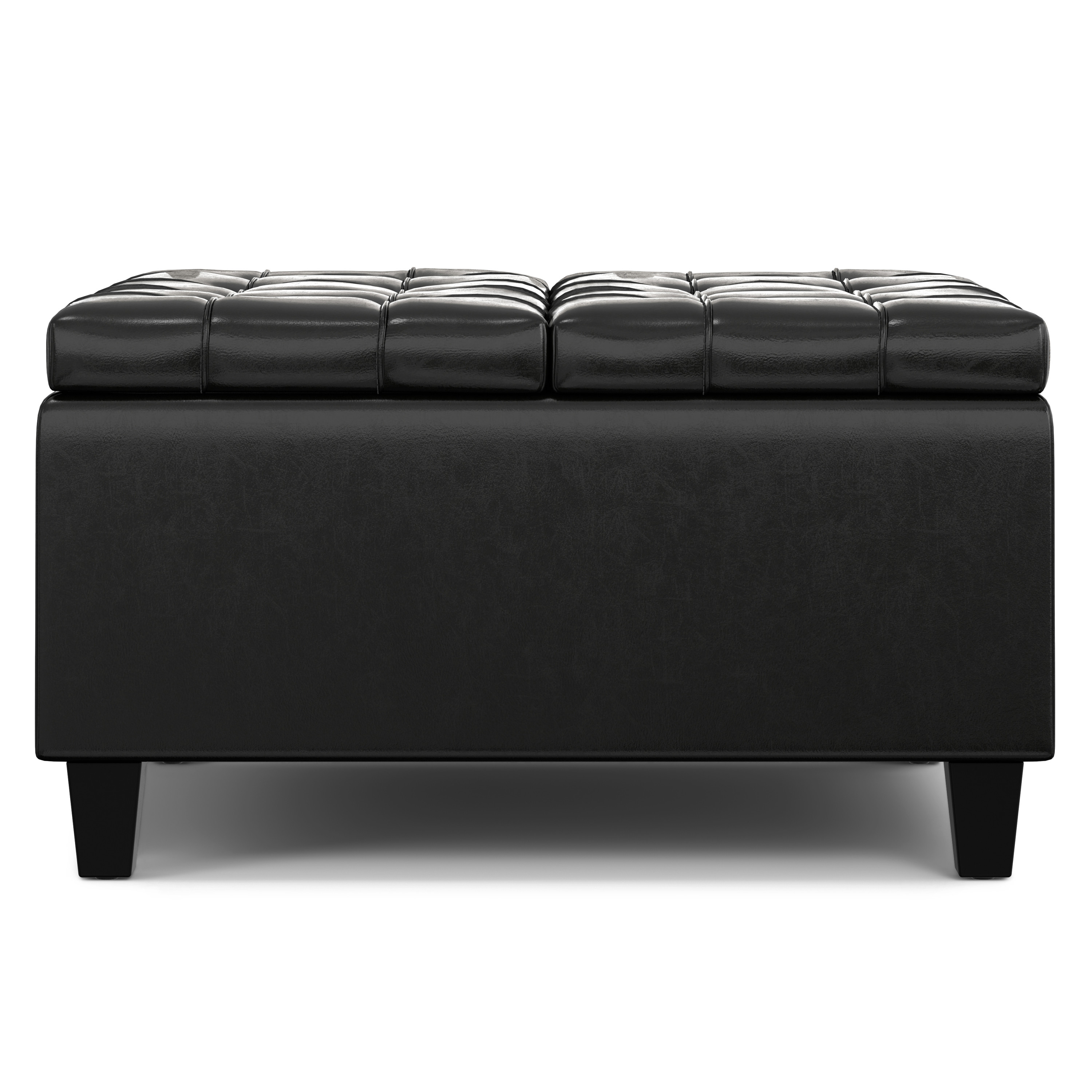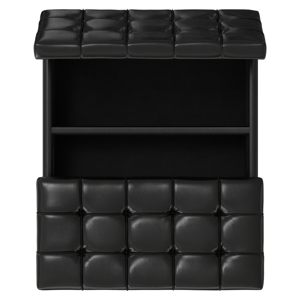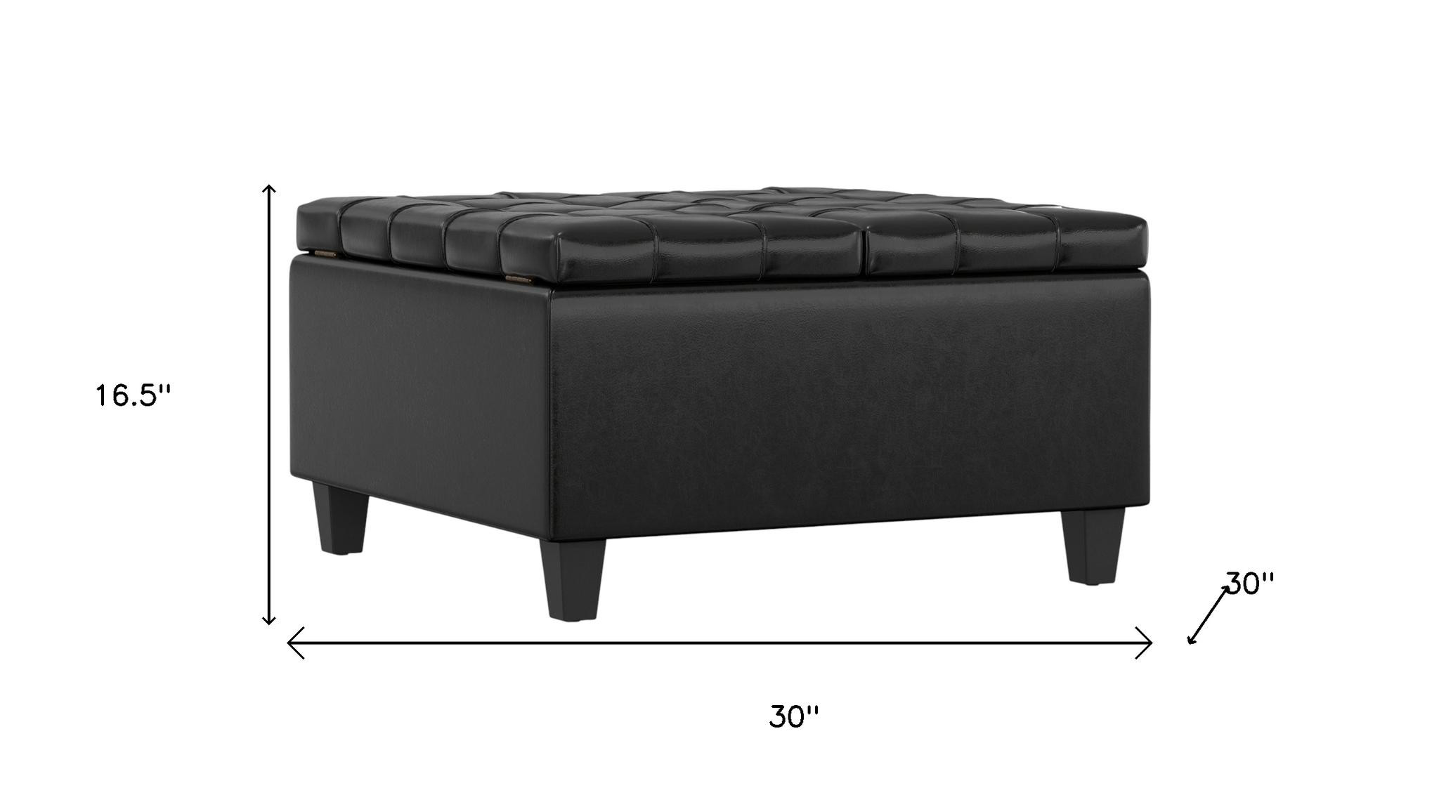 Optimize your space and add some charm to your room with the 30-inch black leather cocktail ottoman with storage. This chic cocktail ottoman is larger in size and designed to serve as a make-shift coffee table during parties. The surface is wide and flat which is not only suitable for a footrest or seat but also ready to hold trays of appetizers, drinks, or desserts. The upholstery top of this ottoman is a nice contrast to the upholstery material. A solid black solid wood frame is finished off with a matching black upholstery seat, giving this ottoman a chic monotone look. Expertly upholstered with padding in a soft solid color leather, this ottoman is as comfortable as it is good looking. Easy to blend into most any room, a ottoman is a way to add a good looking accent to your space that can also be practical and useful. 16.50-inch h x 30.00-inch w x 30.00-inch d.