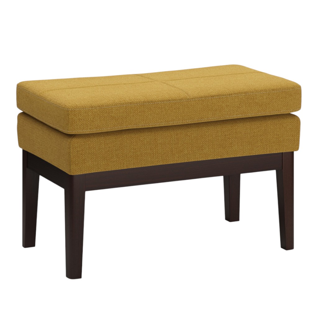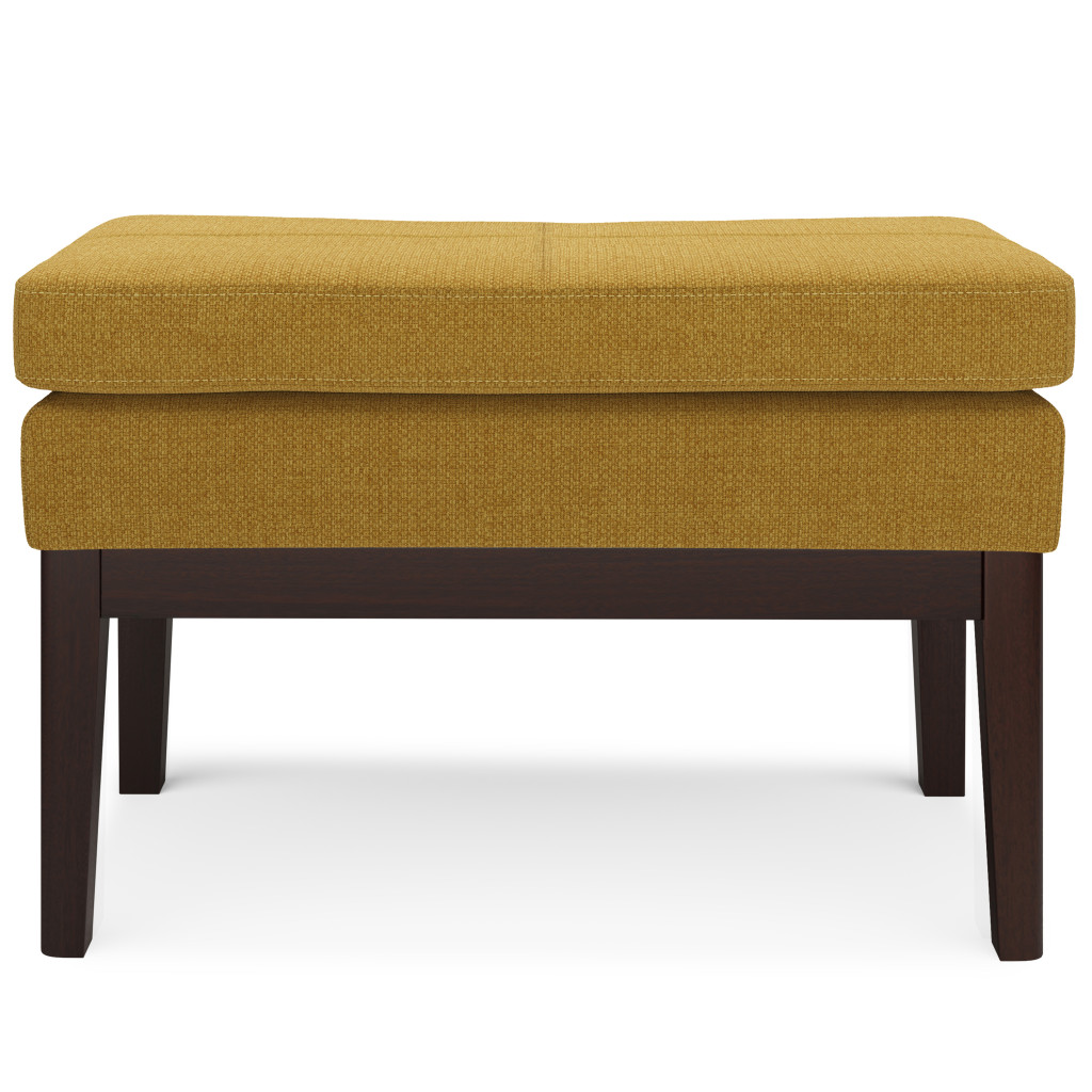 Optimize your space and add some charm to your room with the 26-inch yellow and dark brown fabric ottoman. The upholstery top of this ottoman is a nice contrast to the upholstery material. Expertly upholstered with padding in a soft solid color fabric, this ottoman is as comfortable as it is good looking. Ottomans are multi-functional additions to your space that add fashion and practical value. 17.50-inch h x 26.40-inch w x 15.00-inch d.