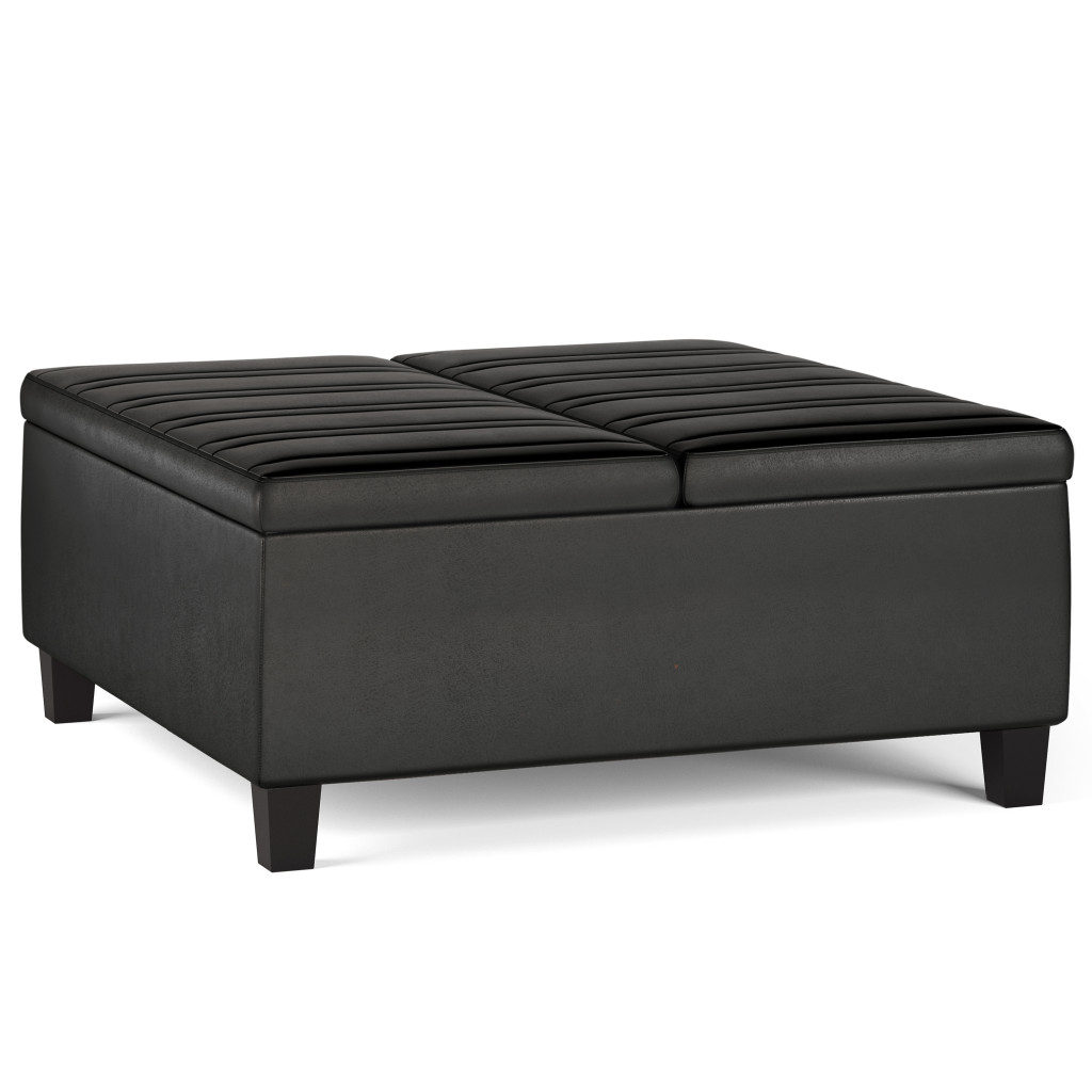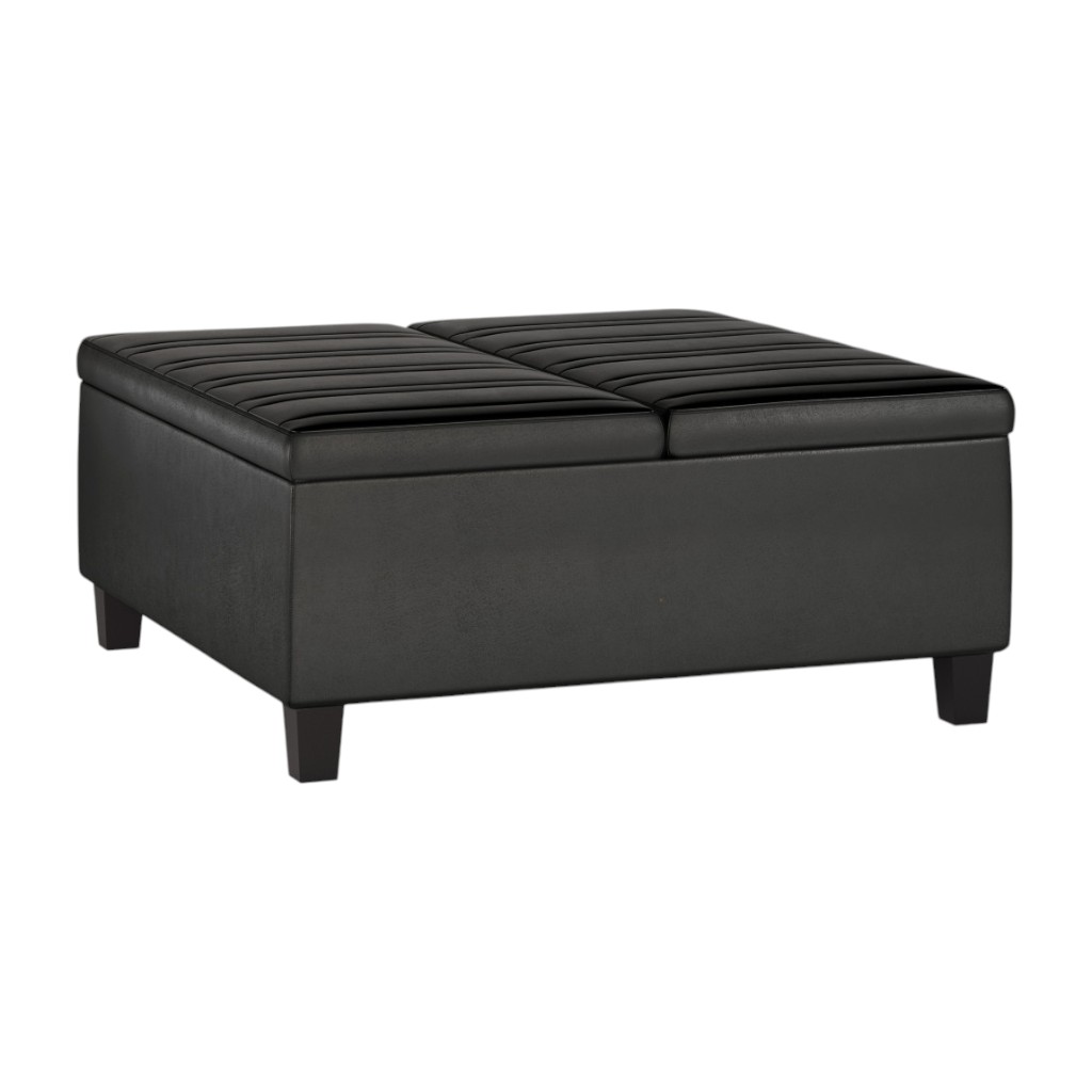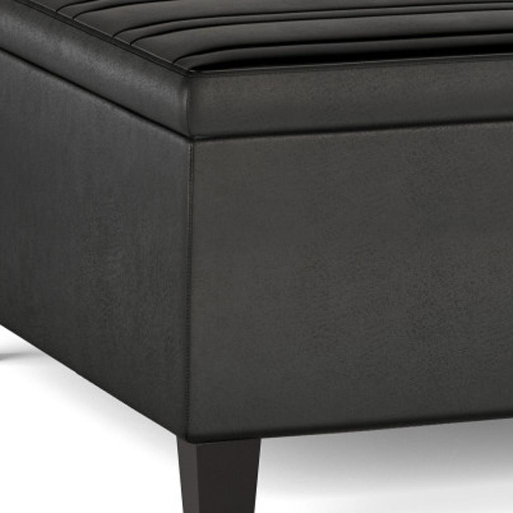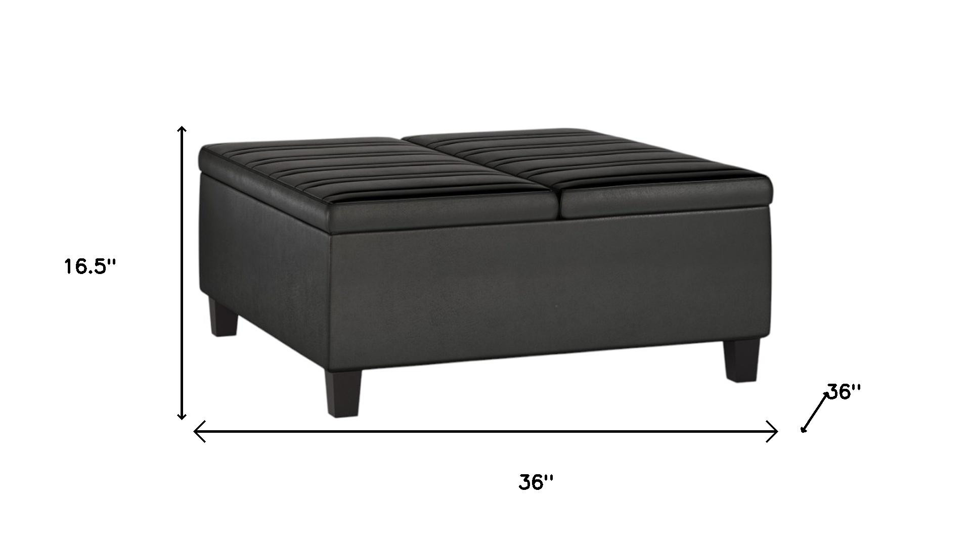 Optimize your space and add some charm to your room with the 36-inch black and espresso leather cocktail ottoman with storage. This chic cocktail ottoman is larger in size and designed to serve as a make-shift coffee table during parties. The surface is wide and flat which is not only suitable for a footrest or seat but also ready to hold trays of appetizers, drinks, or desserts. The upholstery top of this ottoman is a nice contrast to the upholstery material. Expertly upholstered with padding in a soft solid color leather, this ottoman is as comfortable as it is good looking. Ottomans are multi-functional additions to your space that add fashion and practical value. 16.50-inch h x 36.00-inch w x 36.00-inch d.
