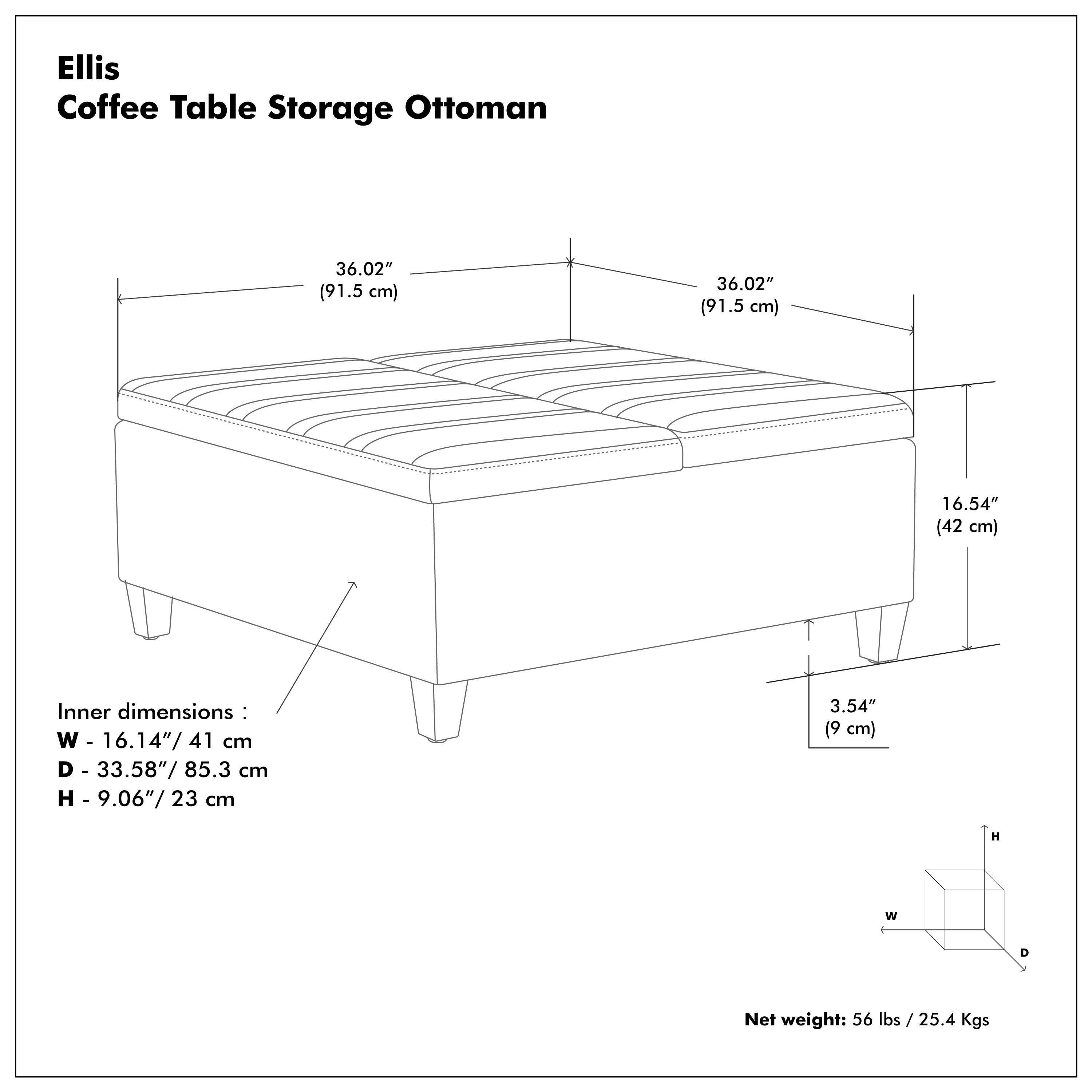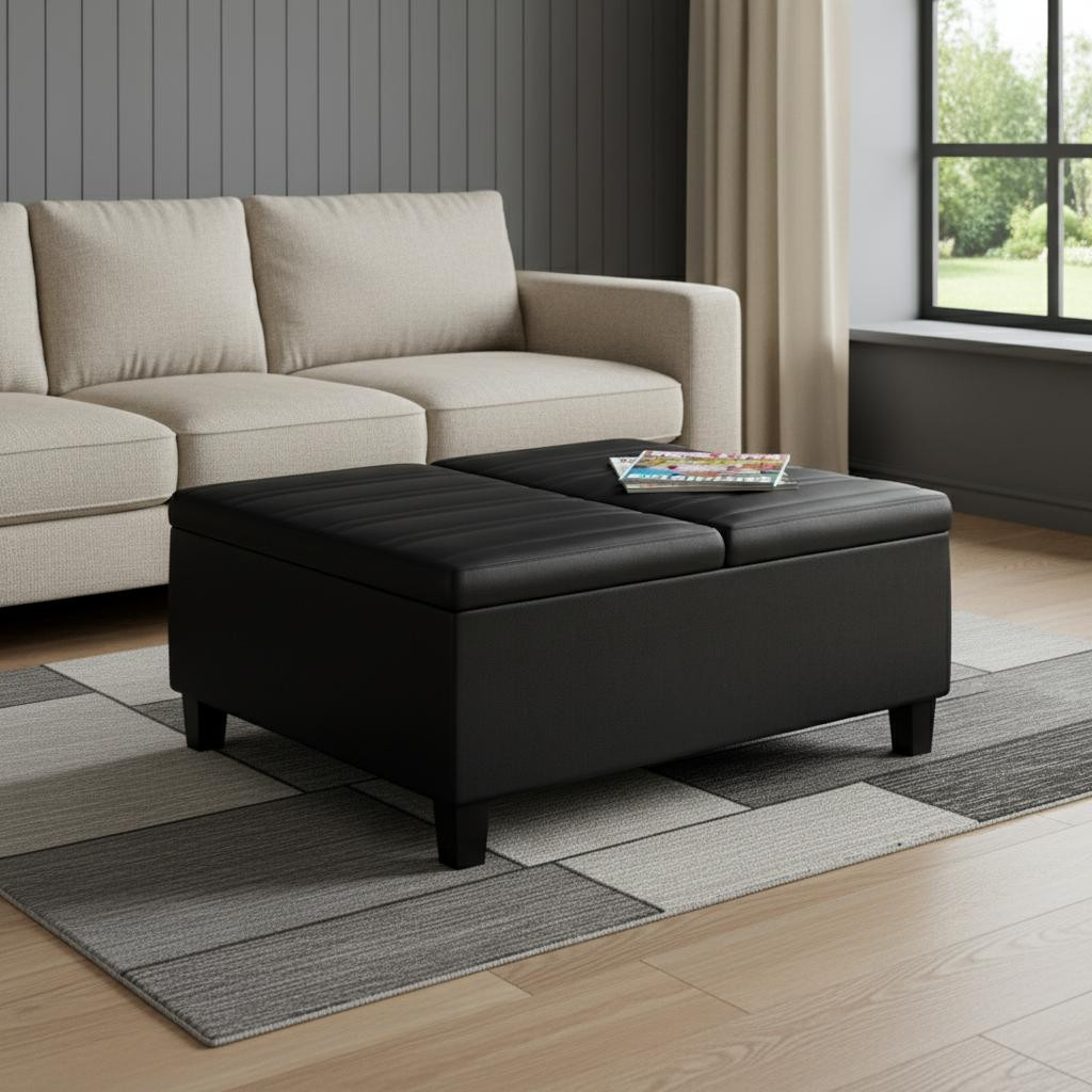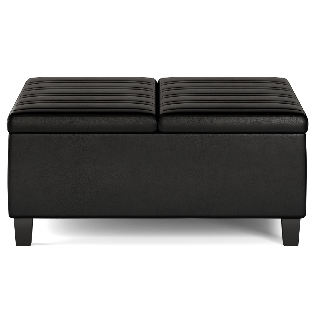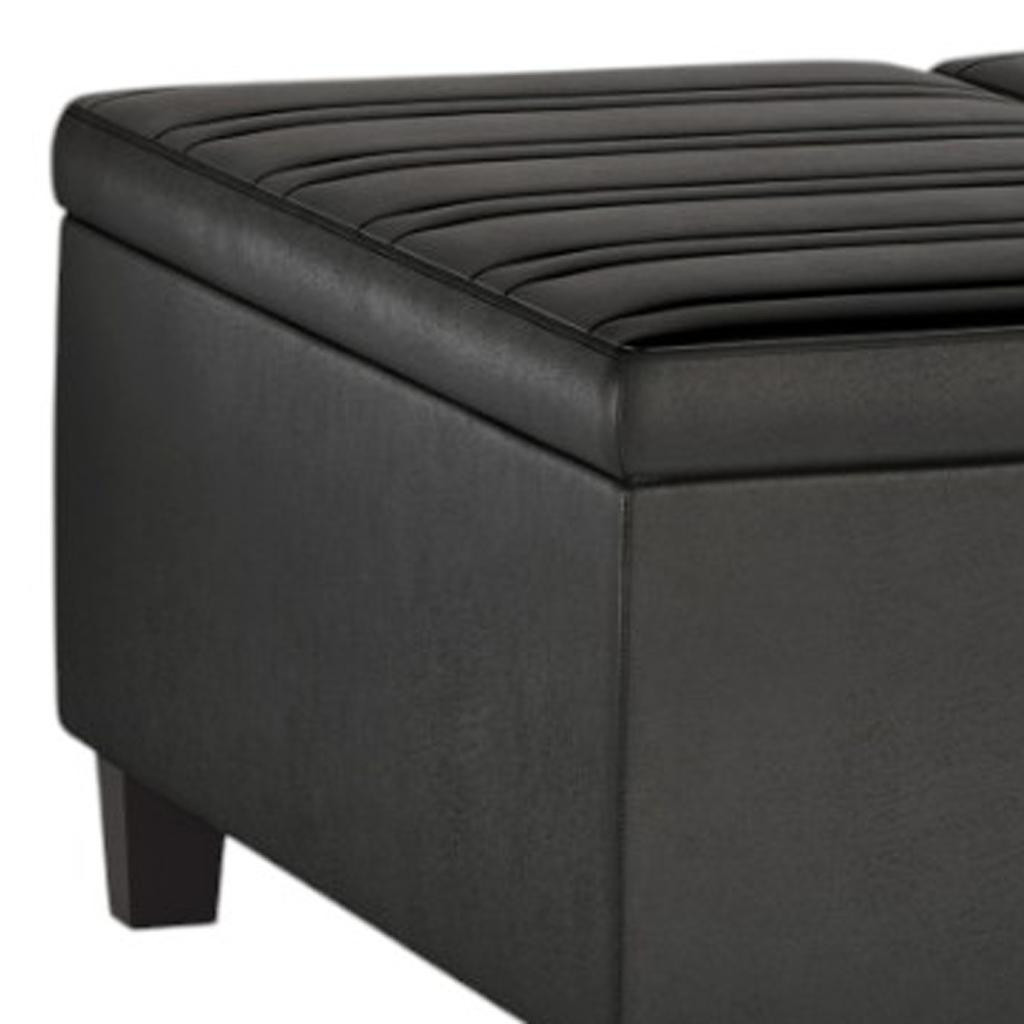 Optimize your space and add some charm to your room with the 36-inch black and espresso leather cocktail ottoman with storage. This chic cocktail ottoman is larger in size and designed to serve as a make-shift coffee table during parties. The surface is wide and flat which is not only suitable for a footrest or seat but also ready to hold trays of appetizers, drinks, or desserts. The upholstery top of this ottoman is a nice contrast to the upholstery material. Expertly upholstered with padding in a soft solid color leather, this ottoman is as comfortable as it is good looking. Ottomans are multi-functional additions to your space that add fashion and practical value. 16.50-inch h x 36.00-inch w x 36.00-inch d.