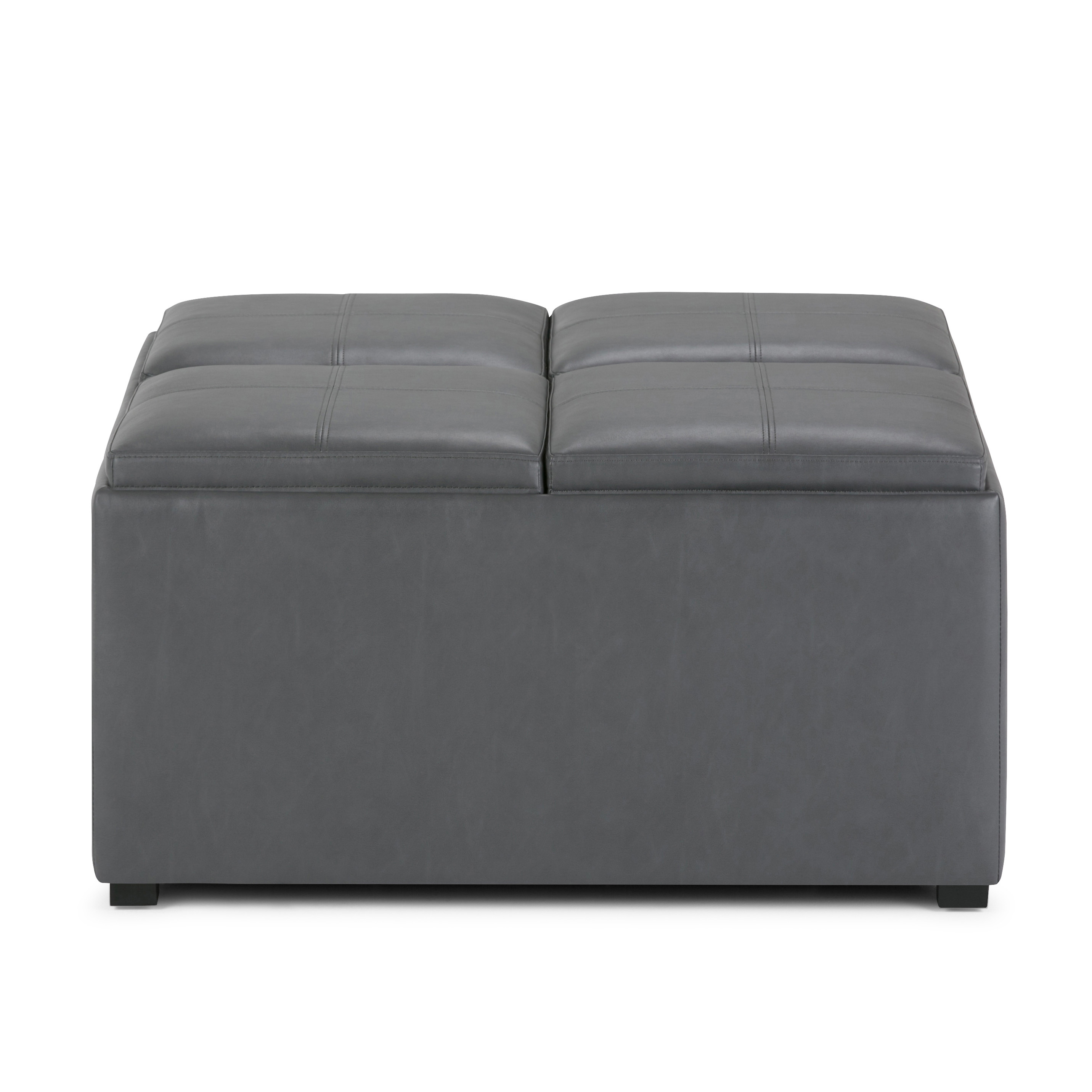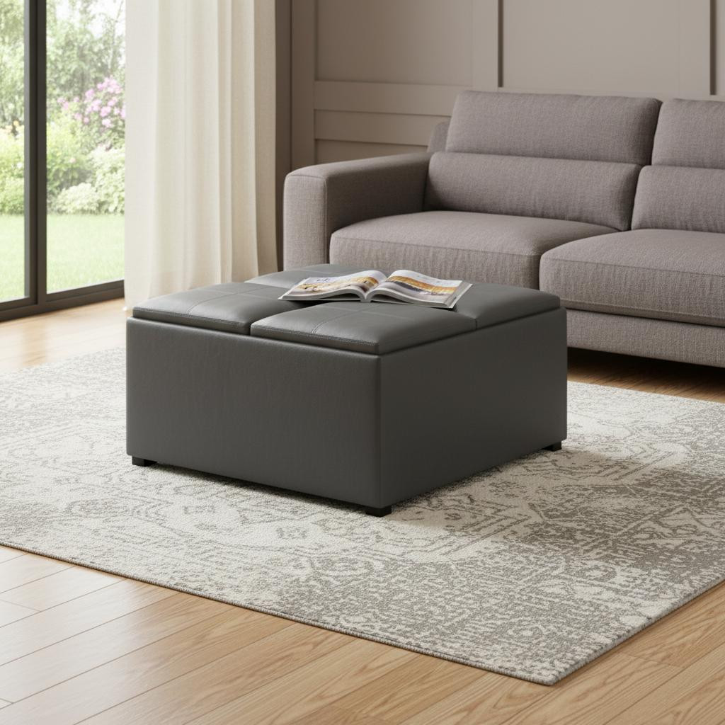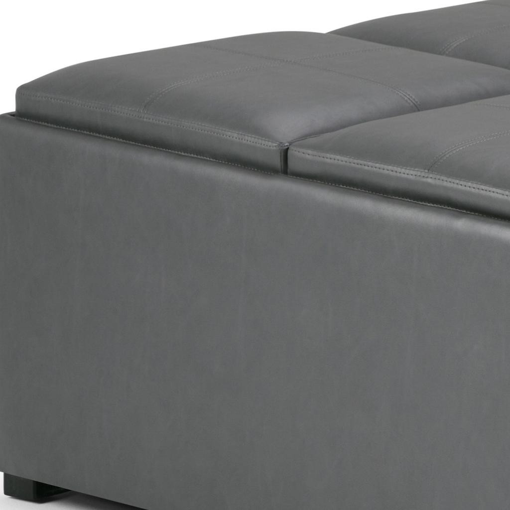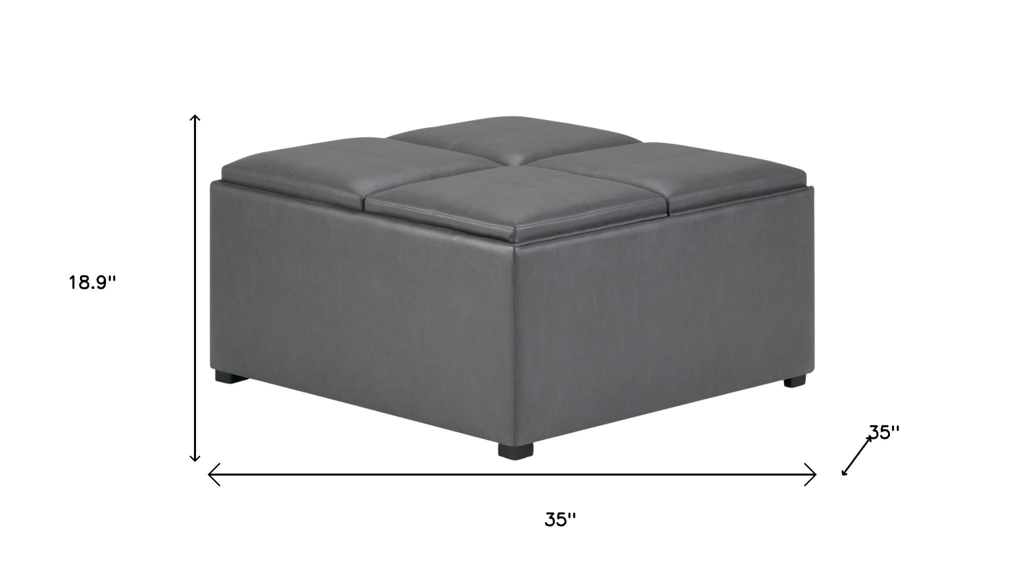 Get ready to relax with this 35-inch gray and dark brown leather cocktail ottoman with storage. This chic cocktail ottoman is larger in size and designed to serve as a make-shift coffee table during parties. The surface is wide and flat which is not only suitable for a footrest or seat but also ready to hold trays of appetizers, drinks, or desserts. The upholstery top of this ottoman is a nice contrast to the upholstery material. Expertly upholstered with padding in a soft solid color leather, this ottoman is as comfortable as it is good looking. This multi-function ottoman features a cubby area in addition to seating to help keep your space neat and tidy. Easy to blend into most any room, a ottoman is a way to add a good looking accent to your space that can also be practical and useful. 18.90-inch h x 35.00-inch w x 35.00-inch d.