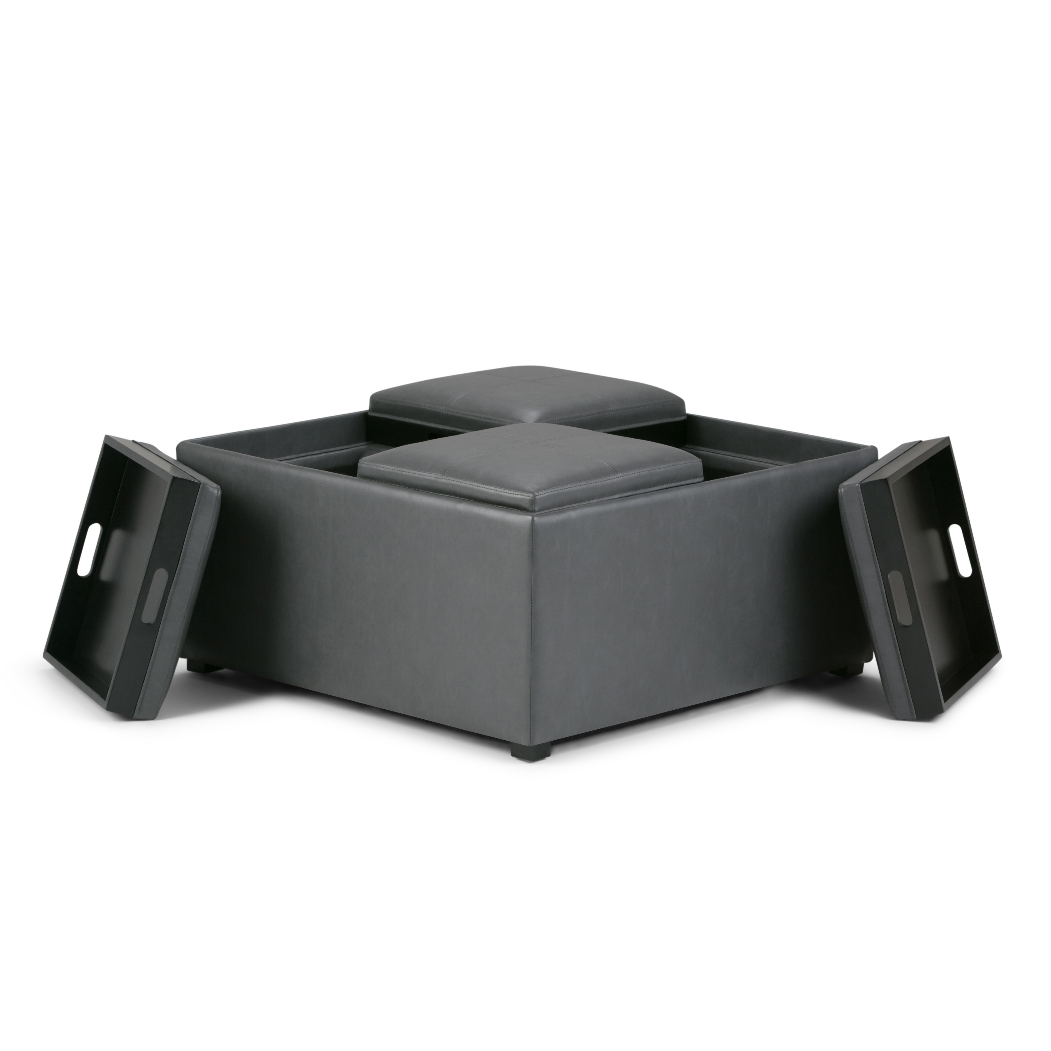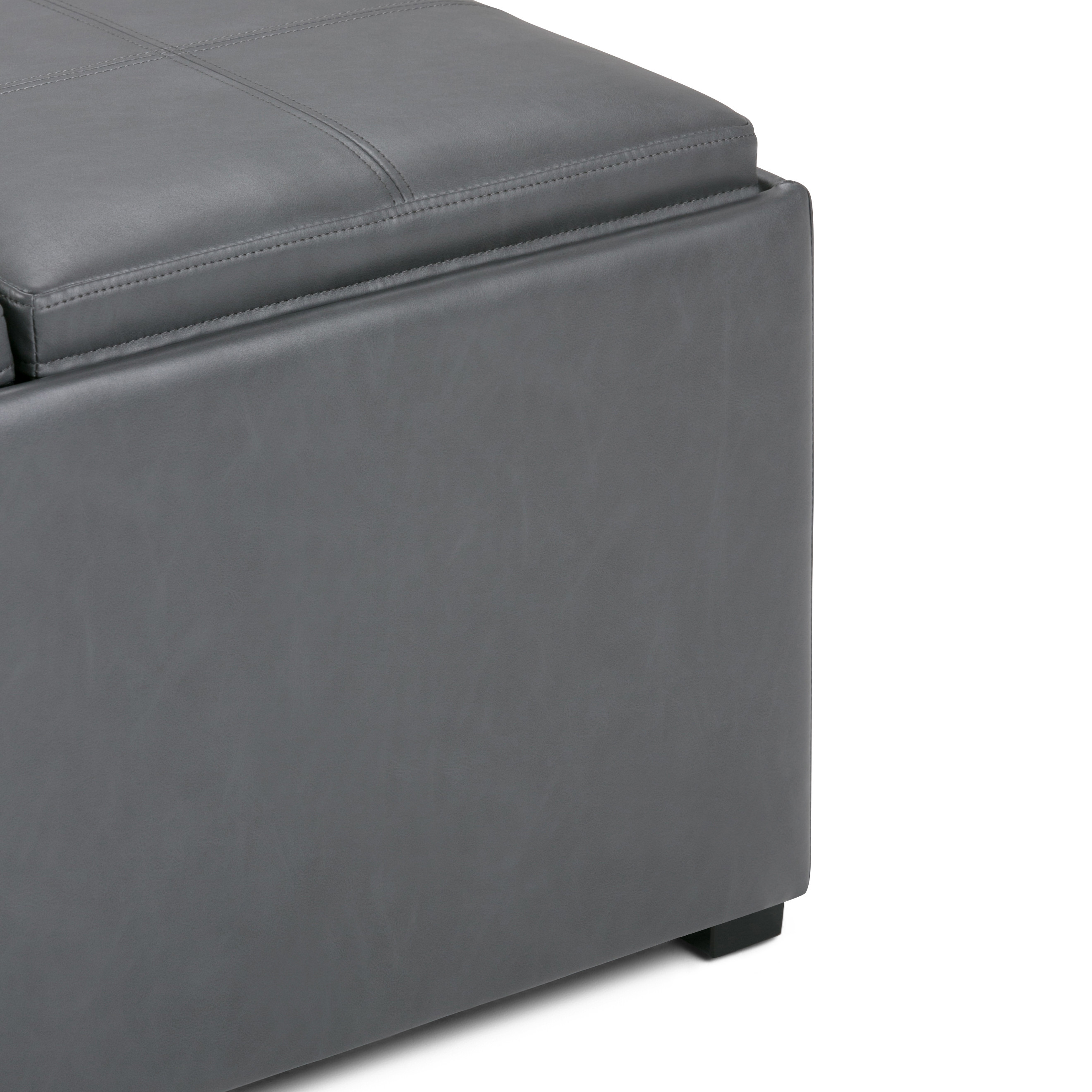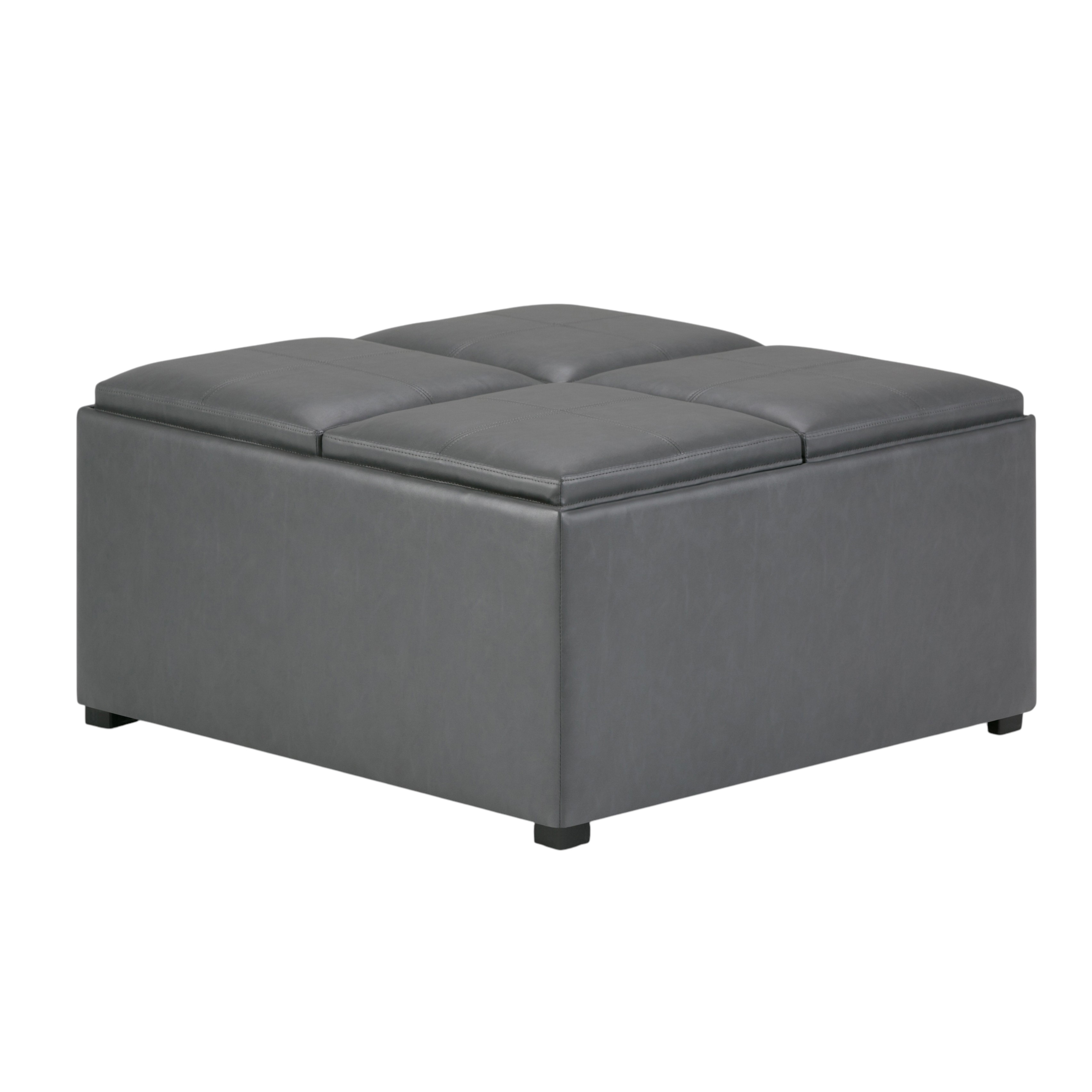Get ready to relax with this 35-inch gray and dark brown leather cocktail ottoman with storage. This chic cocktail ottoman is larger in size and designed to serve as a make-shift coffee table during parties. The surface is wide and flat which is not only suitable for a footrest or seat but also ready to hold trays of appetizers, drinks, or desserts. The upholstery top of this ottoman is a nice contrast to the upholstery material. Expertly upholstered with padding in a soft solid color leather, this ottoman is as comfortable as it is good looking. This multi-function ottoman features a cubby area in addition to seating to help keep your space neat and tidy. Easy to blend into most any room, a ottoman is a way to add a good looking accent to your space that can also be practical and useful. 18.90-inch h x 35.00-inch w x 35.00-inch d.