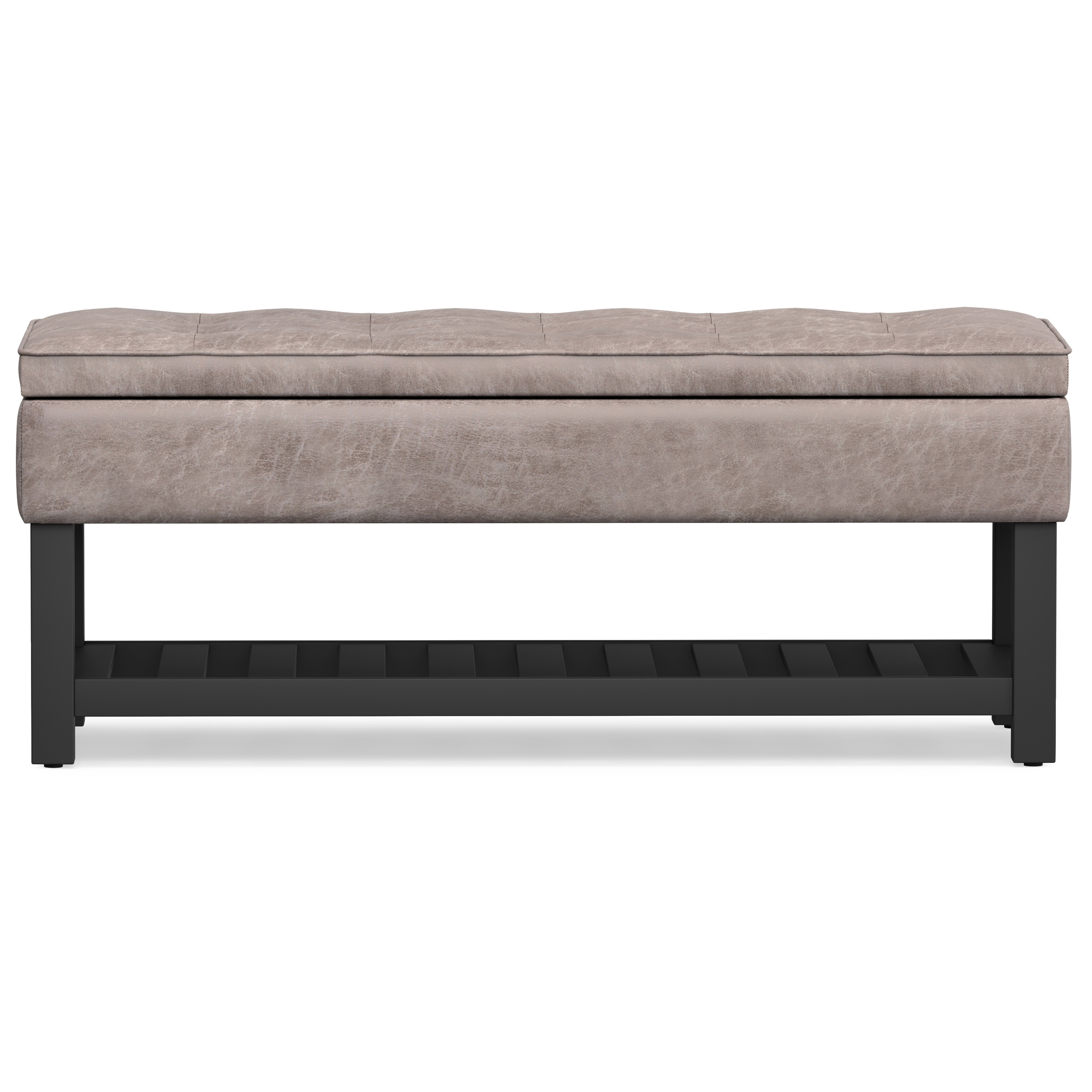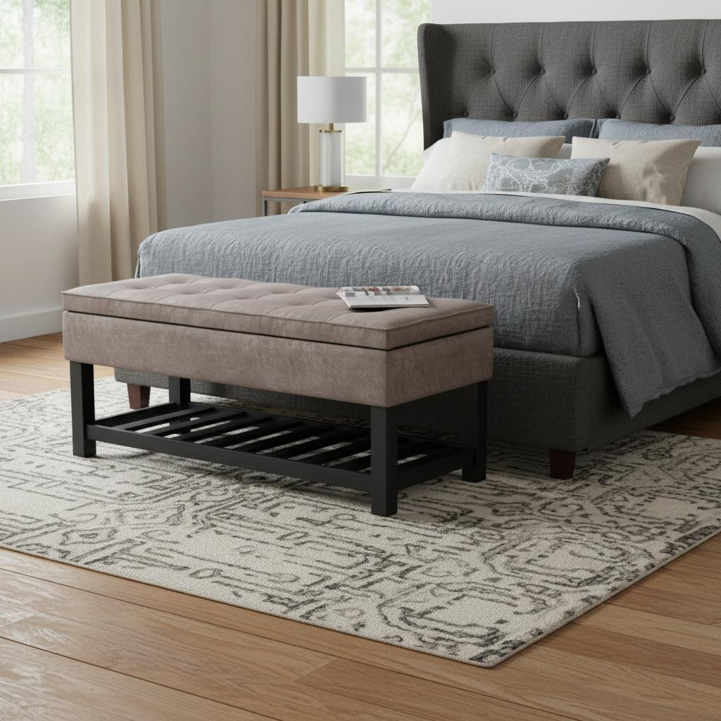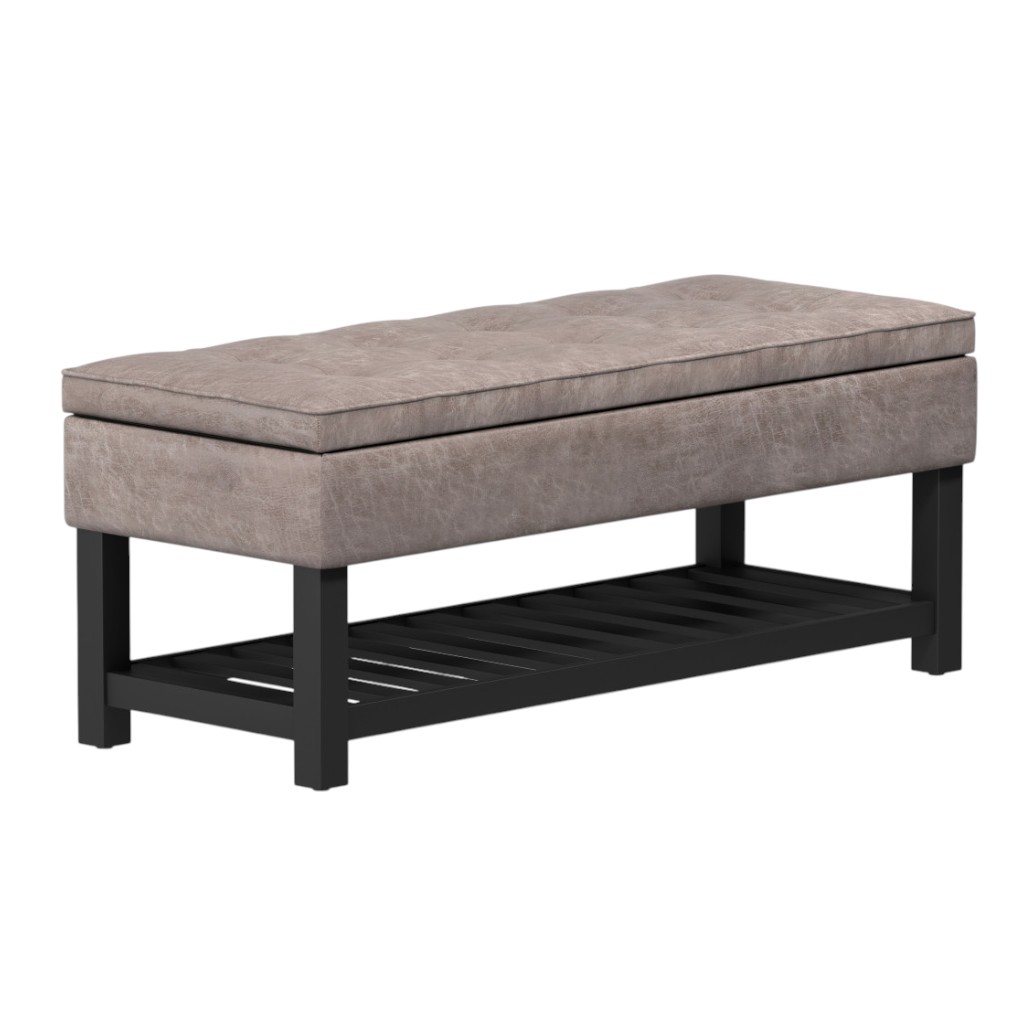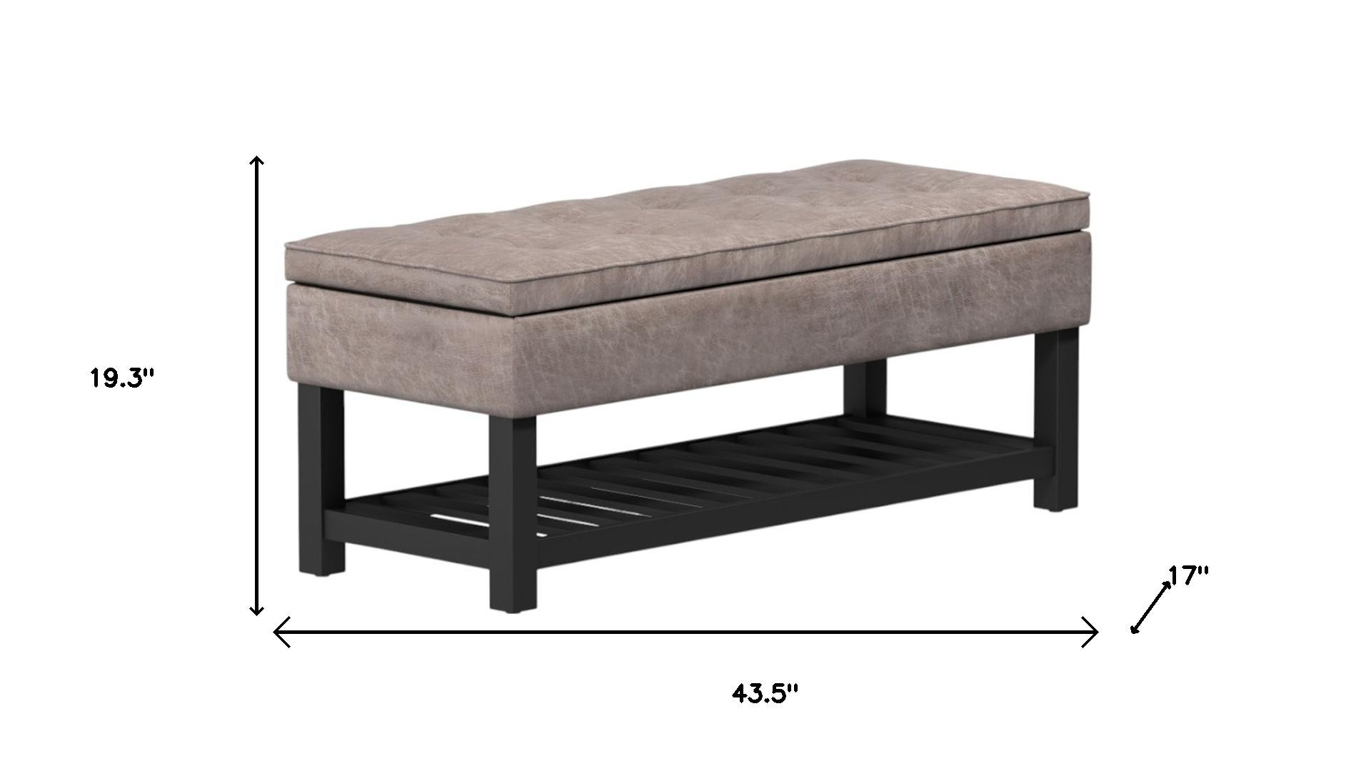 Practicality and fashion mix together with this handy 44-inch gray and dark brown leather ottoman with storage. The upholstery top of this ottoman is a nice contrast to the upholstery material. The purposefully distressed finish gives this versatile ottoman an authentically rustic feel. Expertly upholstered with padding in a soft solid color leather, this ottoman is as comfortable as it is good looking. Ottomans are multi-functional additions to your space that add fashion and practical value. 19.30-inch h x 43.50-inch w x 17.00-inch d.