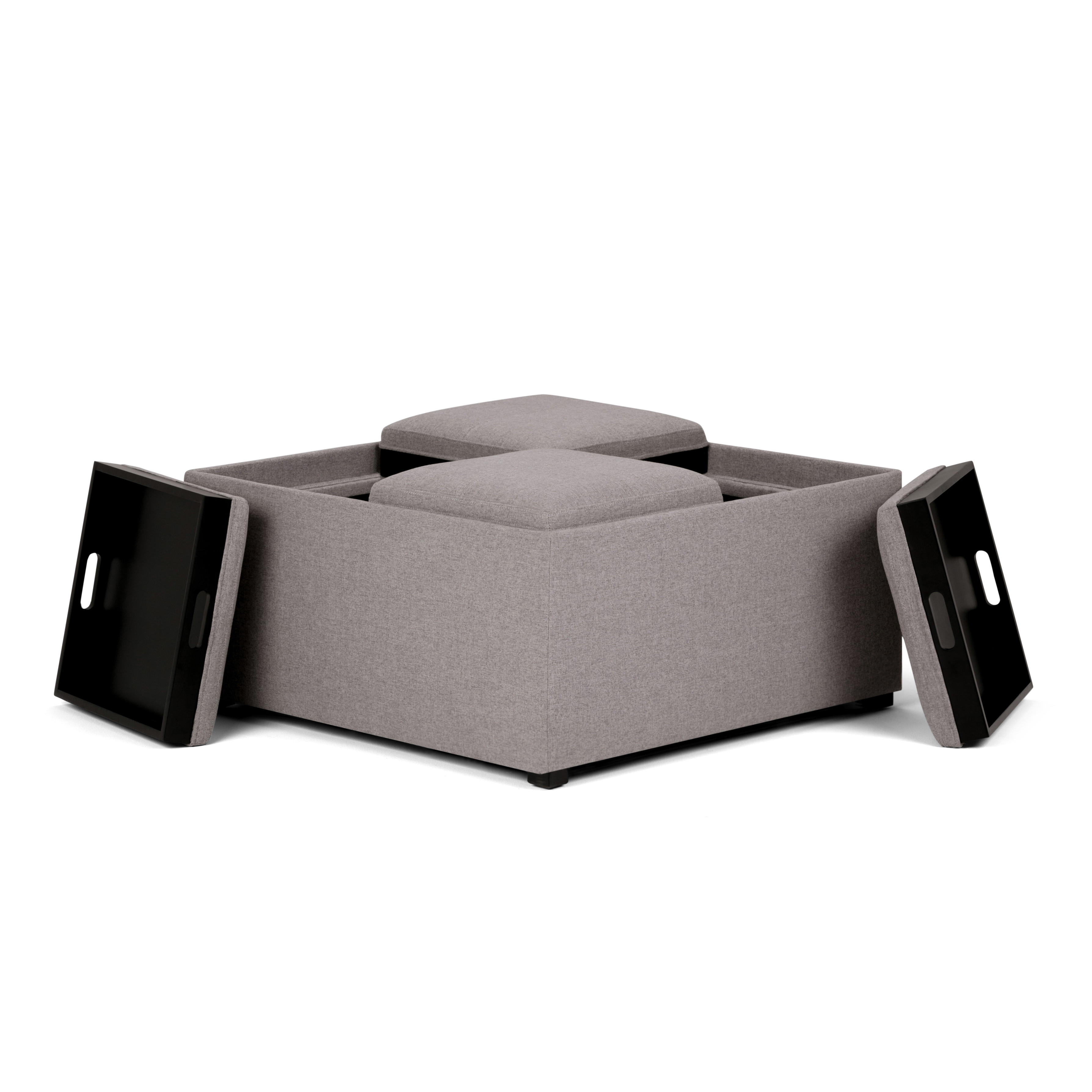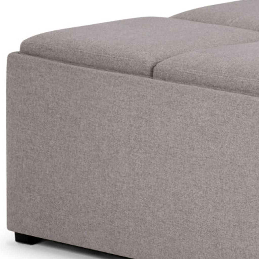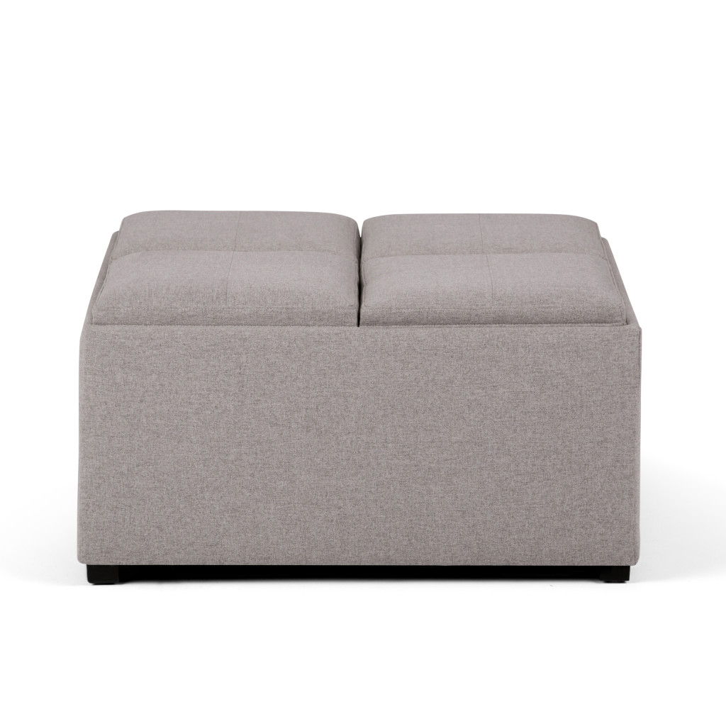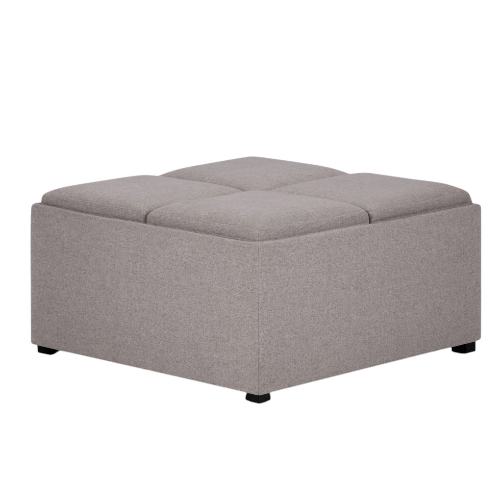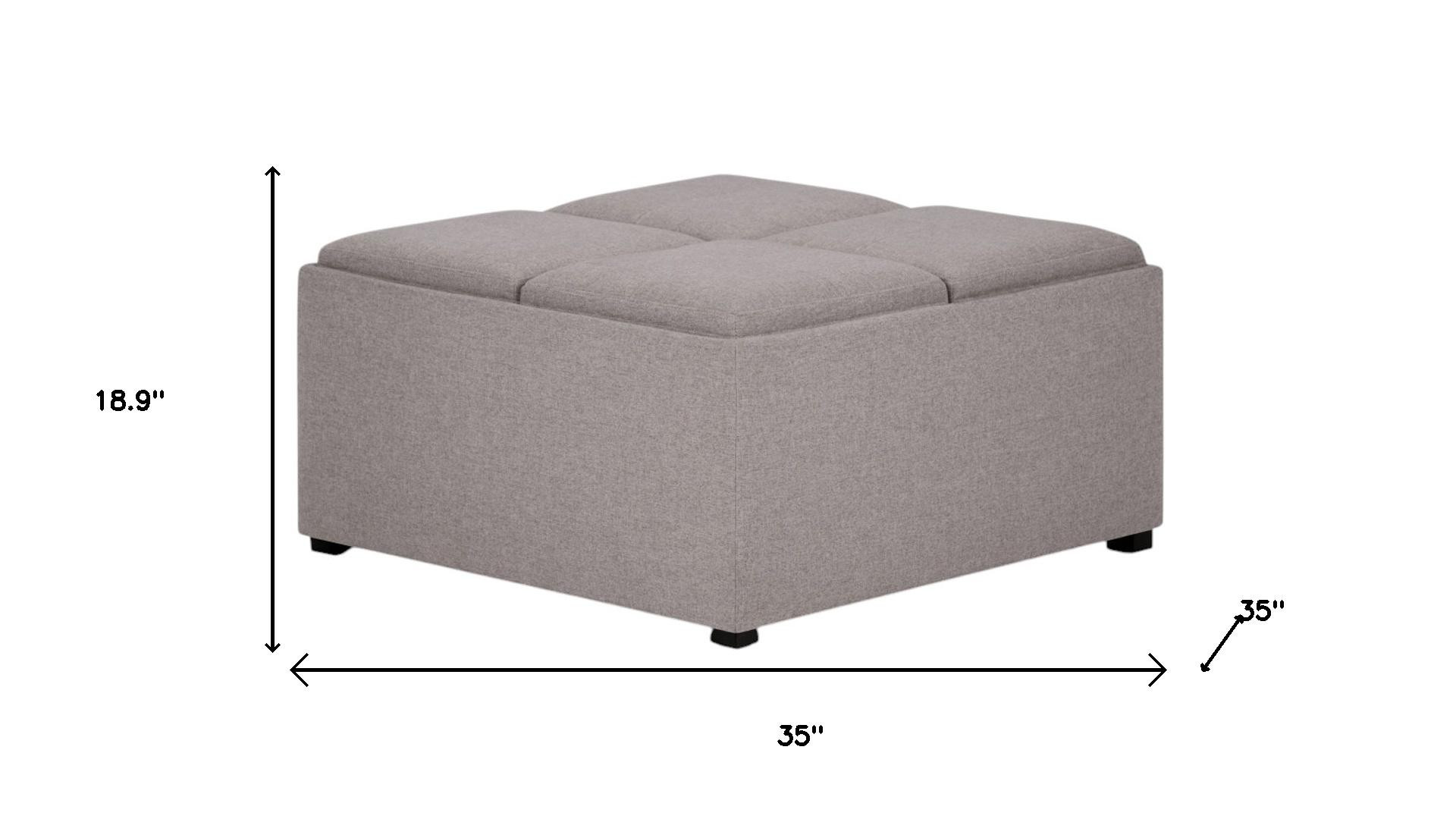 Get ready to relax with this 35-inch gray and dark brown fabric cocktail ottoman with storage. This chic cocktail ottoman is larger in size and designed to serve as a make-shift coffee table during parties. The surface is wide and flat which is not only suitable for a footrest or seat but also ready to hold trays of appetizers, drinks, or desserts. The upholstery top of this ottoman is a nice contrast to the upholstery material. Expertly upholstered with padding in a soft solid color polyester, this ottoman is as comfortable as it is good looking. This multi-function ottoman features a cubby area in addition to seating to help keep your space neat and tidy. Ottomans are multi-functional additions to your space that add fashion and practical value. 18.90-inch h x 35.00-inch w x 35.00-inch d.