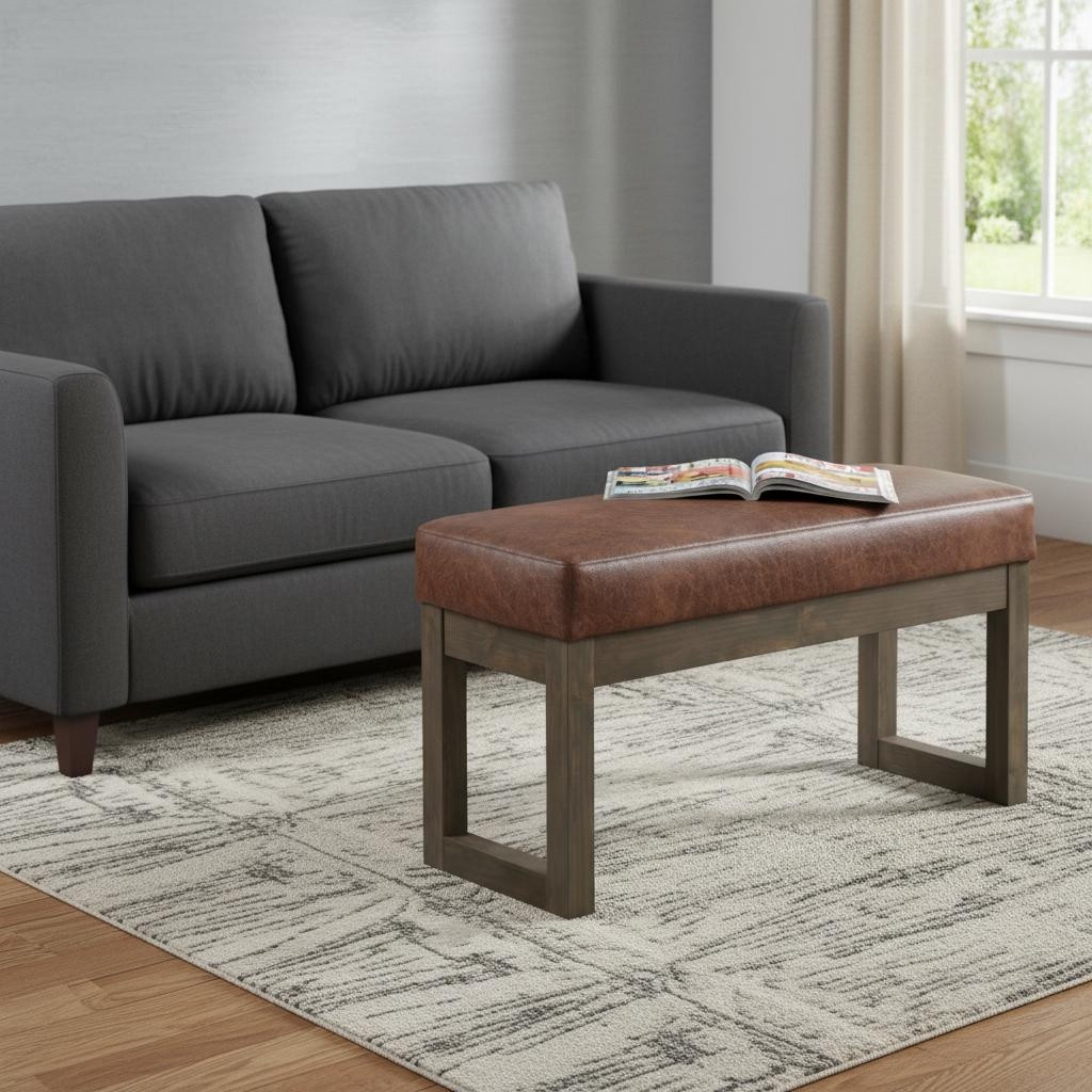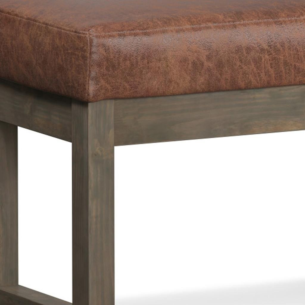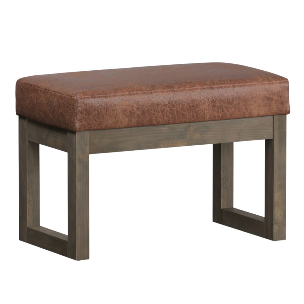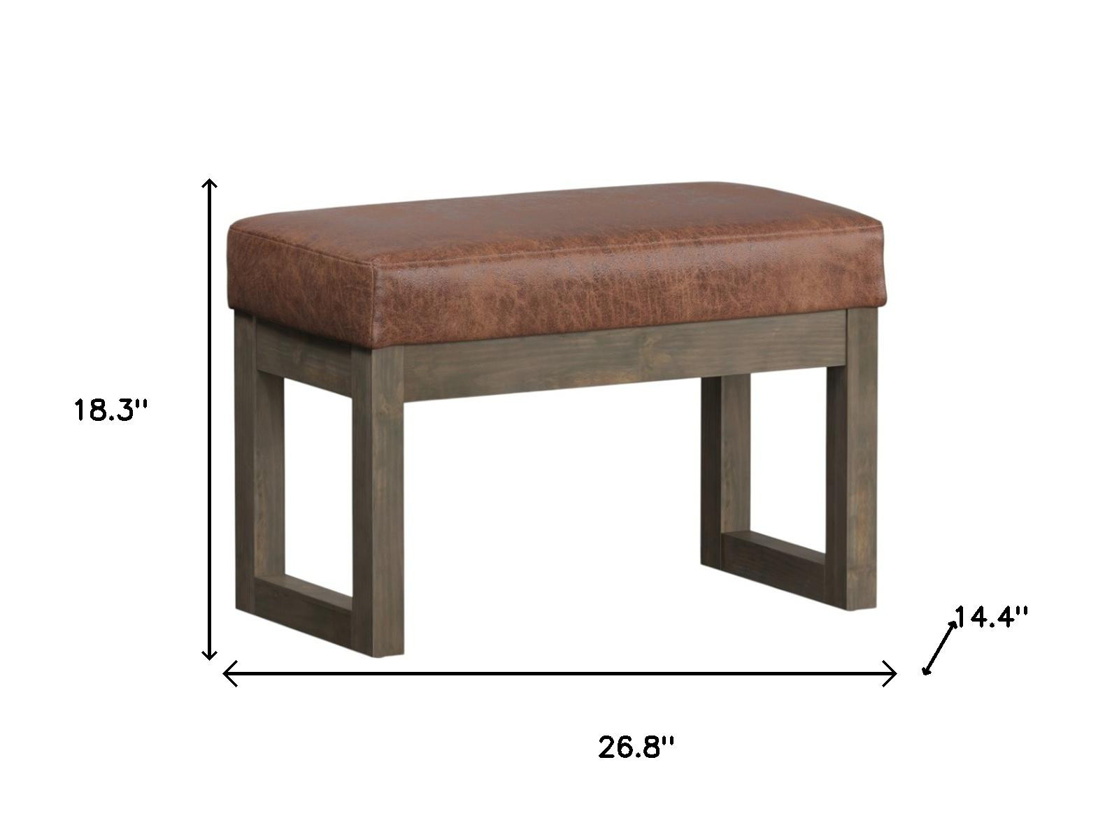 Optimize your space and add some charm to your room with the 27-inch brown leather footstool. This footstool is a treasure at the end of the day as an ideal place to rest your feet and legs and can also be used for extra seating when needed in a pinch. The upholstery top of this ottoman is a nice contrast to the upholstery material. A solid brown pine frame is finished off with a matching brown upholstery seat, giving this ottoman a chic monotone look. Complete with a purposefully distressed finish, this ottoman has an aged, vintage, and rustic feel. Expertly upholstered with padding in a soft solid color leather, this ottoman is as comfortable as it is good looking. Ottomans are multi-functional additions to your space that add fashion and practical value. 18.30-inch h x 26.80-inch w x 14.40-inch d.