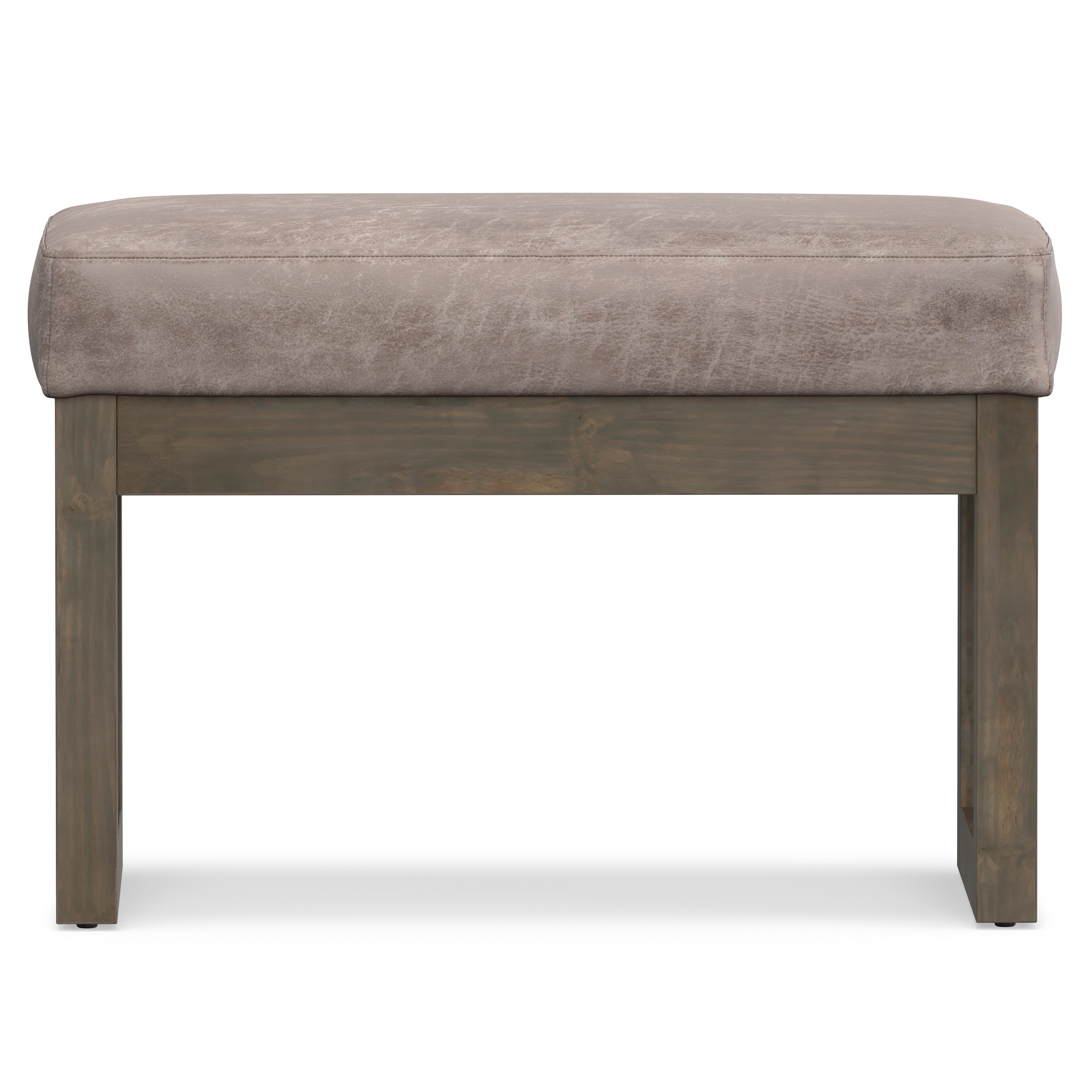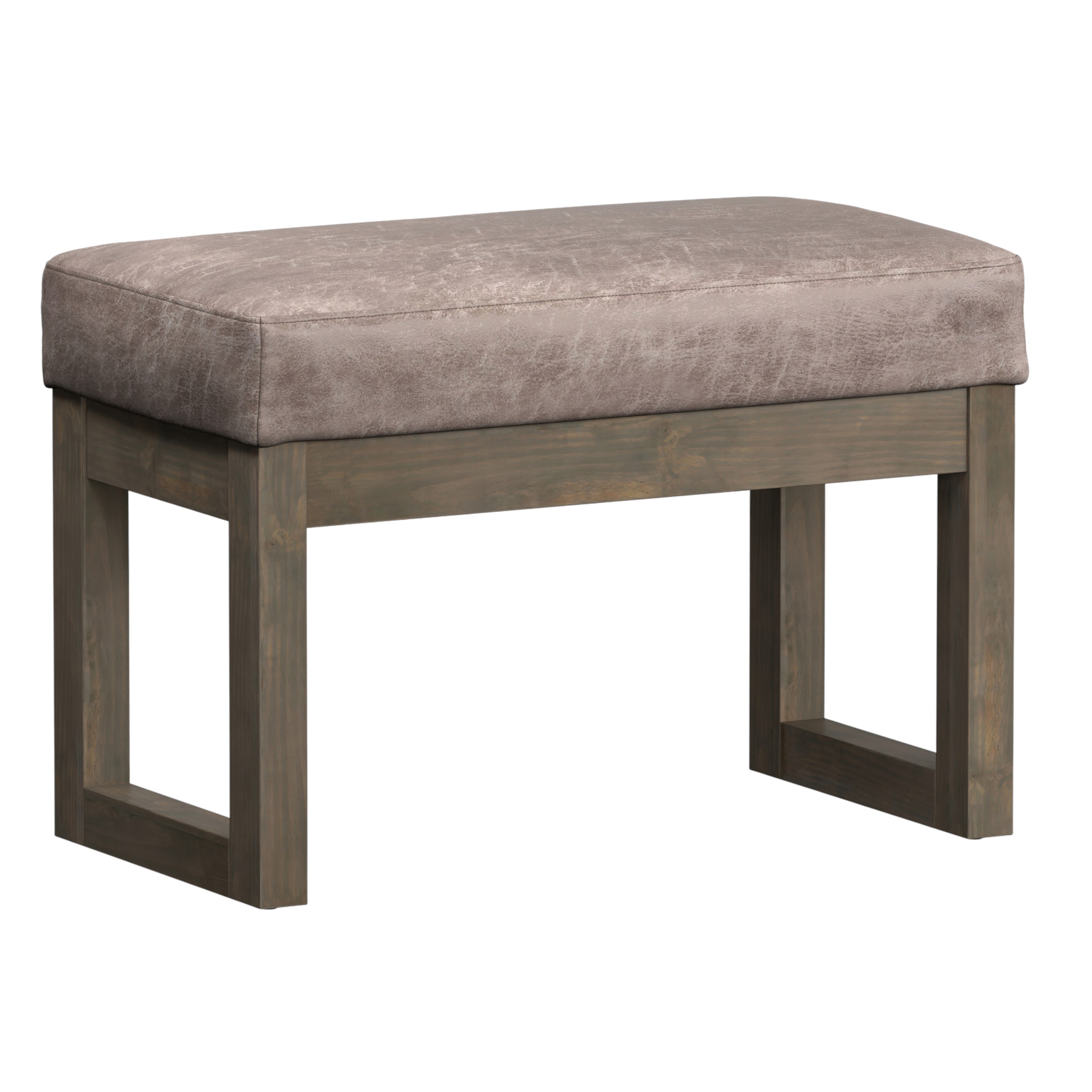 Practicality and fashion mix together with this handy 27-inch gray and dark brown leather footstool. This footstool is a treasure at the end of the day as an ideal place to rest your feet and legs and can also be used for extra seating when needed in a pinch. The upholstery top of this ottoman is a nice contrast to the upholstery material. The purposefully distressed finish gives this versatile ottoman an authentically rustic feel. Expertly upholstered with padding in a soft solid color leather, this ottoman is as comfortable as it is good looking. Easy to blend into most any room, a ottoman is a way to add a good looking accent to your space that can also be practical and useful. 18.30-inch h x 26.80-inch w x 14.40-inch d.