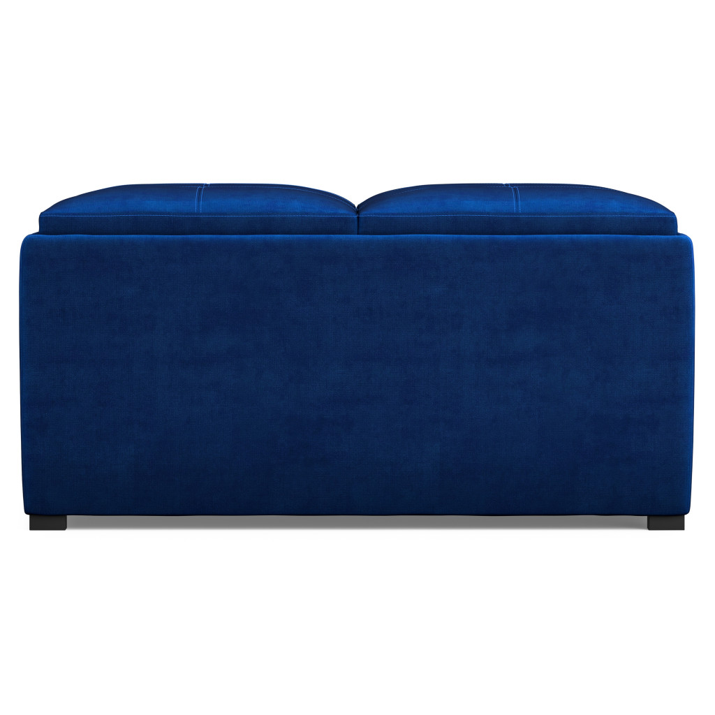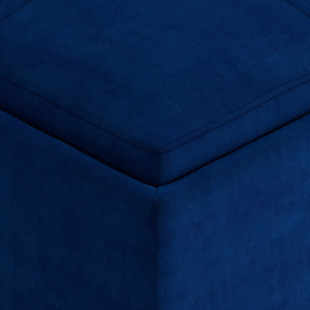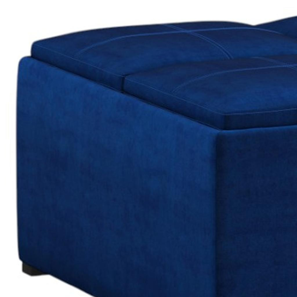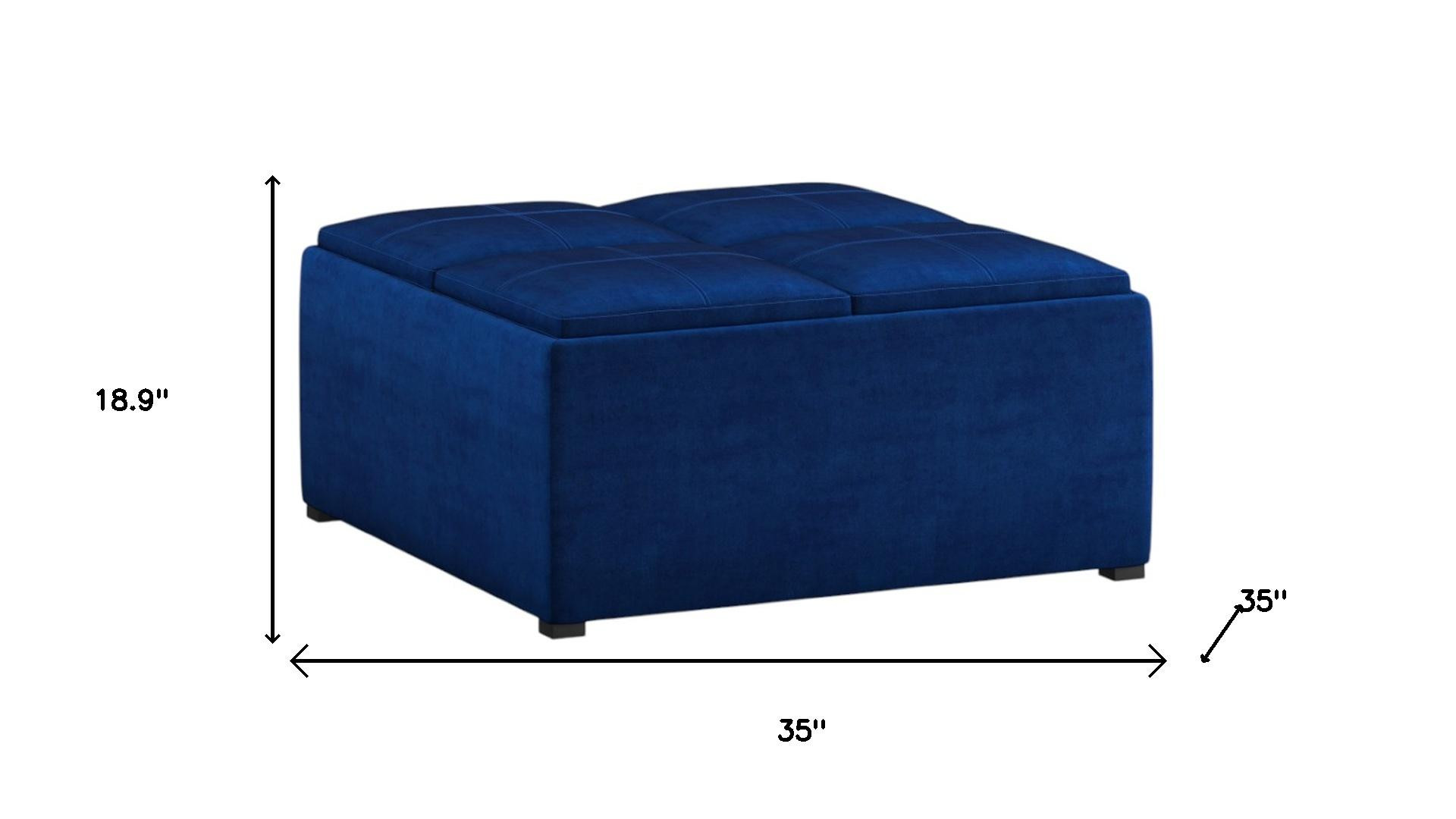 Optimize your space and add some charm to your room with the 35-inch blue and black velvet cocktail ottoman with storage. This chic cocktail ottoman is larger in size and designed to serve as a make-shift coffee table during parties. The surface is wide and flat which is not only suitable for a footrest or seat but also ready to hold trays of appetizers, drinks, or desserts. The upholstery top of this ottoman is a nice contrast to the upholstery material. Expertly upholstered with padding in a soft solid color velvet, this ottoman is as comfortable as it is good looking. This multi-function ottoman features a cubby area in addition to seating to help keep your space neat and tidy. Ottomans are multi-functional additions to your space that add fashion and practical value. 18.90-inch h x 35.00-inch w x 35.00-inch d.