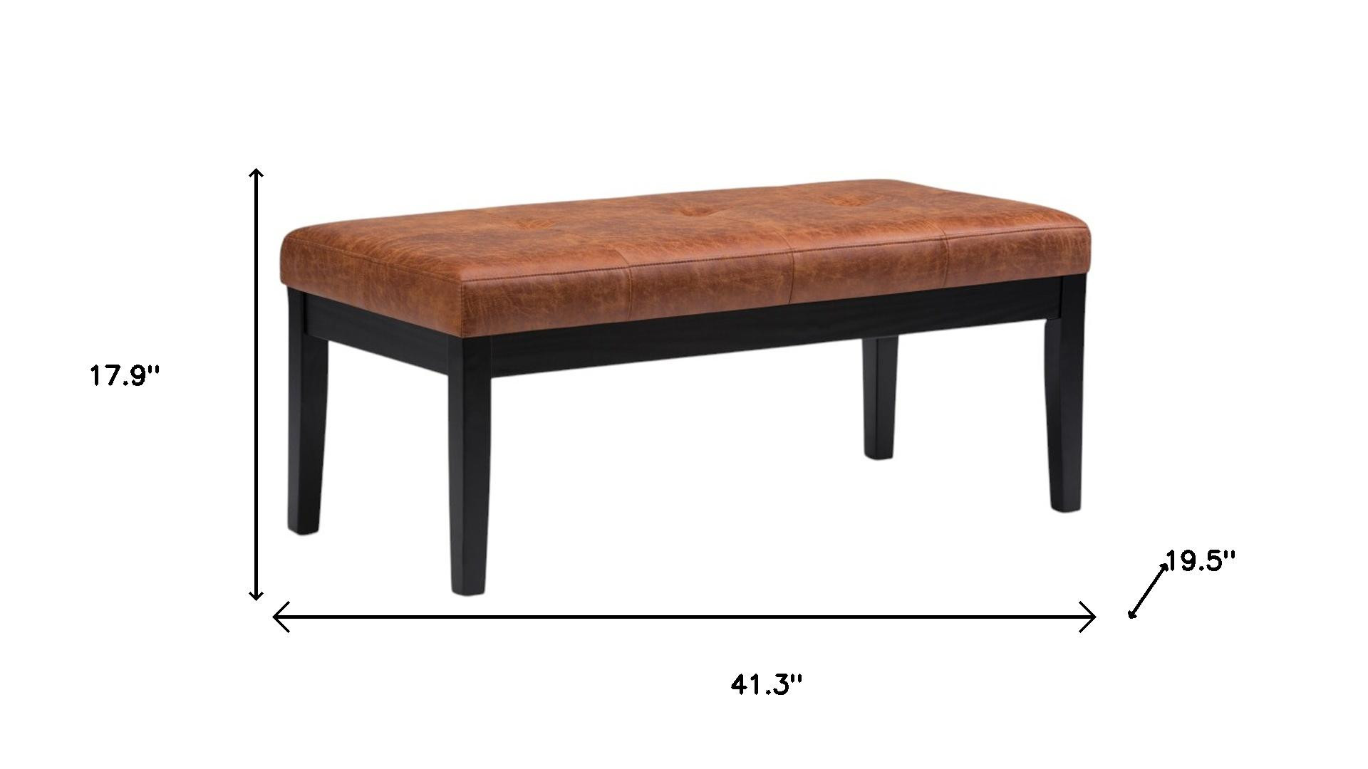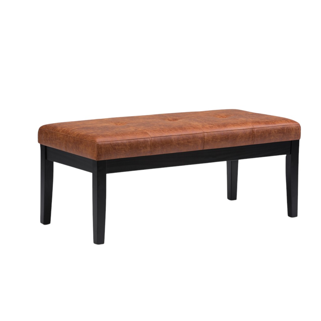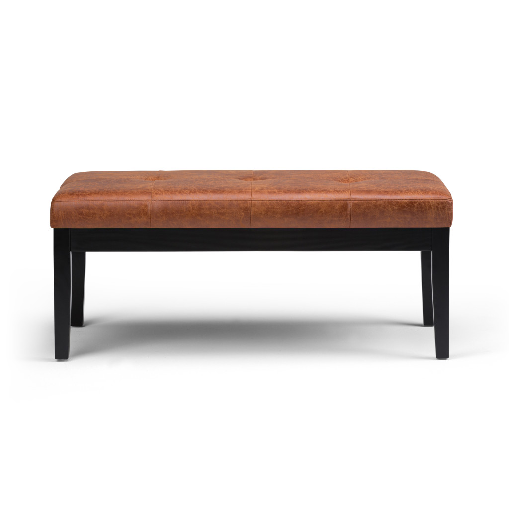 Add a good looking decorative accent to your space that is also practical for seating. The upholstery top of this ottoman is a nice contrast to the upholstery material. Complete with a purposefully distressed finish, this ottoman has an aged, vintage, and rustic feel. Expertly upholstered with padding in a soft solid color leather, this ottoman is as comfortable as it is good looking. Ottomans are multi-functional additions to your space that add fashion and practical value. 17.90-inch h x 41.30-inch w x 19.50-inch d.