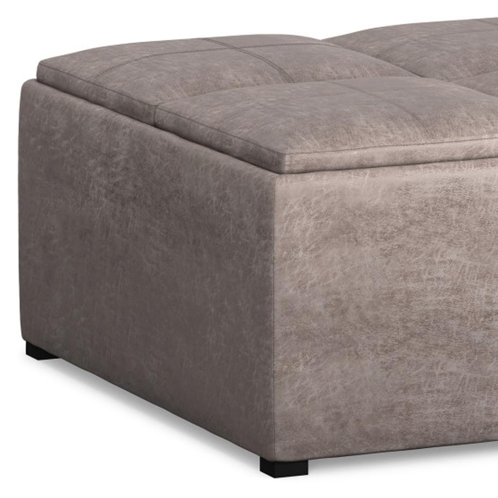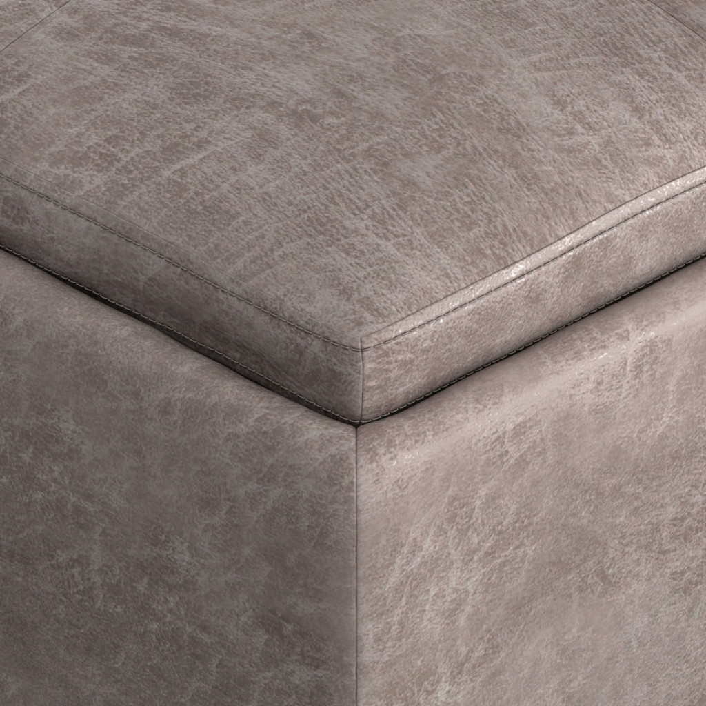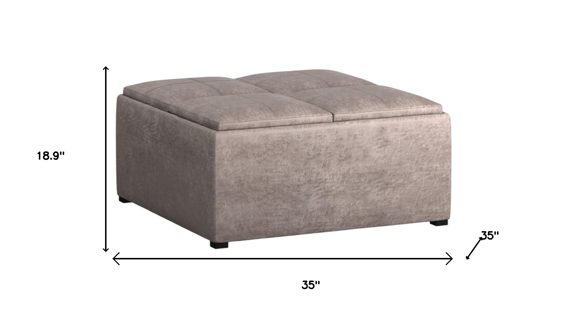Practicality and fashion mix together with this handy 35-inch gray and black leather cocktail ottoman with storage. This chic cocktail ottoman is larger in size and designed to serve as a make-shift coffee table during parties. The surface is wide and flat which is not only suitable for a footrest or seat but also ready to hold trays of appetizers, drinks, or desserts. The upholstery top of this ottoman is a nice contrast to the upholstery material. The purposefully distressed finish gives this versatile ottoman an authentically rustic feel. Expertly upholstered with padding in a soft solid color leather, this ottoman is as comfortable as it is good looking. This multi-function ottoman features a cubby area in addition to seating to help keep your space neat and tidy. Easy to blend into most any room, a ottoman is a way to add a good looking accent to your space that can also be practical and useful. 18.90-inch h x 35.00-inch w x 35.00-inch d.