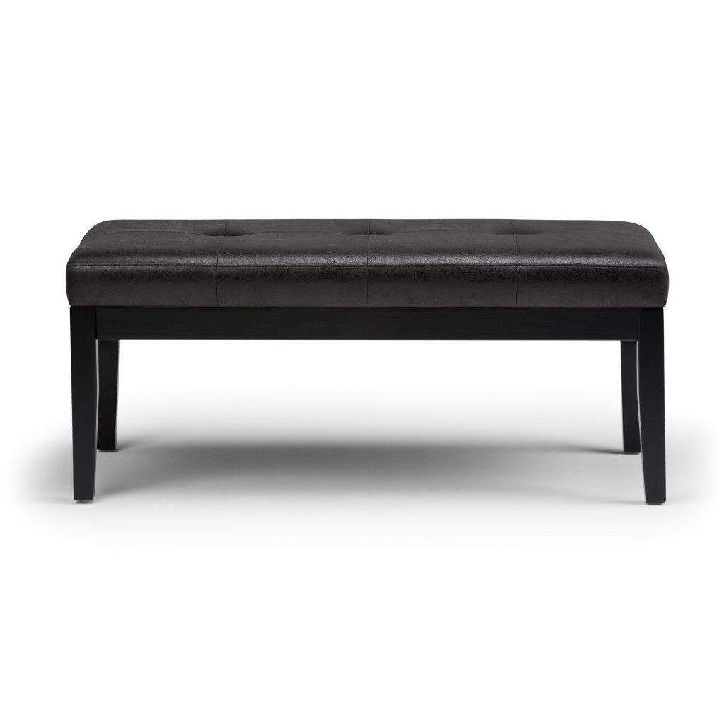 Add a good looking decorative accent to your space that is also practical for seating. The upholstery top of this ottoman is a nice contrast to the upholstery material. Complete with a purposefully distressed finish, this ottoman has an aged, vintage, and rustic feel. Expertly upholstered with padding in a soft solid color leather, this ottoman is as comfortable as it is good looking. Easy to blend into most any room, a ottoman is a way to add a good looking accent to your space that can also be practical and useful. 17.90-inch h x 41.30-inch w x 19.50-inch d.