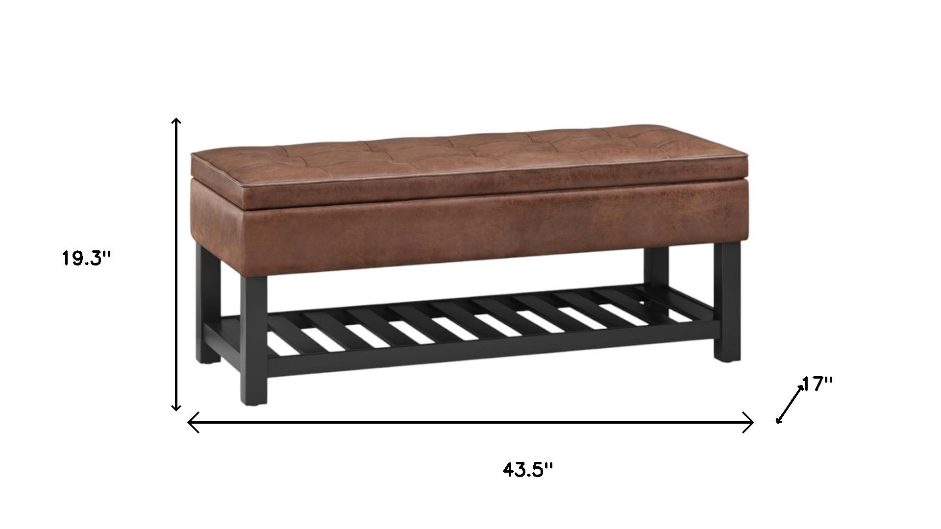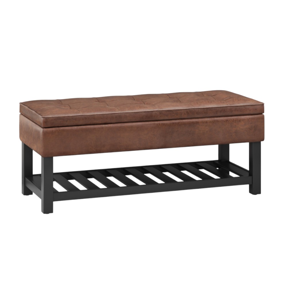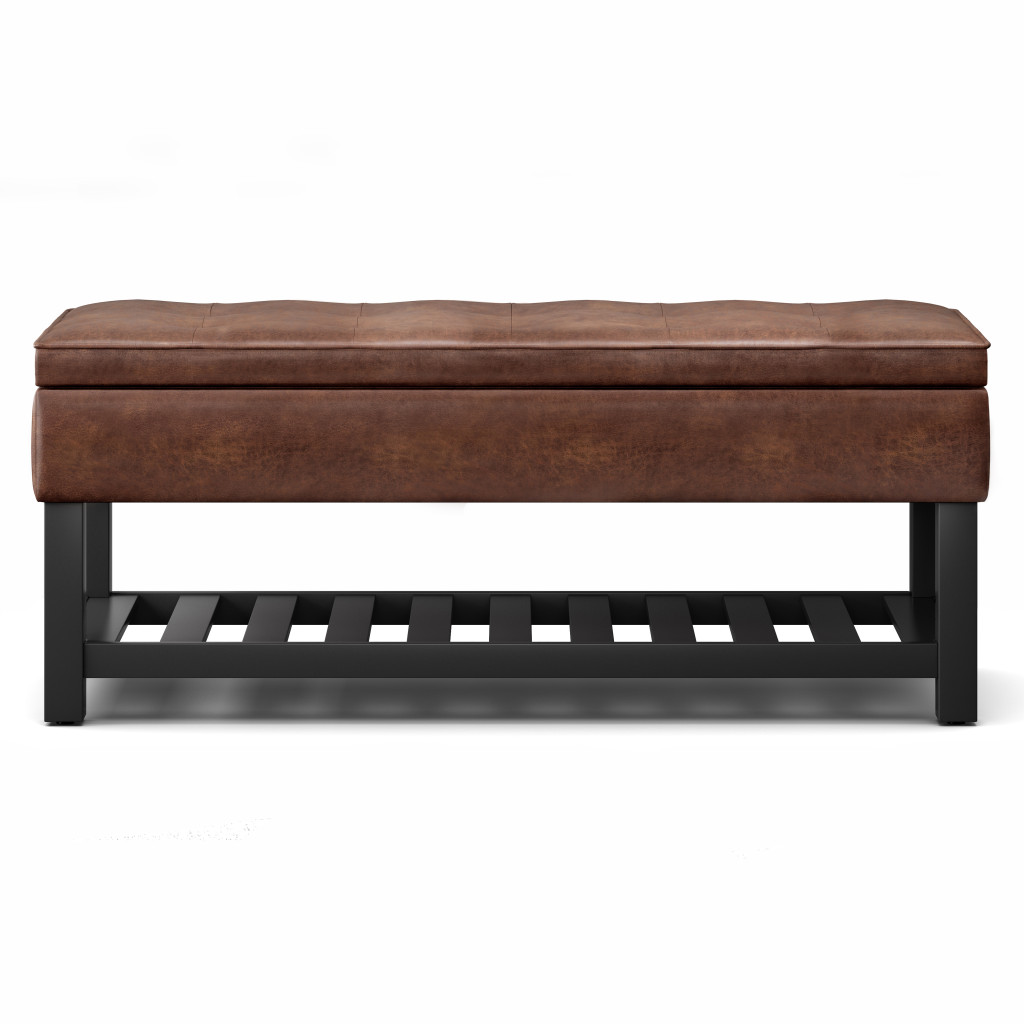 Add a good looking decorative accent to your space that is also practical for seating. The upholstery top of this ottoman is a nice contrast to the upholstery material. The purposefully distressed finish gives this versatile ottoman an authentically rustic feel. Expertly upholstered with padding in a soft solid color leather, this ottoman is as comfortable as it is good looking. Ottomans are multi-functional additions to your space that add fashion and practical value. 19.30-inch h x 43.50-inch w x 17.00-inch d.