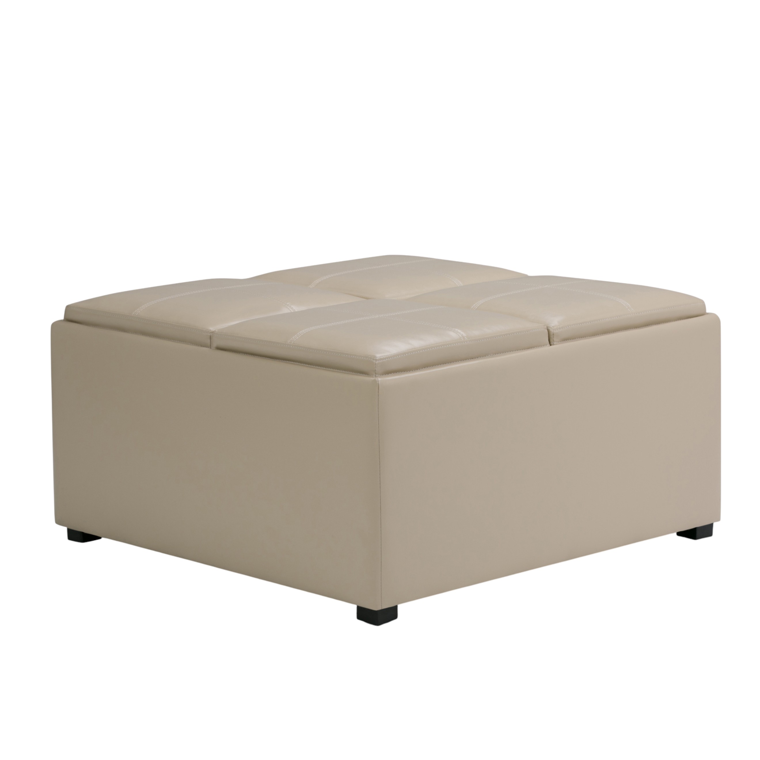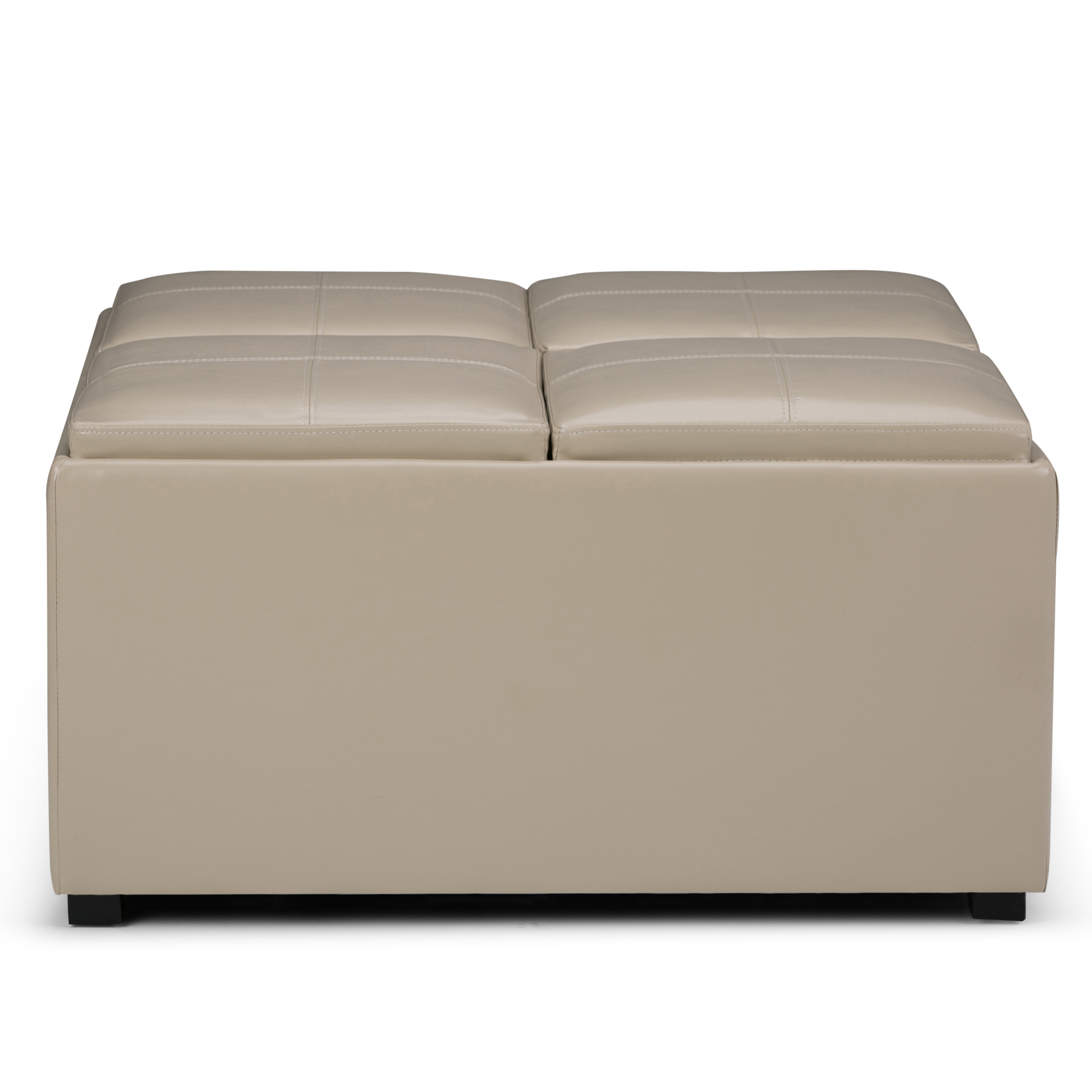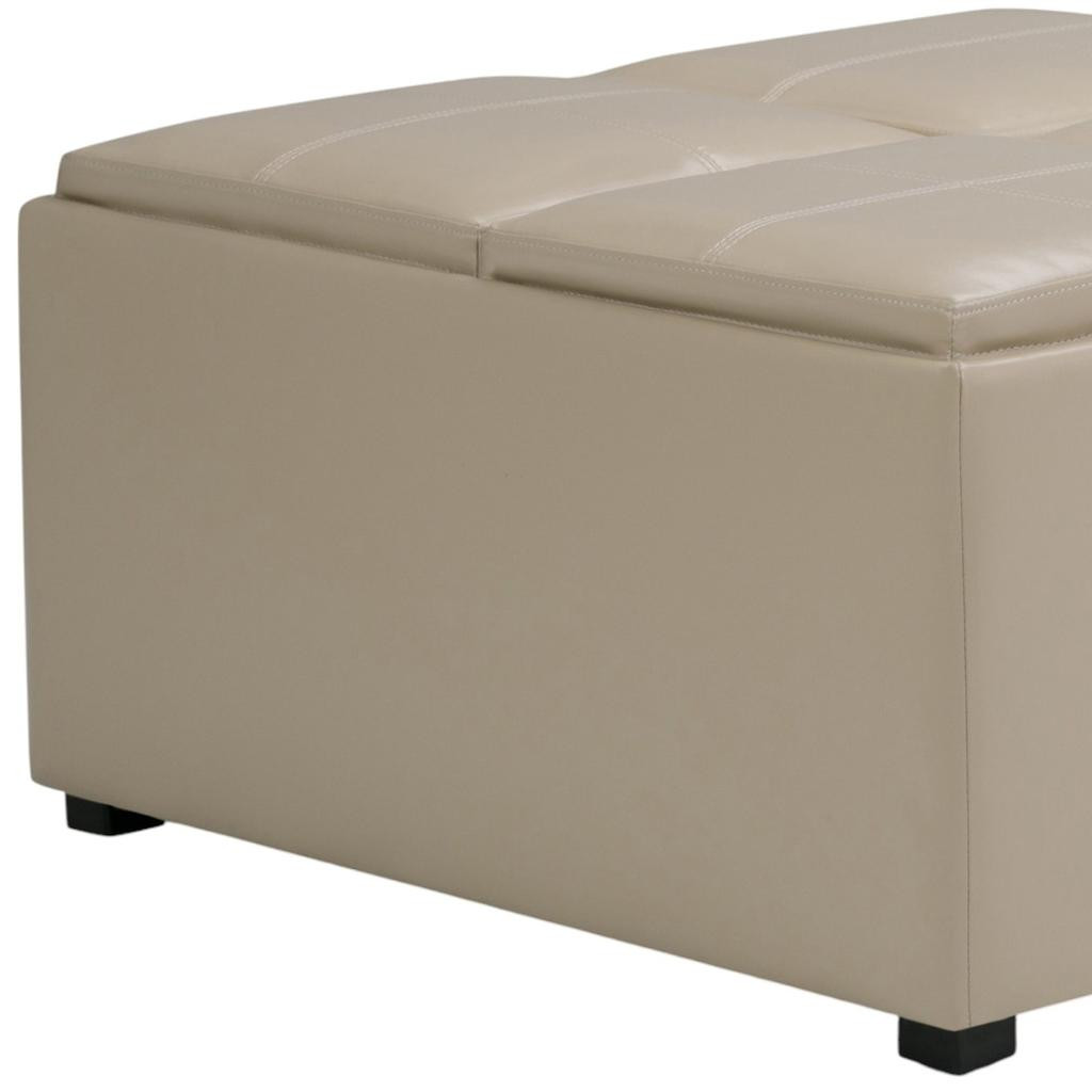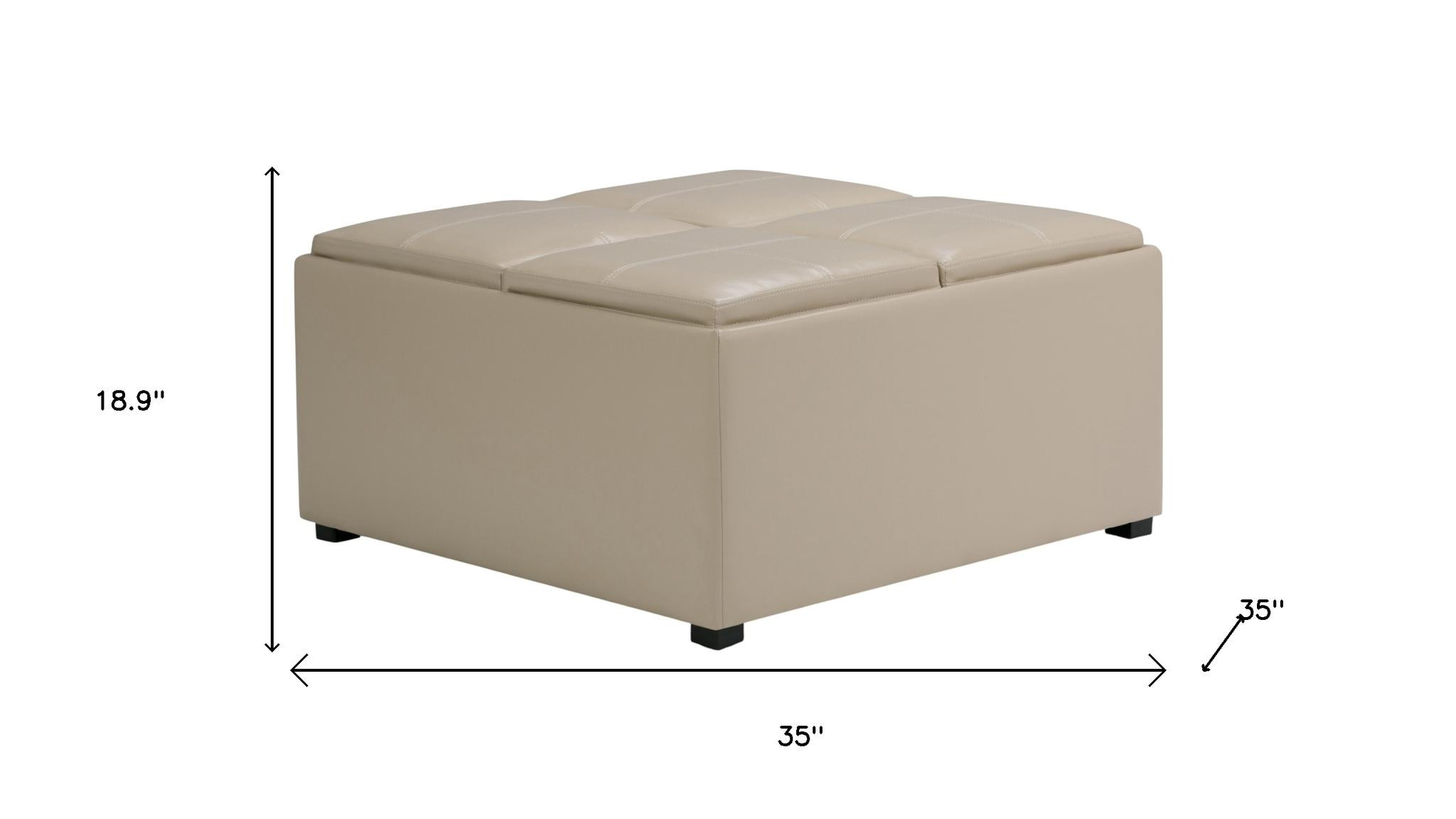 Add a good looking decorative accent to your space that is also practical for seating. This chic cocktail ottoman is larger in size and designed to serve as a make-shift coffee table during parties. The surface is wide and flat which is not only suitable for a footrest or seat but also ready to hold trays of appetizers, drinks, or desserts. The upholstery top of this ottoman is a nice contrast to the upholstery material. Expertly upholstered with padding in a soft solid color leather, this ottoman is as comfortable as it is good looking. This multi-function ottoman features a cubby area in addition to seating to help keep your space neat and tidy. Easy to blend into most any room, a ottoman is a way to add a good looking accent to your space that can also be practical and useful. 18.90-inch h x 35.00-inch w x 35.00-inch d.