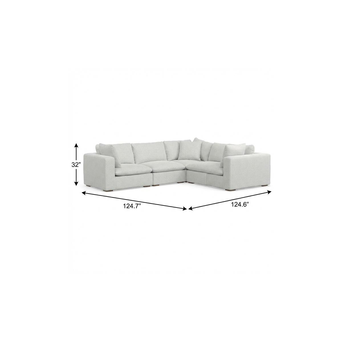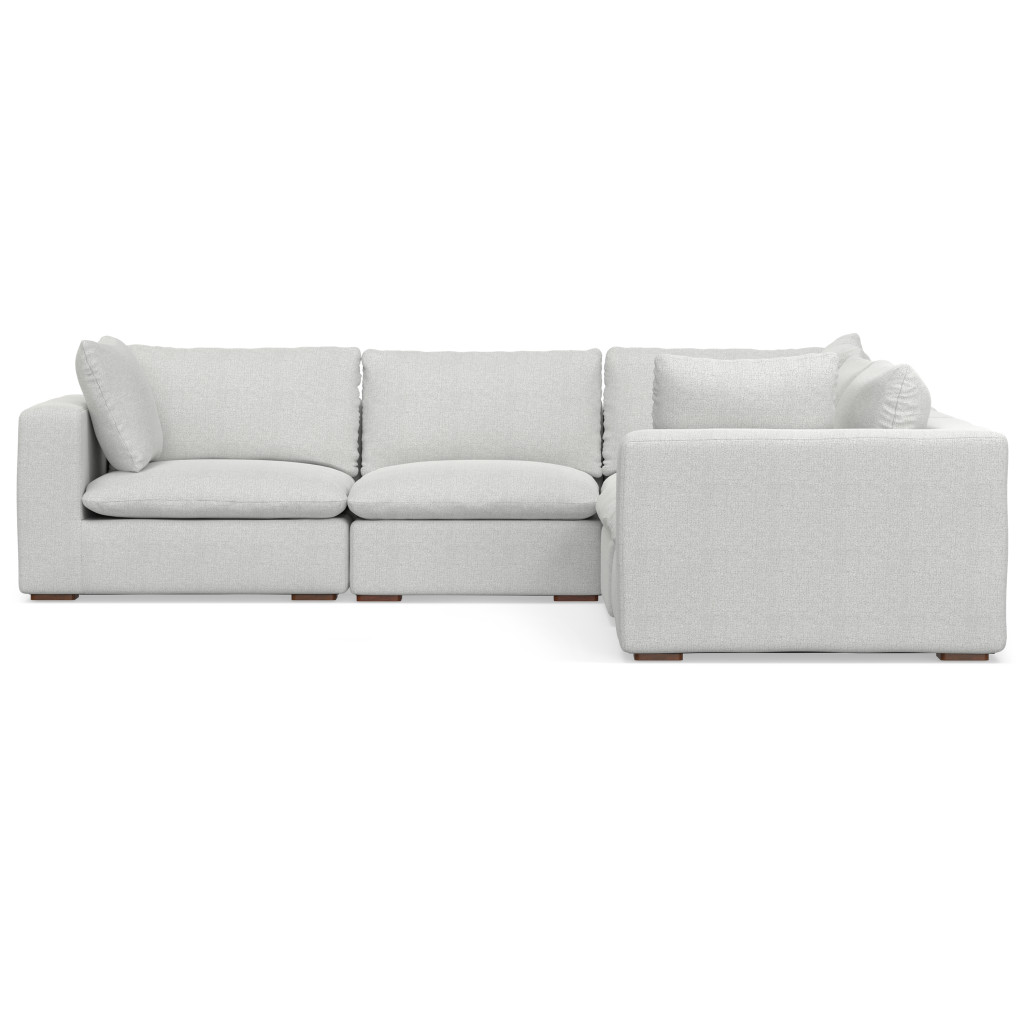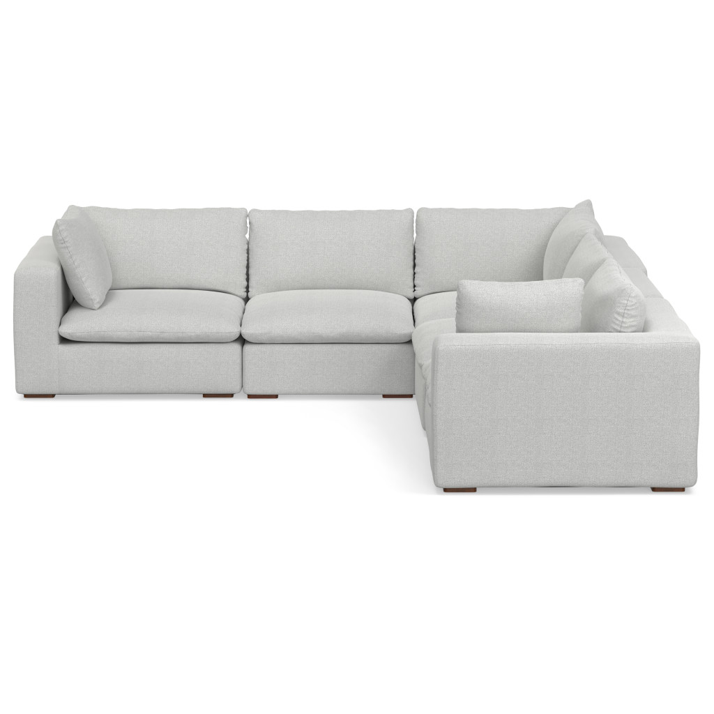 Add an air of fashion to your space with this fabulous 125-inch gray fabric modular sofa with brown legs. Solid colors give you lots of decorative options and are easy to work into your decor scheme. Web suspension construction gives this piece strong support and makes it comfortable to sit even for long periods of time. Removable back cushions make this sofa easy to manage. Fixed arms offer a comfy place to rest. A great showpiece for your room, this sofa is a must have. 32.00-inch h x 124.70-inch w x 124.60-inch d.